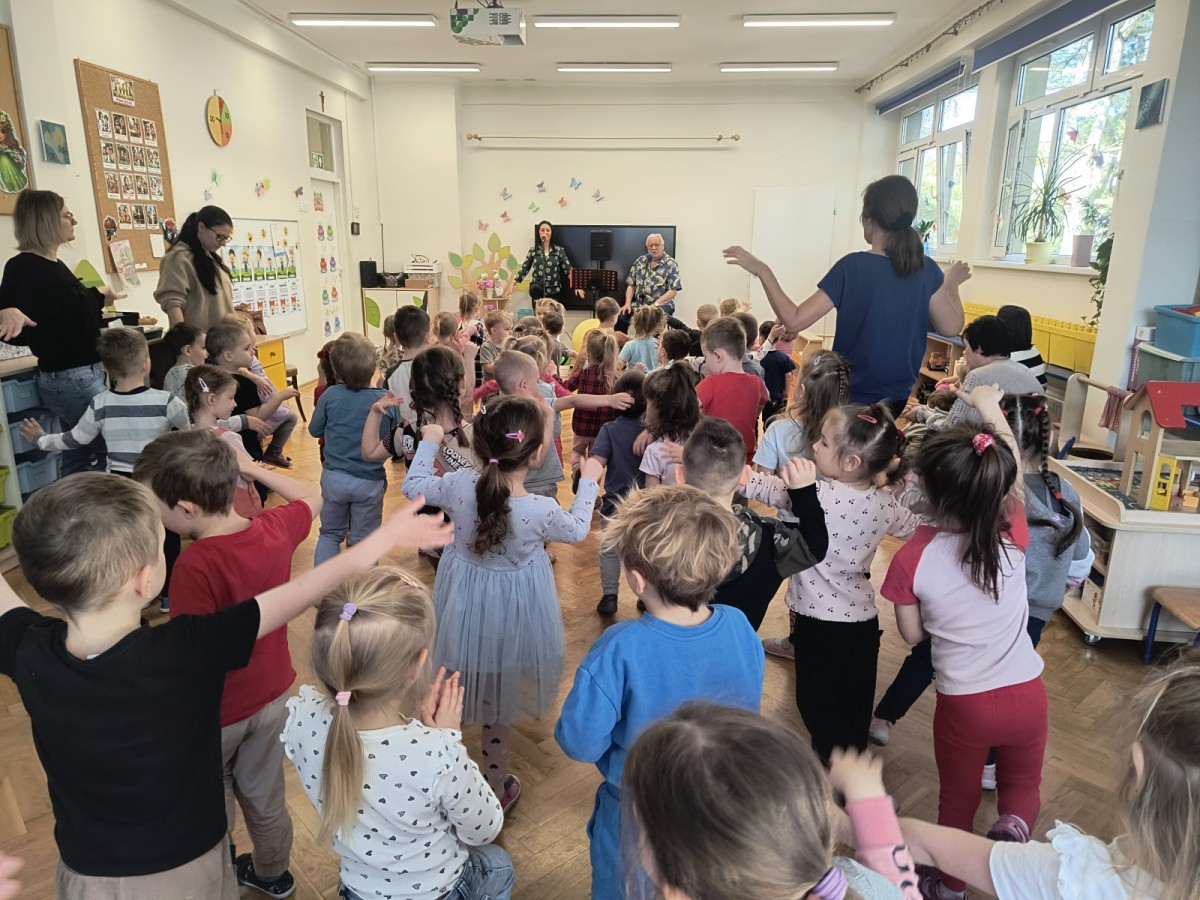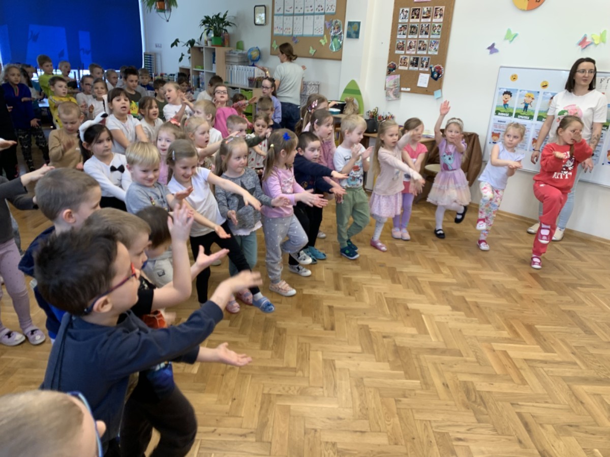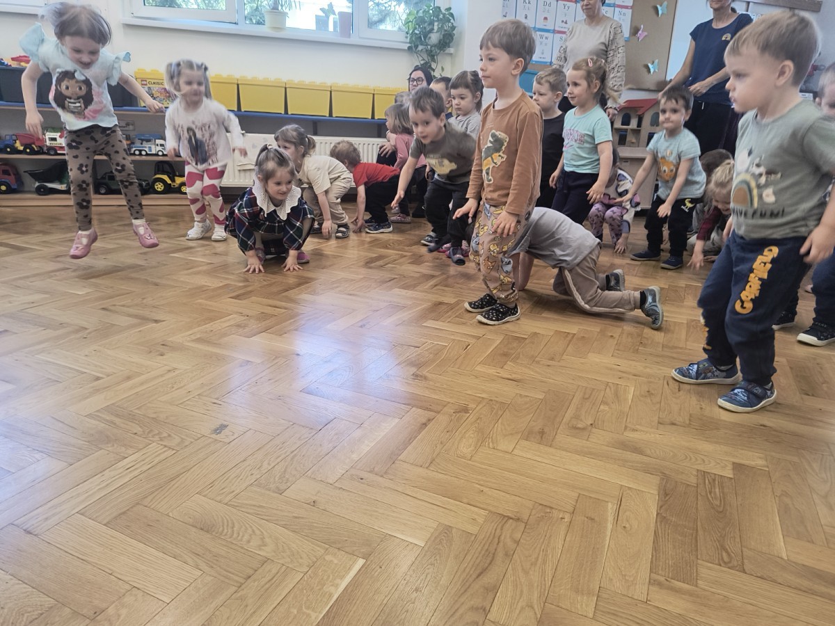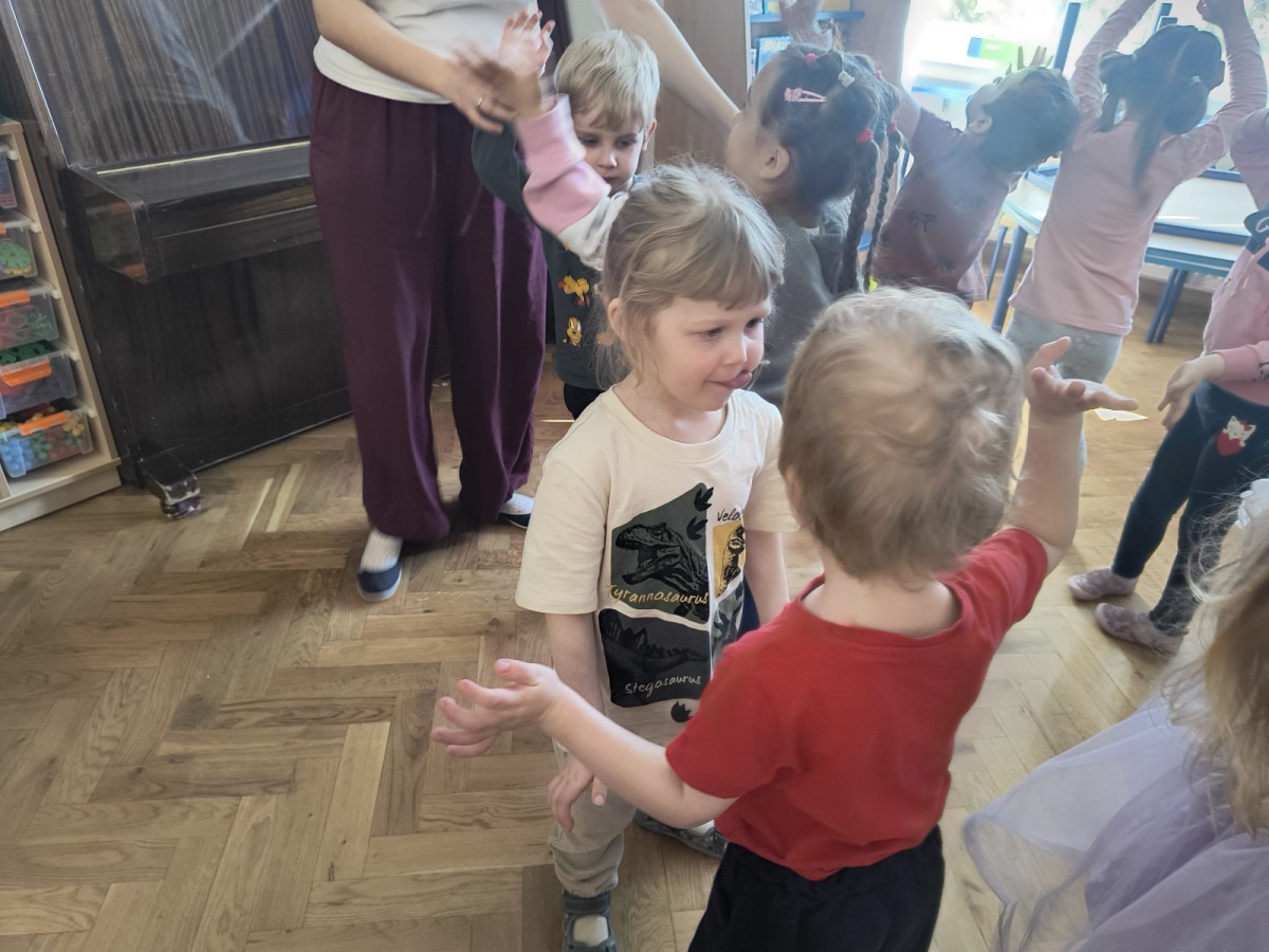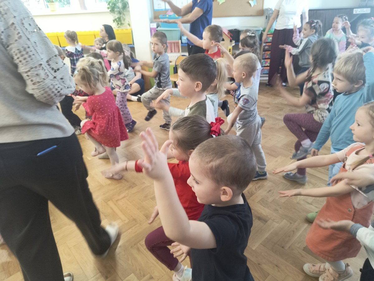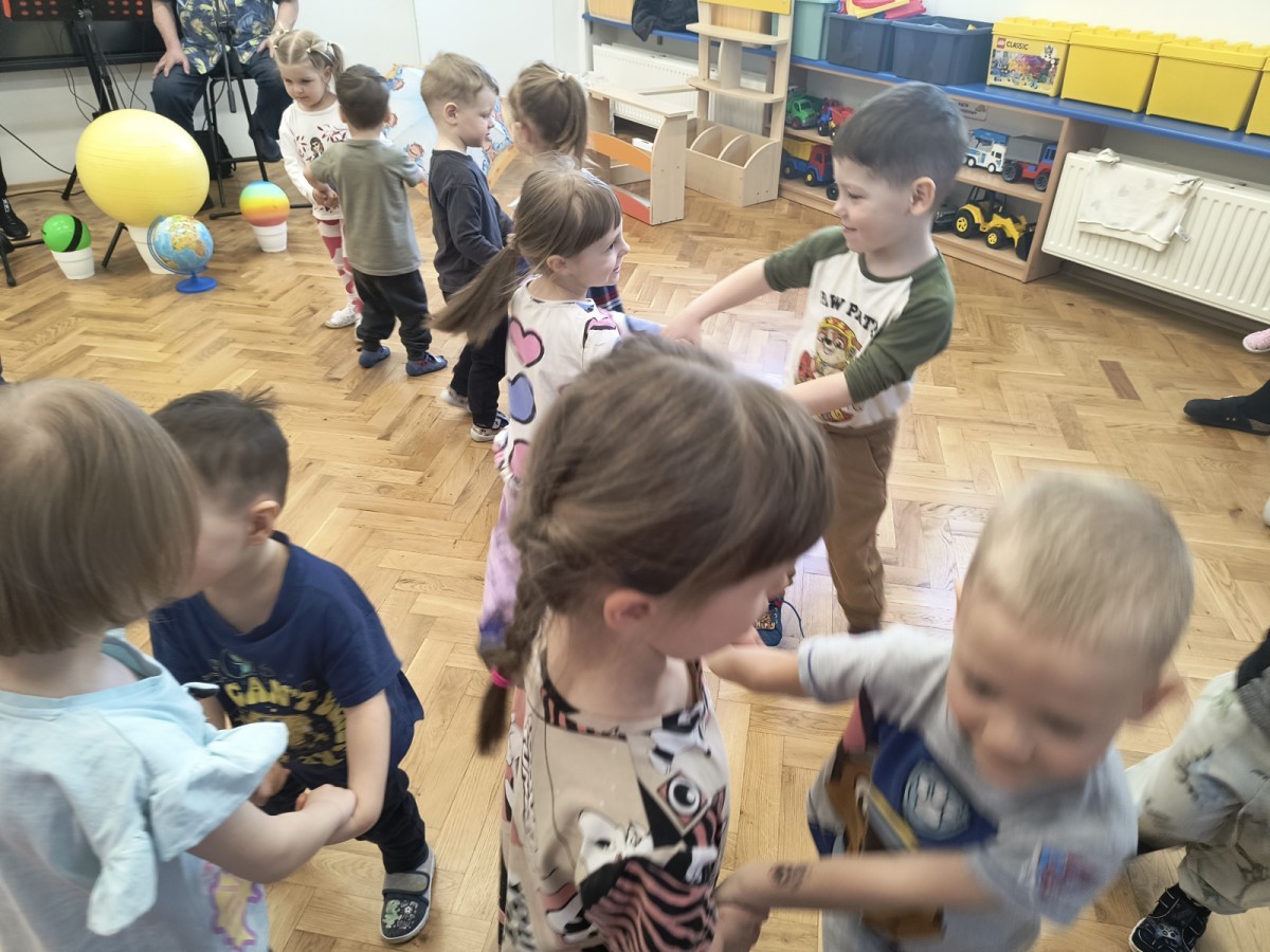 Przedszkolaki z ogromnym zaangażowaniem brały udział w zabawie – śpiewały, klaskały i poruszały się w rytm muzyki. Na twarzach dzieci nie brakowało uśmiechów, a cała sala wypełniła się pozytywną energią 😊✨