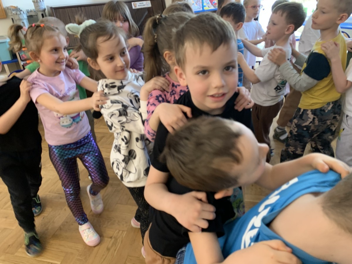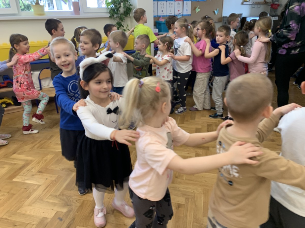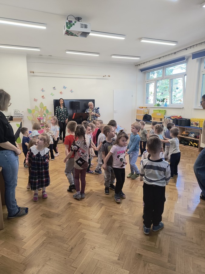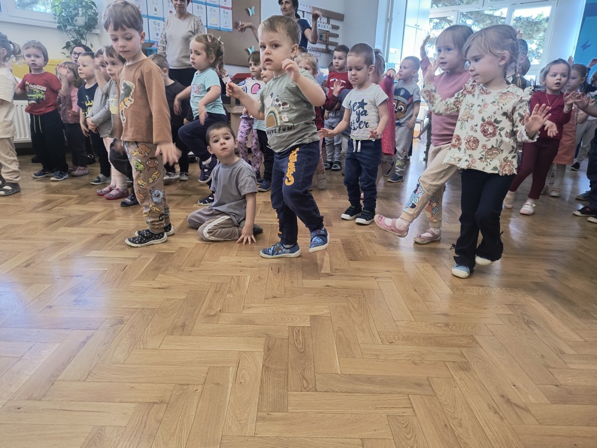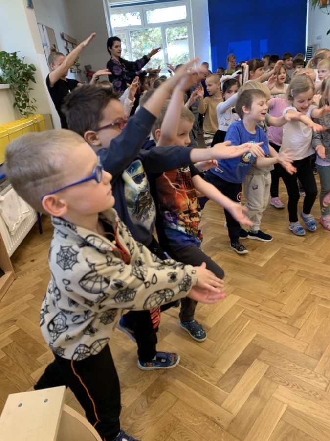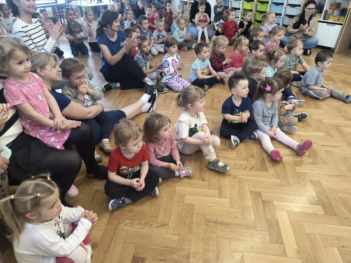 Przedszkolaki z ogromnym zaangażowaniem brały udział w zabawie – śpiewały, klaskały i poruszały się w rytm muzyki. Na twarzach dzieci nie brakowało uśmiechów, a cała sala wypełniła się pozytywną energią 😊✨