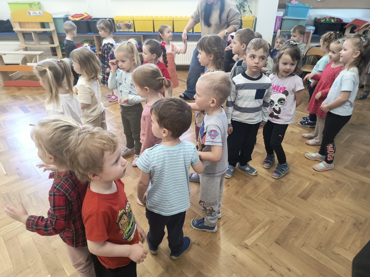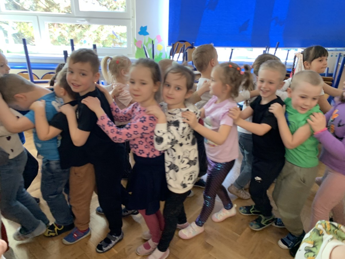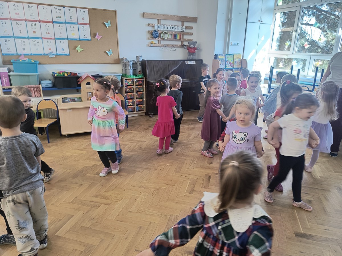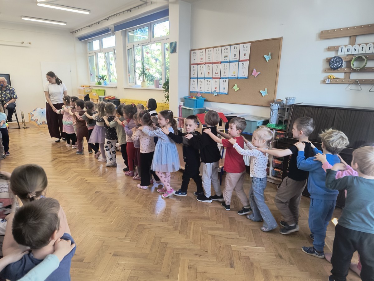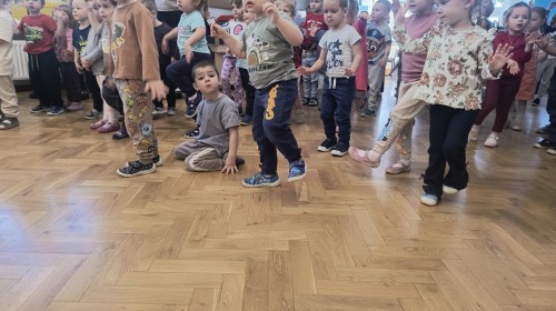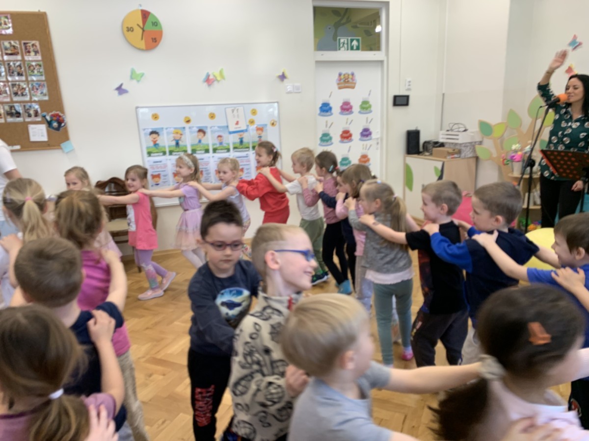 Przedszkolaki z ogromnym zaangażowaniem brały udział w zabawie – śpiewały, klaskały i poruszały się w rytm muzyki. Na twarzach dzieci nie brakowało uśmiechów, a cała sala wypełniła się pozytywną energią 😊✨