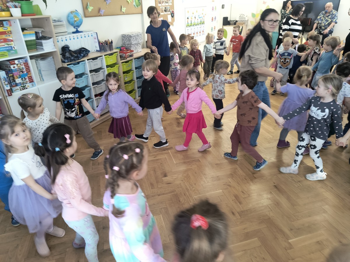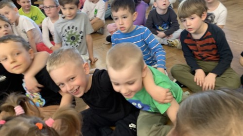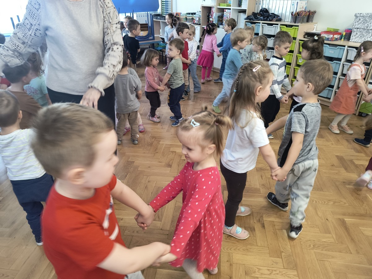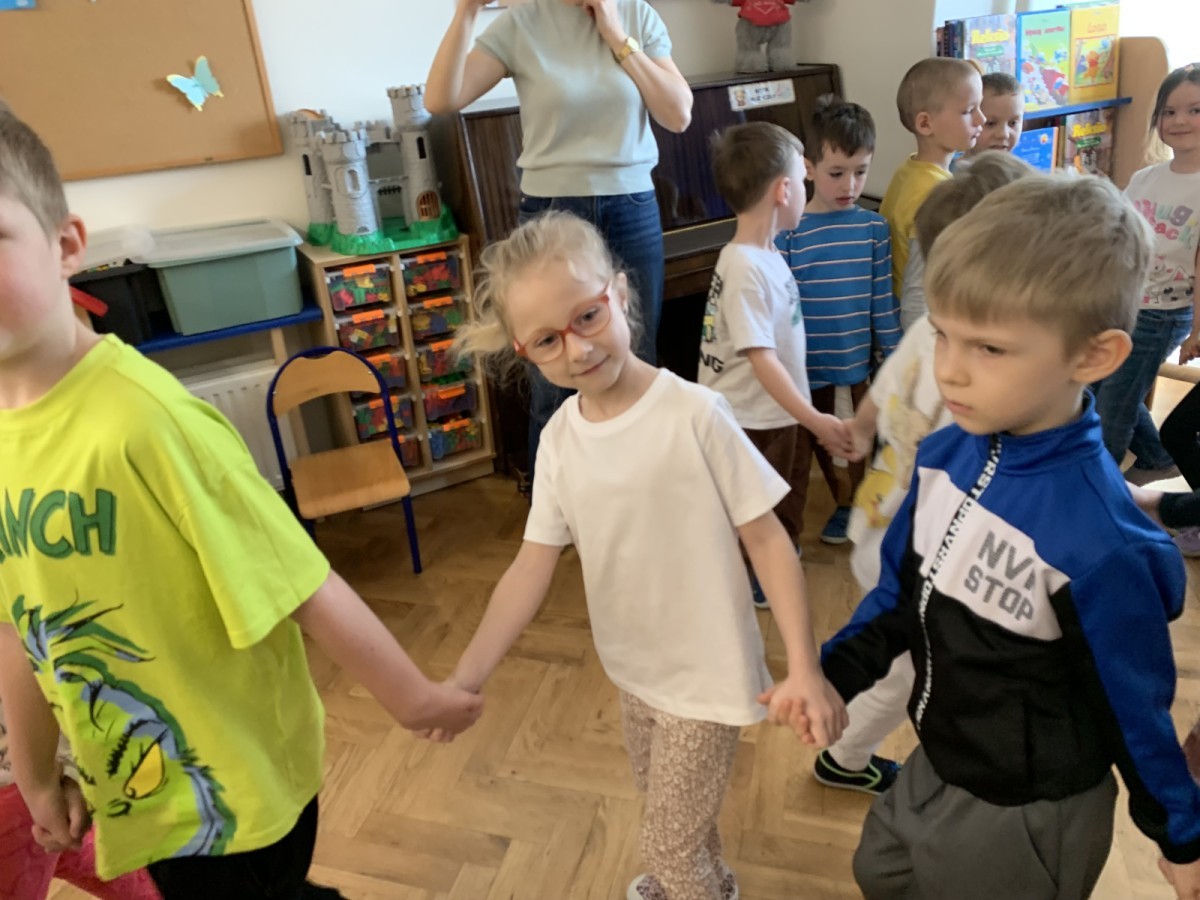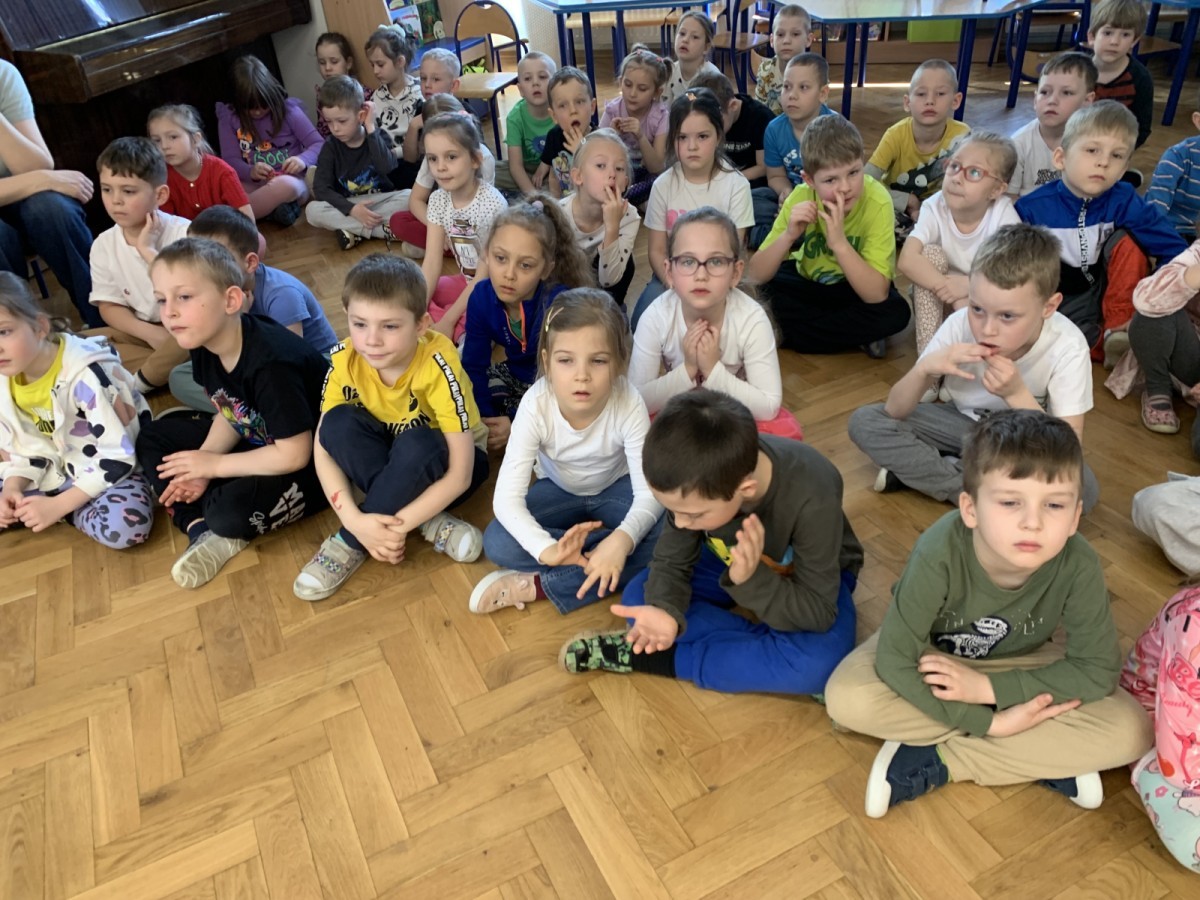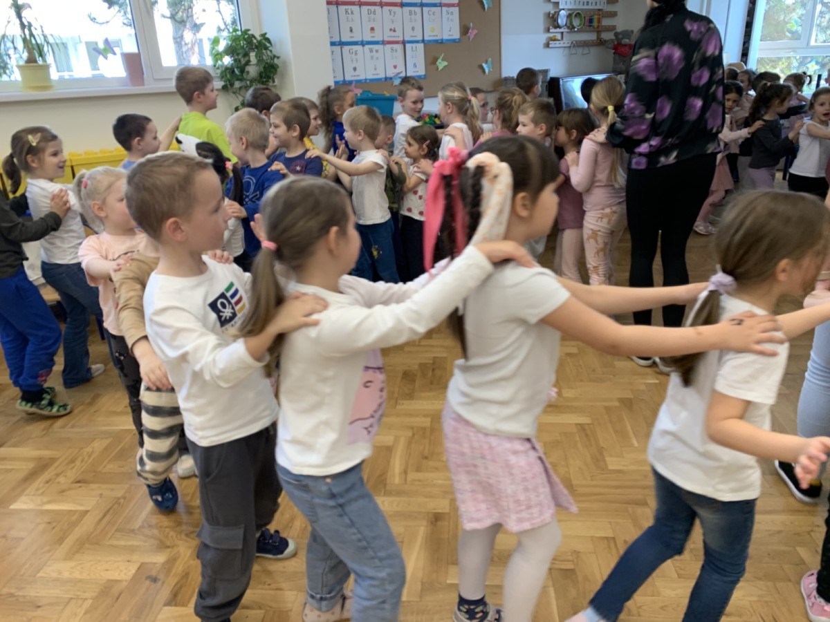 Przedszkolaki z ogromnym zaangażowaniem brały udział w zabawie – śpiewały, klaskały i poruszały się w rytm muzyki. Na twarzach dzieci nie brakowało uśmiechów, a cała sala wypełniła się pozytywną energią 😊✨