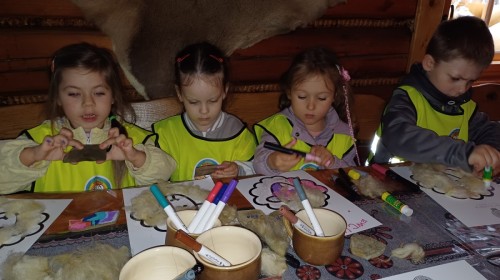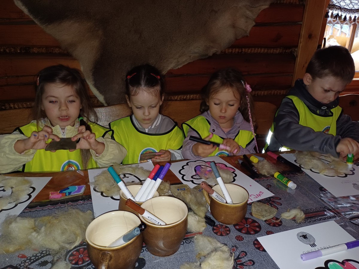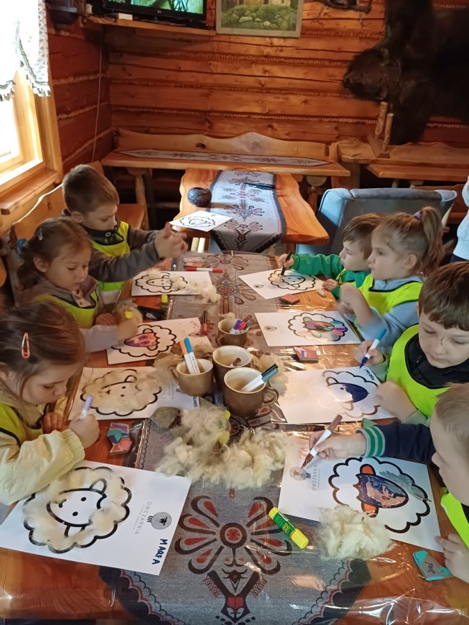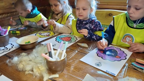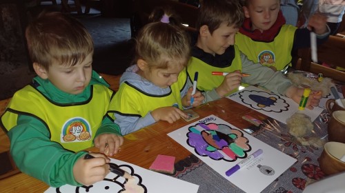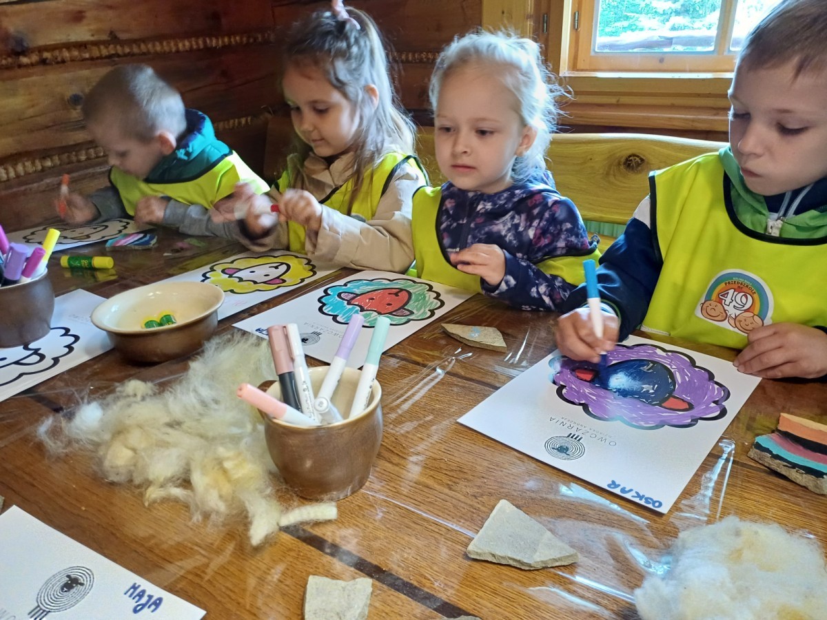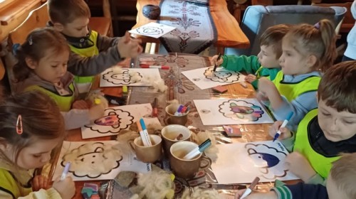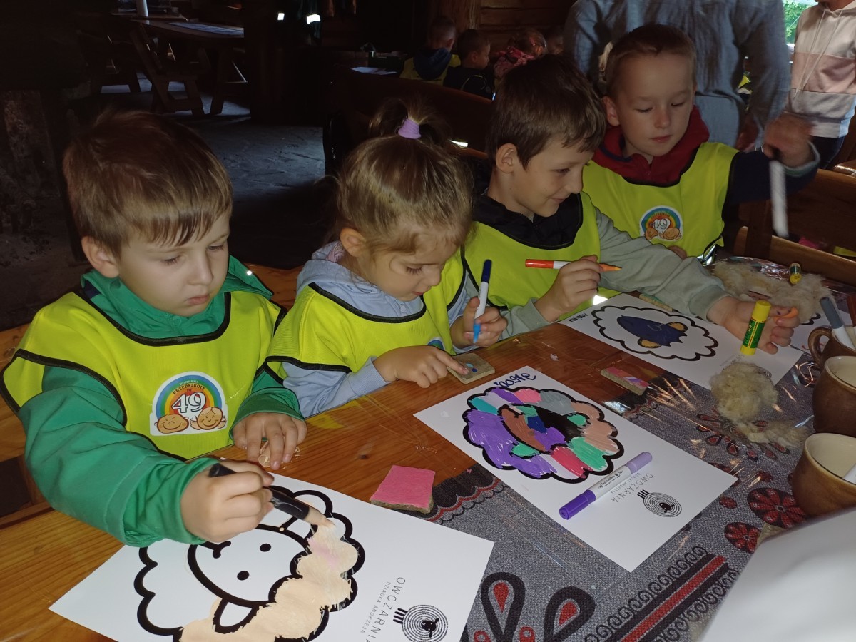 Po chwili odpoczynku nadszedł czas na twórcze działania. Przedszkolaki wyklejały i malowały szablony owiec, tworząc kolorowe i puchate arcydzieła. Nie zabrakło także malowania kamieni – na każdym z nich pojawiły się piękne wzory i uśmiechnięte buzie.