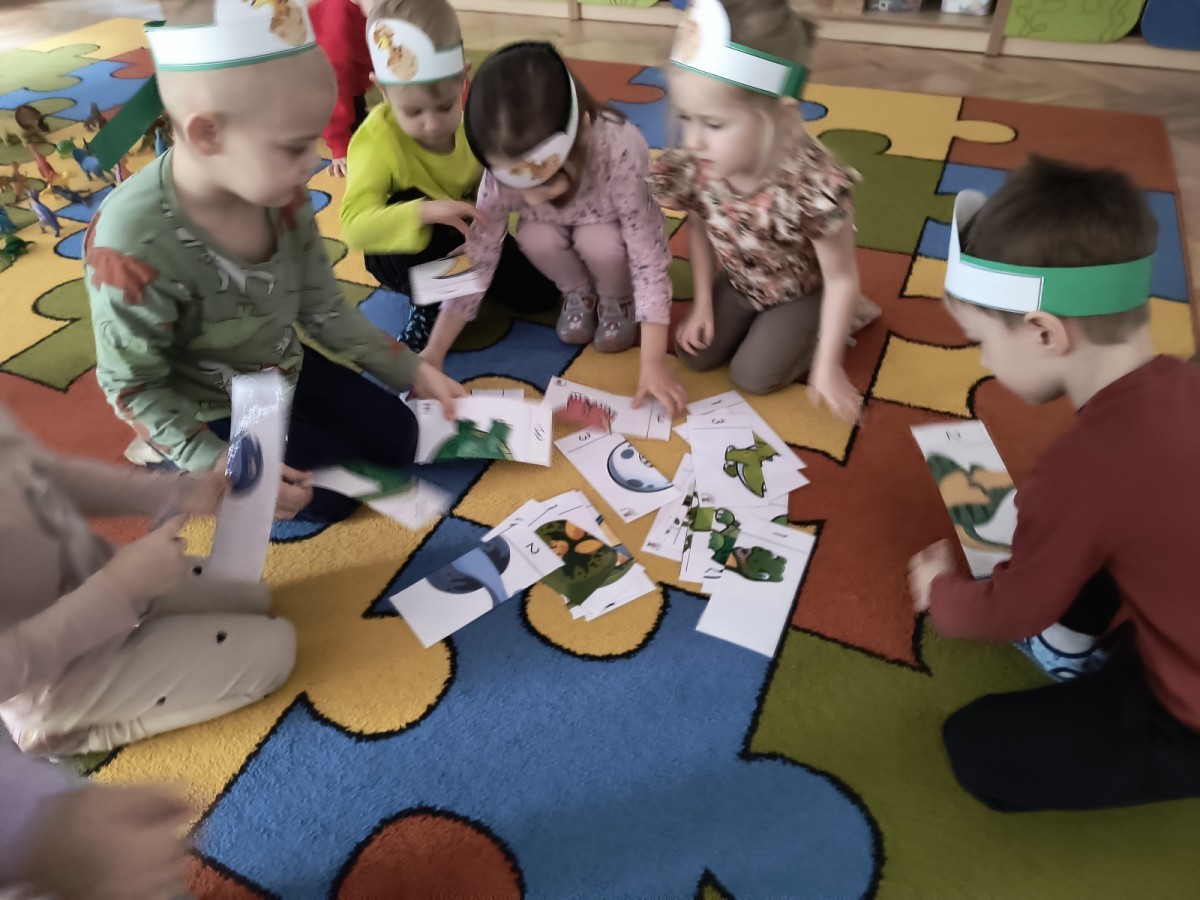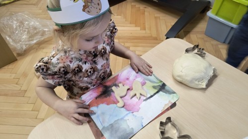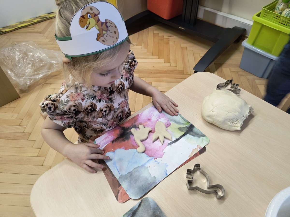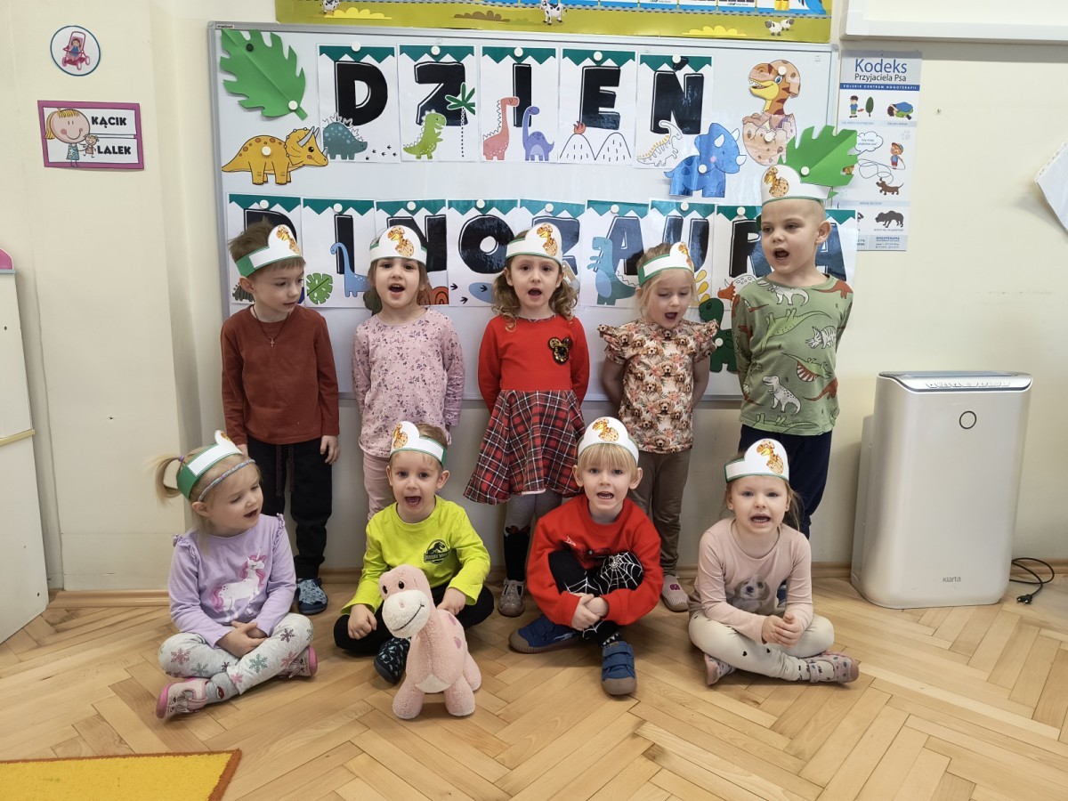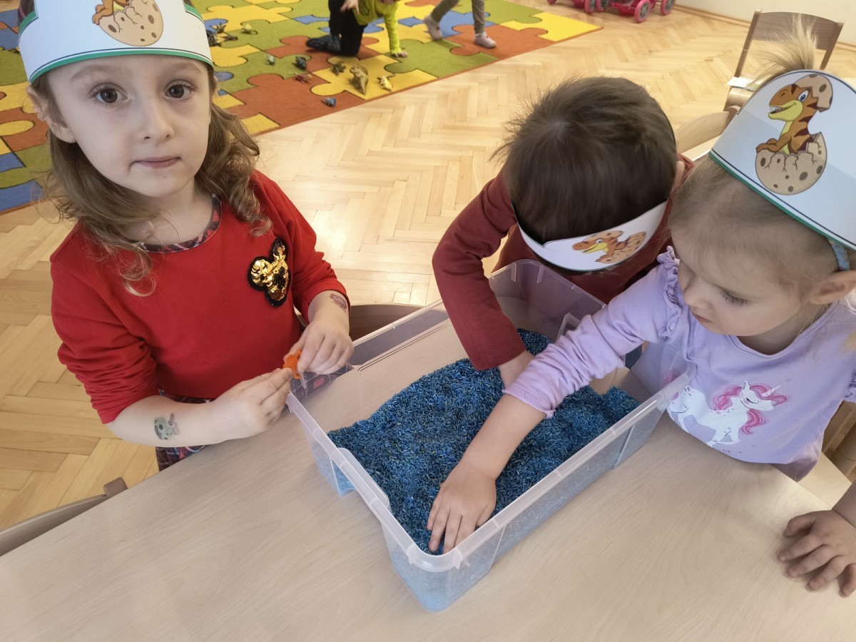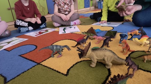W tym dniu odbyły się aktywności związane z tymi prehistorycznymi gadami. Oglądaliśmy prezentacje multimedialną i słuchaliśmy odgłosów dinozaurów. Bawiliśmy się w paleontologa i wyszukiwaliśmy ukrytych dinozaurów w materiałach sypkich: ryżu, mące czy kaszy. Nie zabrakło zabaw plastycznych z wykorzystaniem masy solnej, farb, zabaw muzycznych czy ruchowych. Dzieci poznały różne gatunki tych gadów, sposób ich poruszania się i odżywiania w zabawie z latarkę „ Co dinozaur ma w brzuszku”. Dla głodnych „dinozaurów” przygotowany był ciasteczkowy poczęstunek. Na zakończenie wykonaliśmy pamiątkowe zdjęcia.