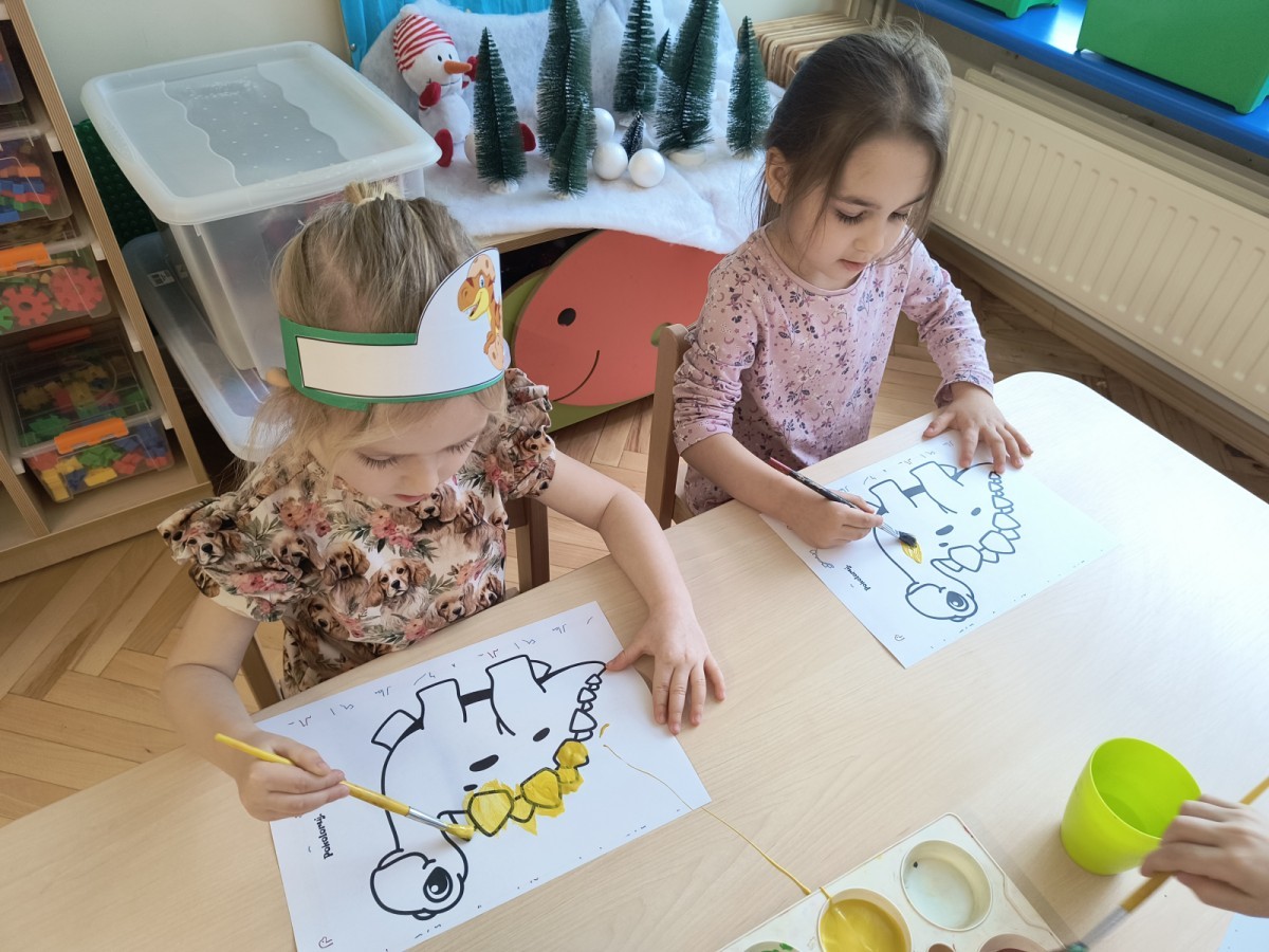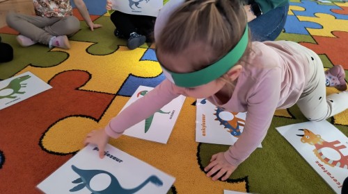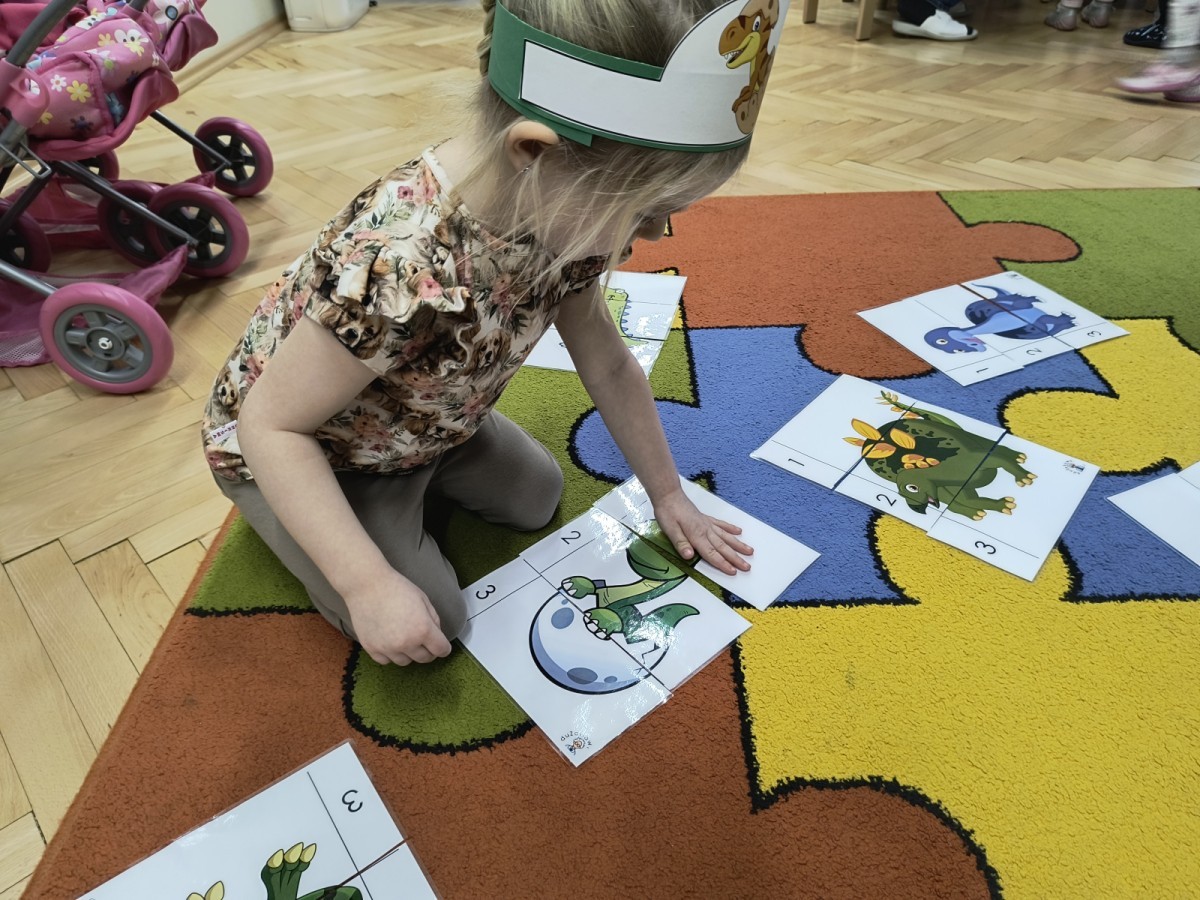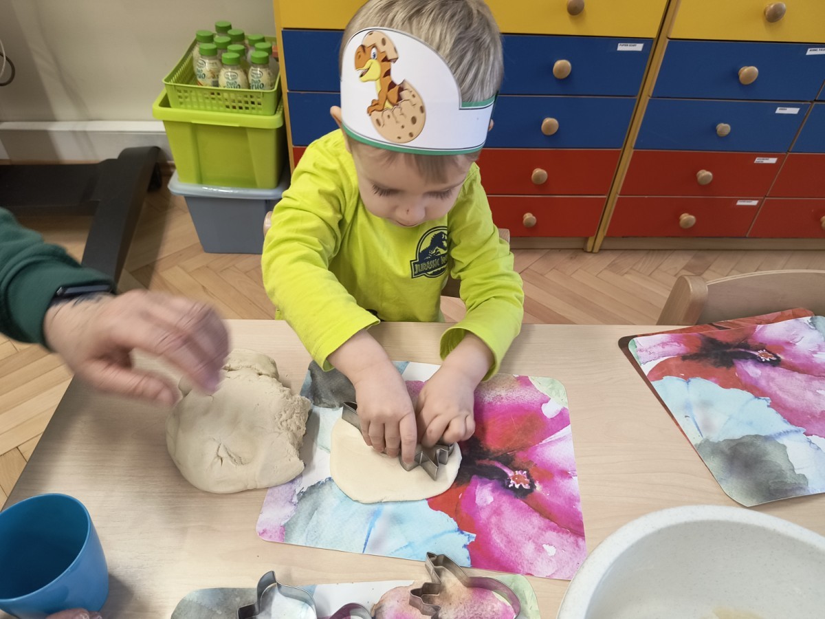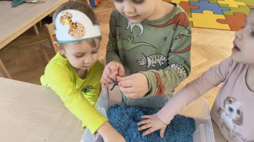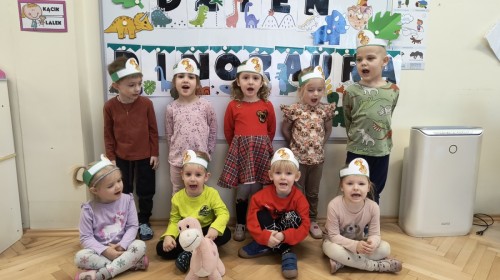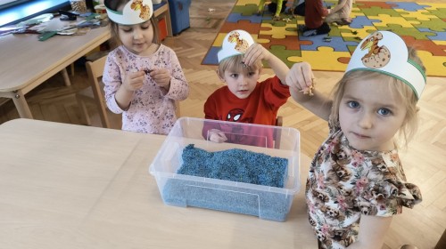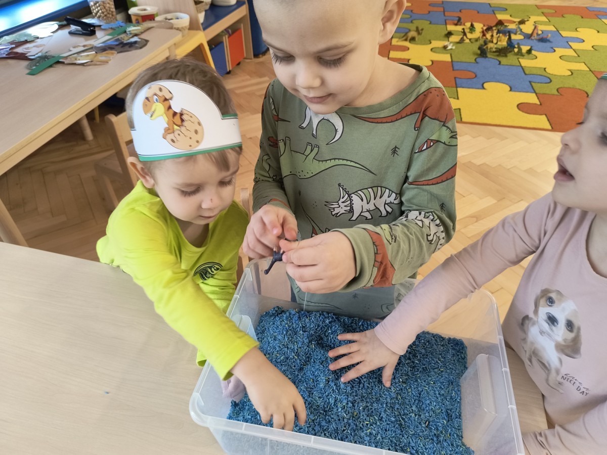 W tym dniu odbyły się aktywności związane z tymi prehistorycznymi gadami. Oglądaliśmy prezentacje multimedialną i słuchaliśmy odgłosów dinozaurów. Bawiliśmy się w paleontologa i wyszukiwaliśmy ukrytych dinozaurów w materiałach sypkich: ryżu, mące czy kaszy. Nie zabrakło zabaw plastycznych z wykorzystaniem masy solnej, farb, zabaw muzycznych czy ruchowych. Dzieci poznały różne gatunki tych gadów, sposób ich poruszania się i odżywiania w zabawie z latarkę „ Co dinozaur ma w brzuszku”. Dla głodnych „dinozaurów” przygotowany był ciasteczkowy poczęstunek. Na zakończenie wykonaliśmy pamiątkowe zdjęcia.