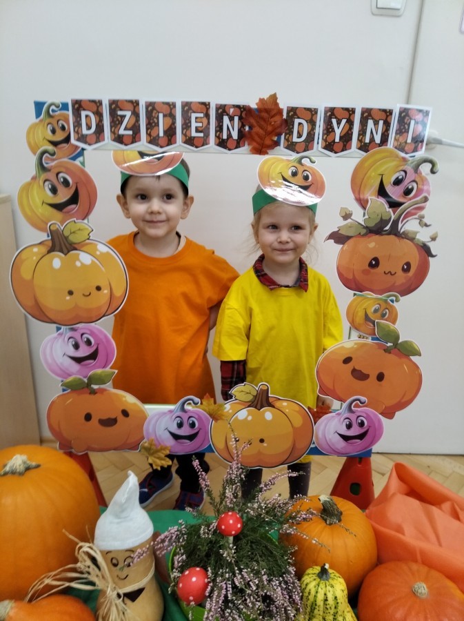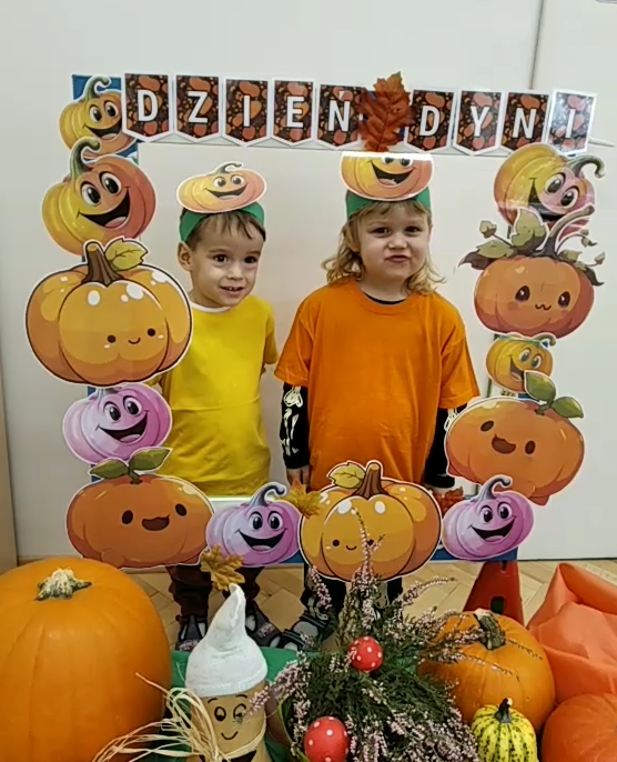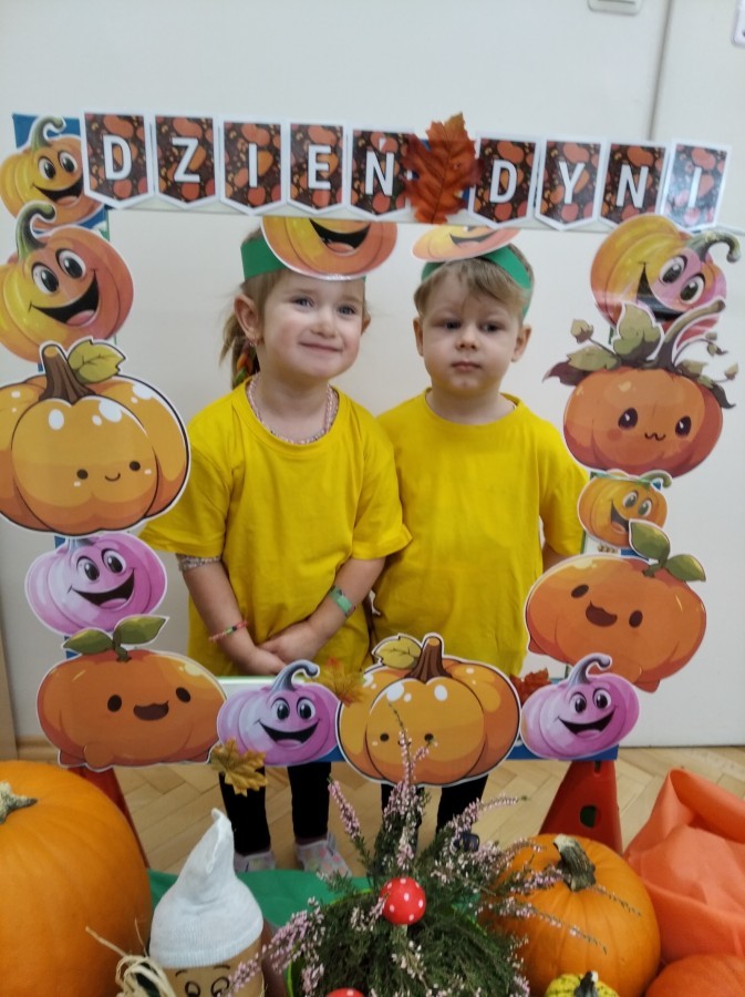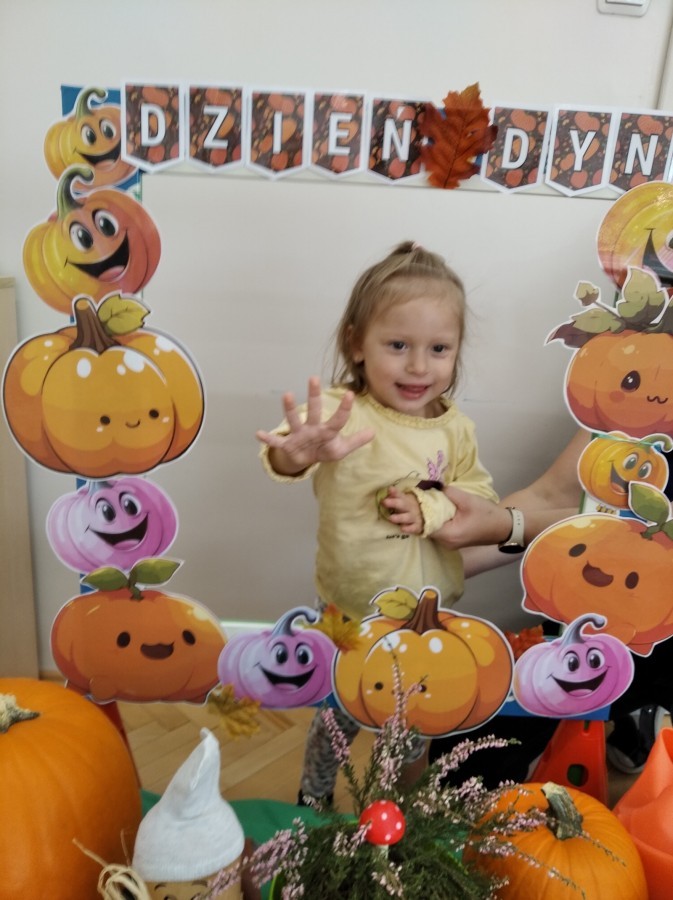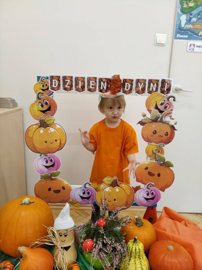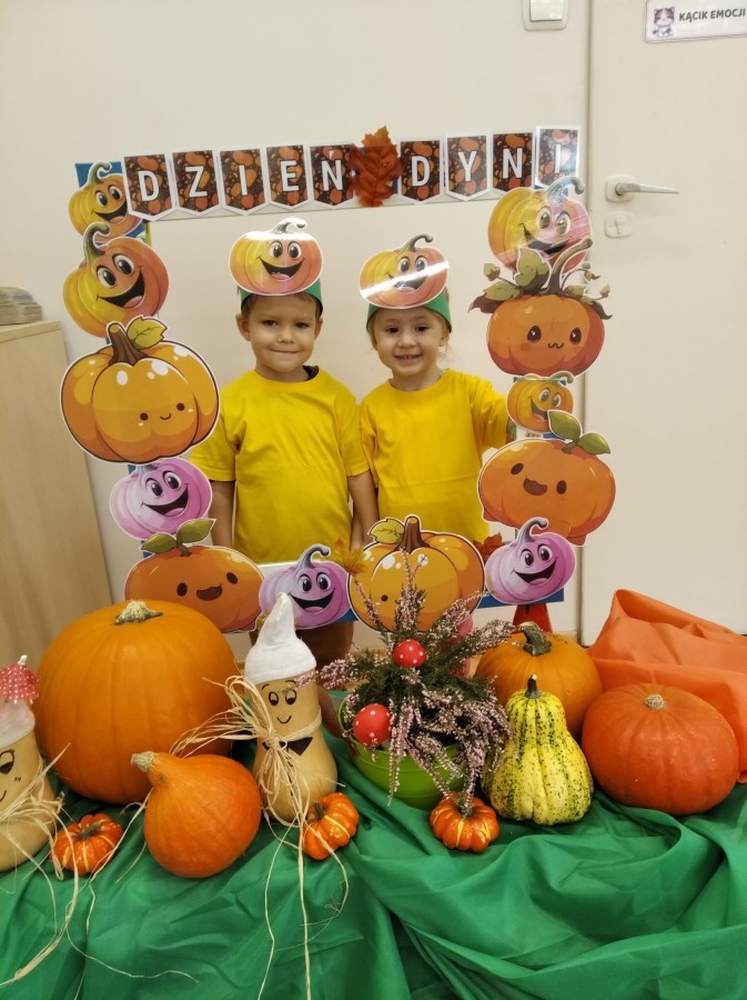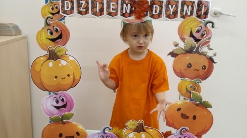 Dzieci z grupy "Kotki"przyniosły do przedszkola dynie. Poznały wielką różnorodność dyń i wzbogaciły wiedzę na ich temat. Dowiedziały się, że dynia jest bardzo zdrowym warzywem oraz, że można z niej przygotować wiele dań tj.: pieczywo, zupę, dżem, ciasto, babeczki, przetwory i kompot. Następnie przystąpiły do dyniowych zabaw. Miały też okazję przekonać się co znajduje się w środku dyni, jak wygląda jej wnętrze oraz zapoznać się z jej zapachem. "Kotki" wykonały też nietypową pracę plastyczną - odbijały - stopy na szablonie dyni. Miłą atrakcją były zdjęcia z fotobudki.