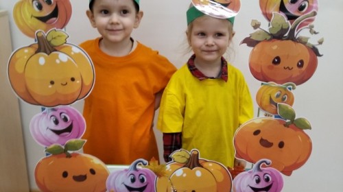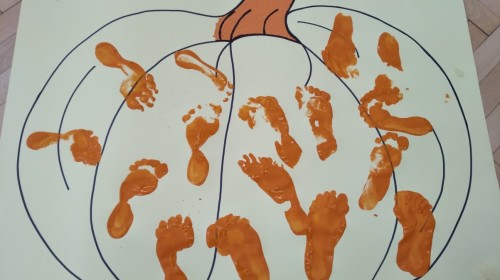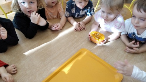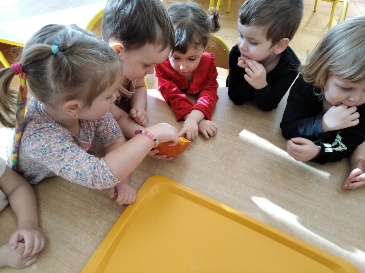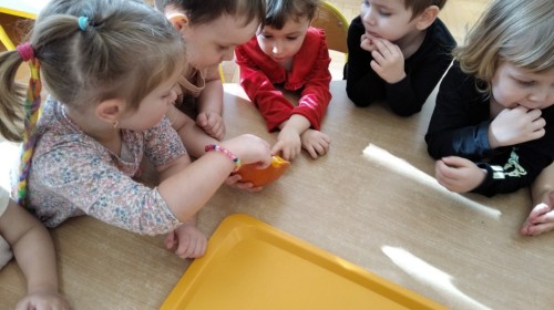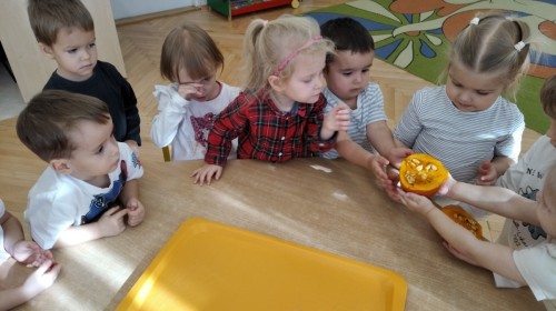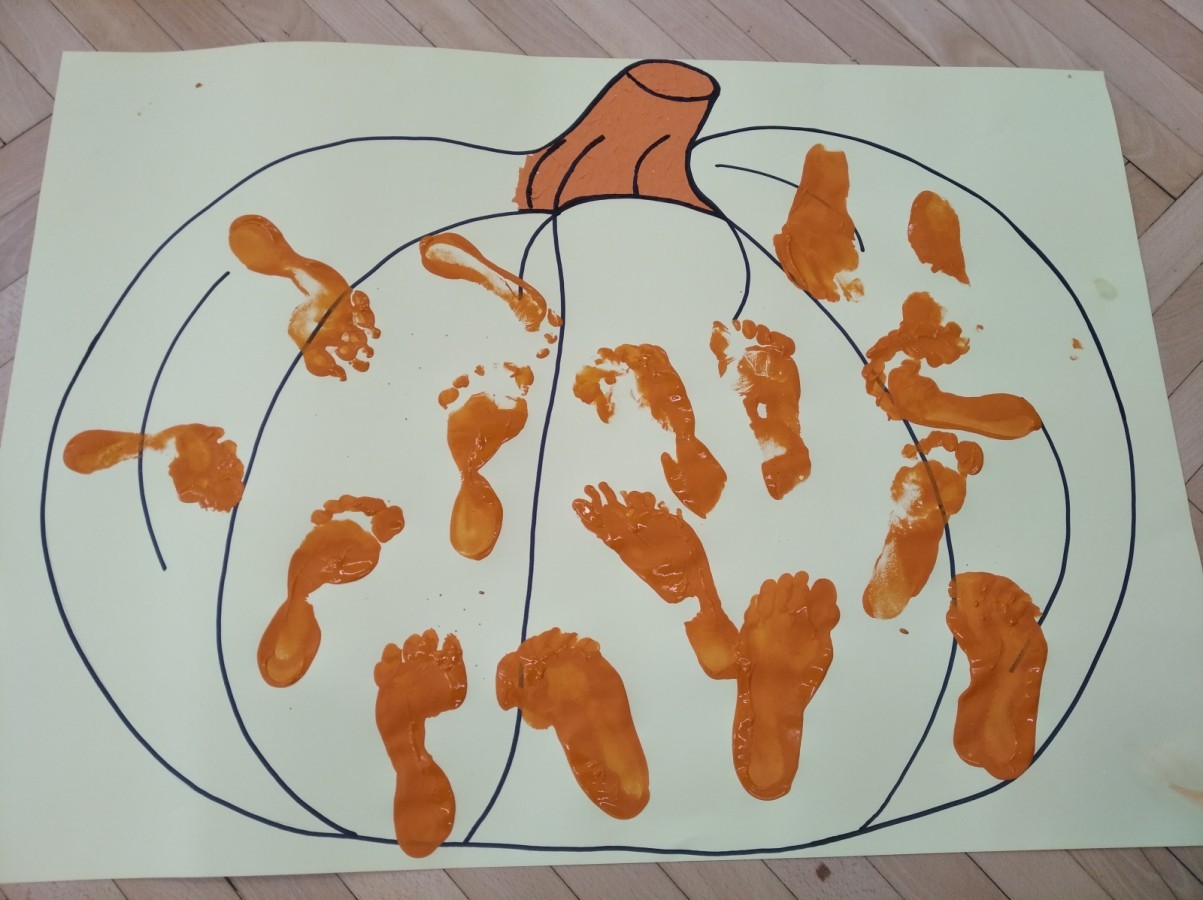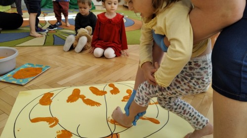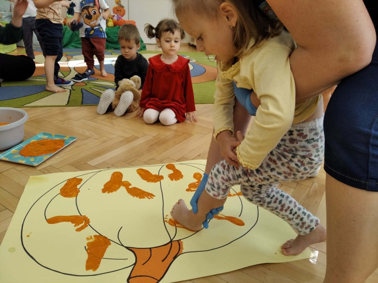 Dzieci z grupy "Kotki"przyniosły do przedszkola dynie. Poznały wielką różnorodność dyń i wzbogaciły wiedzę na ich temat. Dowiedziały się, że dynia jest bardzo zdrowym warzywem oraz, że można z niej przygotować wiele dań tj.: pieczywo, zupę, dżem, ciasto, babeczki, przetwory i kompot. Następnie przystąpiły do dyniowych zabaw. Miały też okazję przekonać się co znajduje się w środku dyni, jak wygląda jej wnętrze oraz zapoznać się z jej zapachem. "Kotki" wykonały też nietypową pracę plastyczną - odbijały - stopy na szablonie dyni. Miłą atrakcją były zdjęcia z fotobudki.