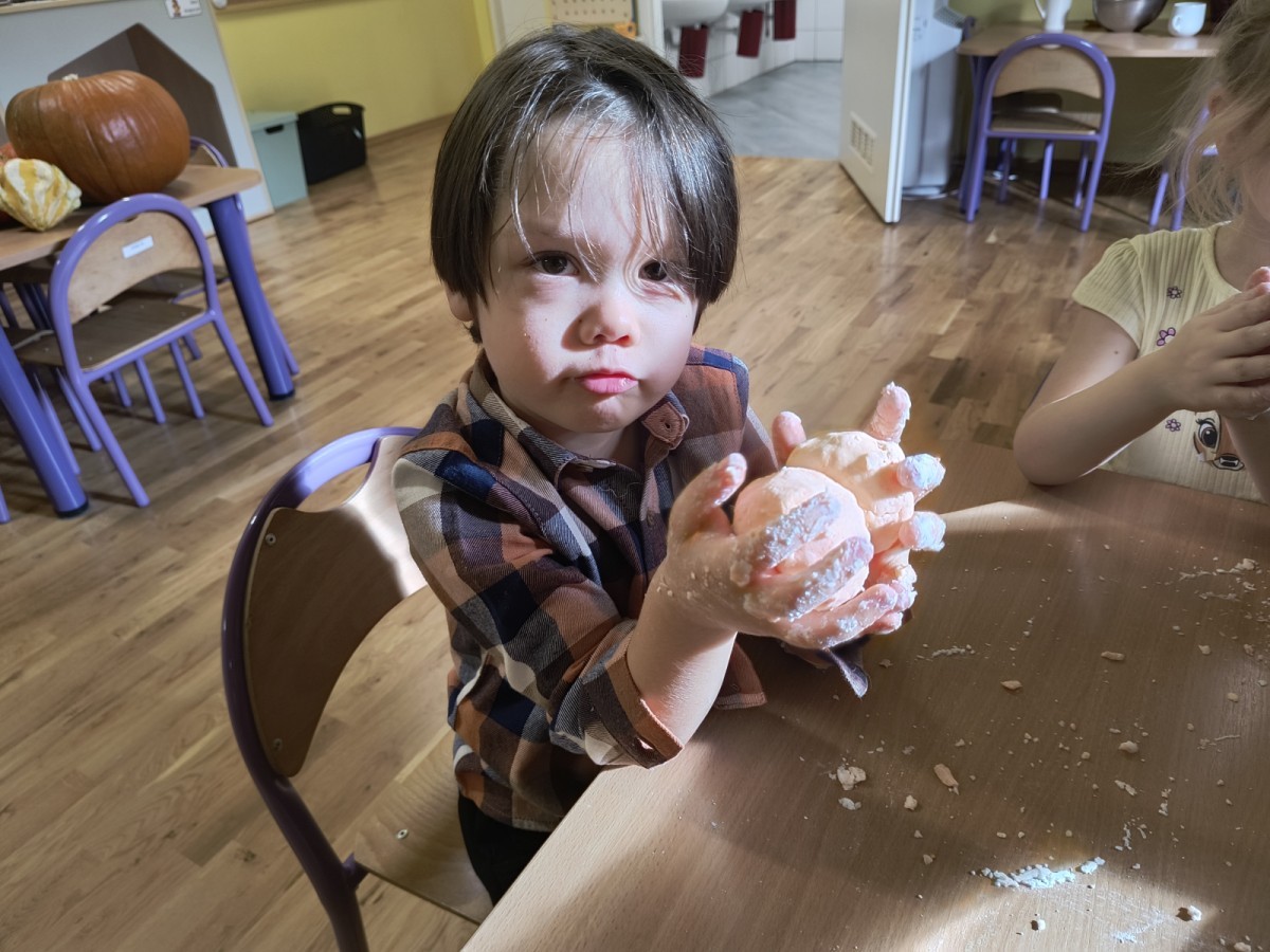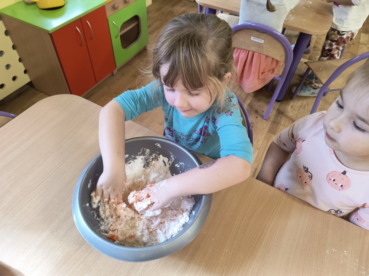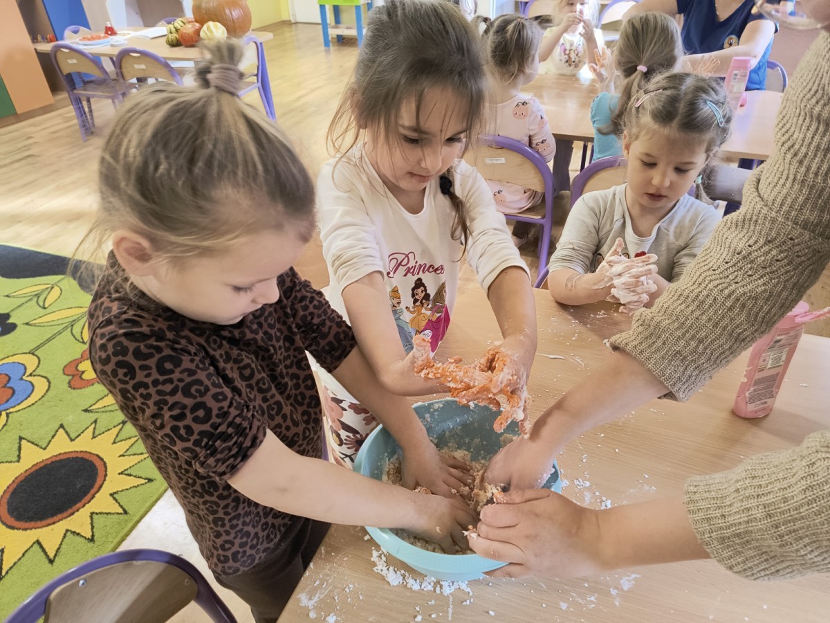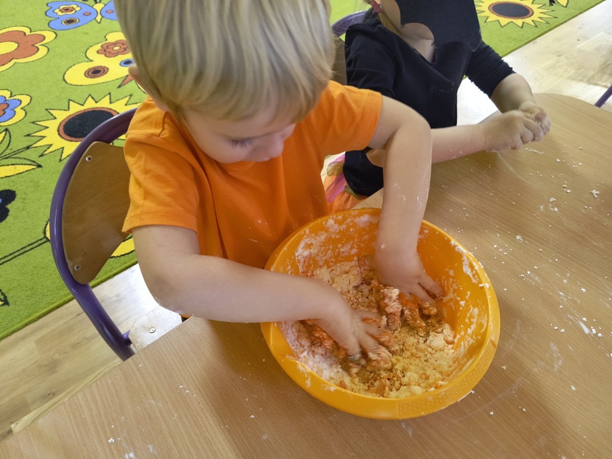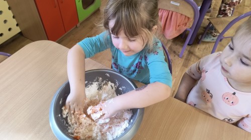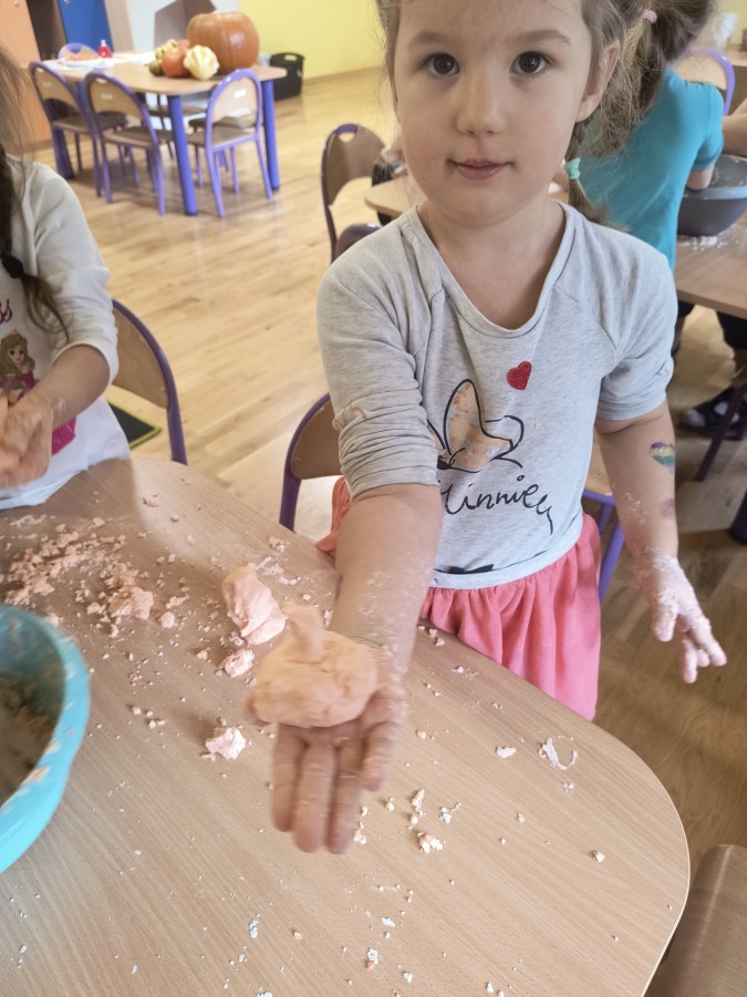 Na koniec z pomocą nauczycielek przygotowały masę aksamitną w kolorze...pomarańczowym, z której tworzyły różne dzieła, ale przede wszystkim - oczywiście małe dynie 🎃