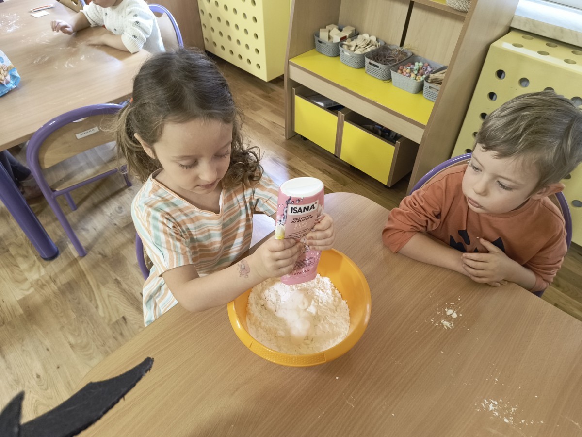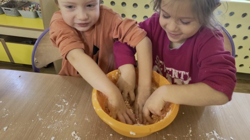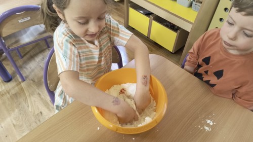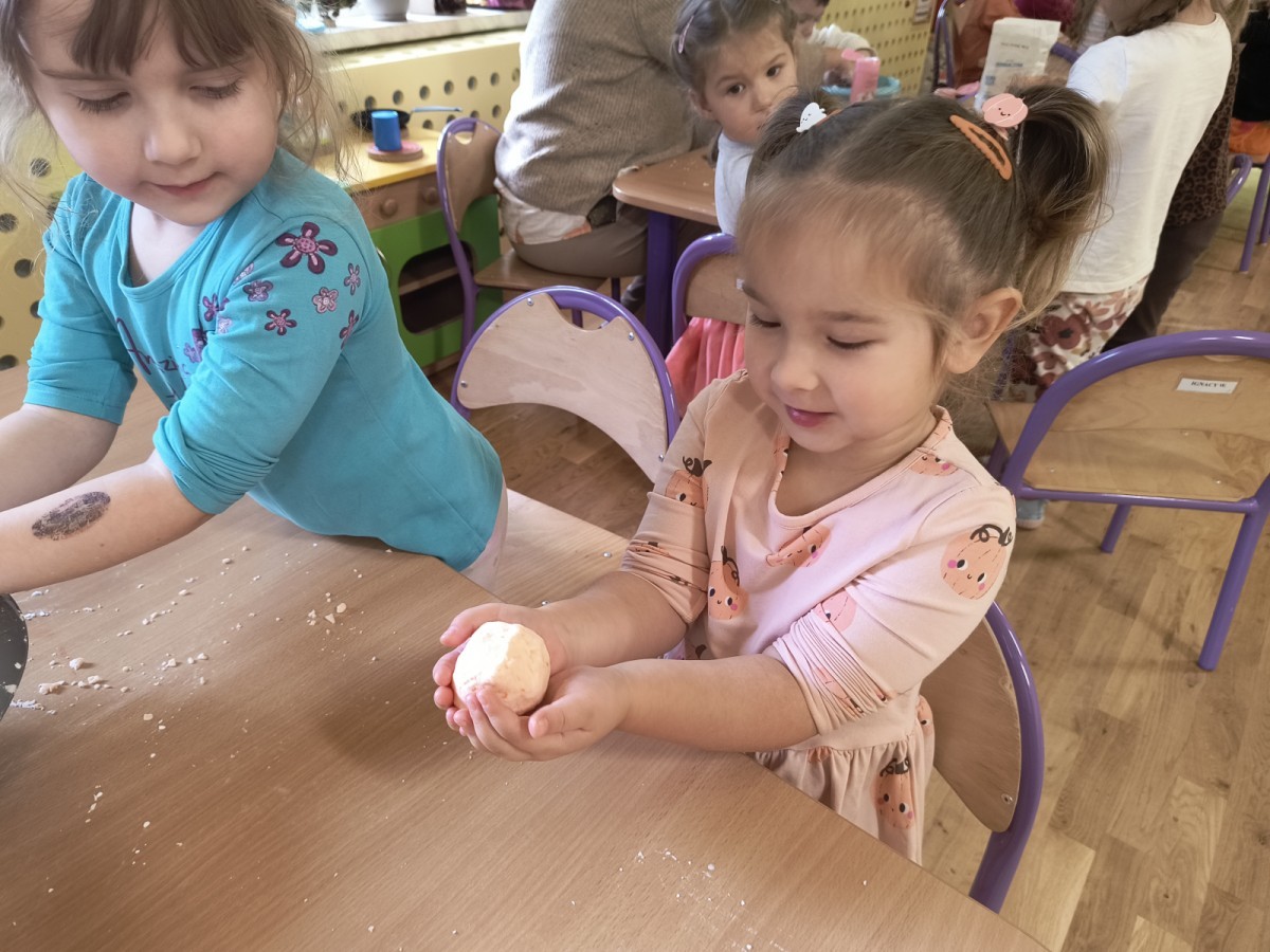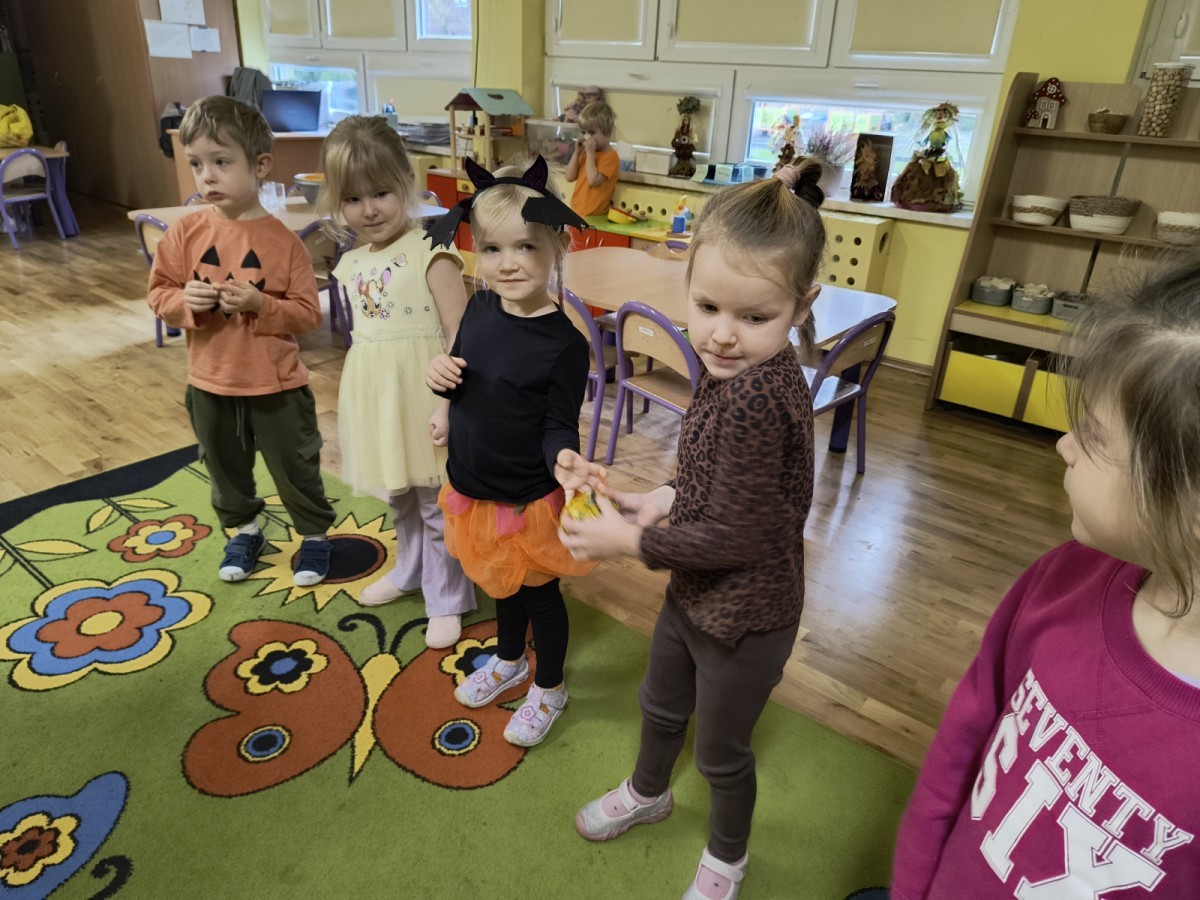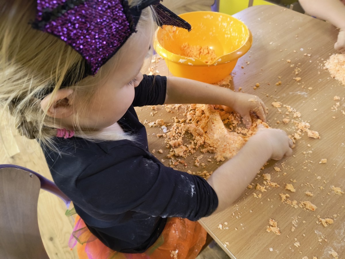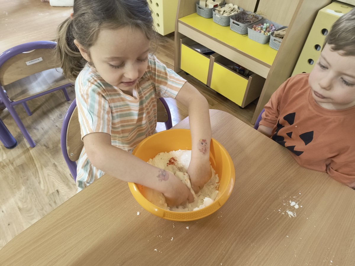 Na koniec z pomocą nauczycielek przygotowały masę aksamitną w kolorze...pomarańczowym, z której tworzyły różne dzieła, ale przede wszystkim - oczywiście małe dynie 🎃