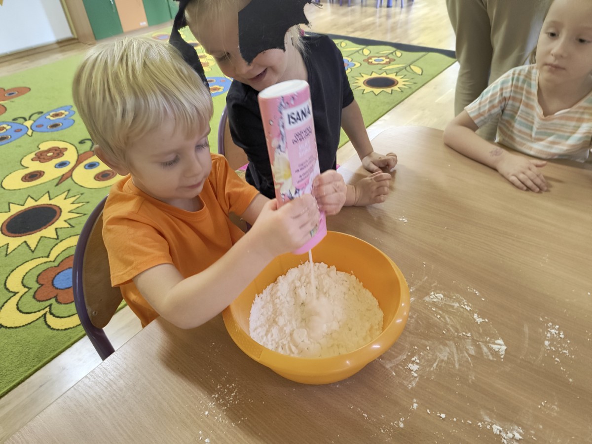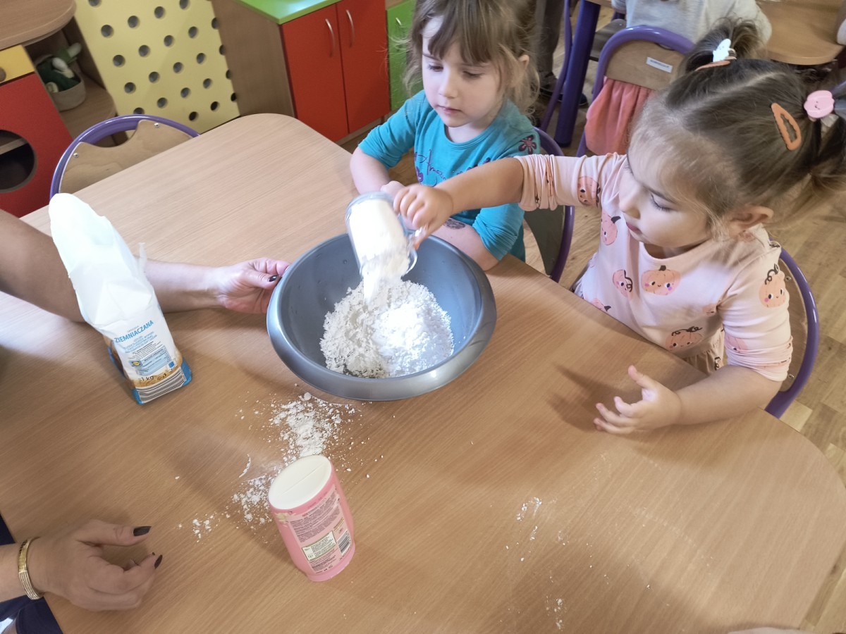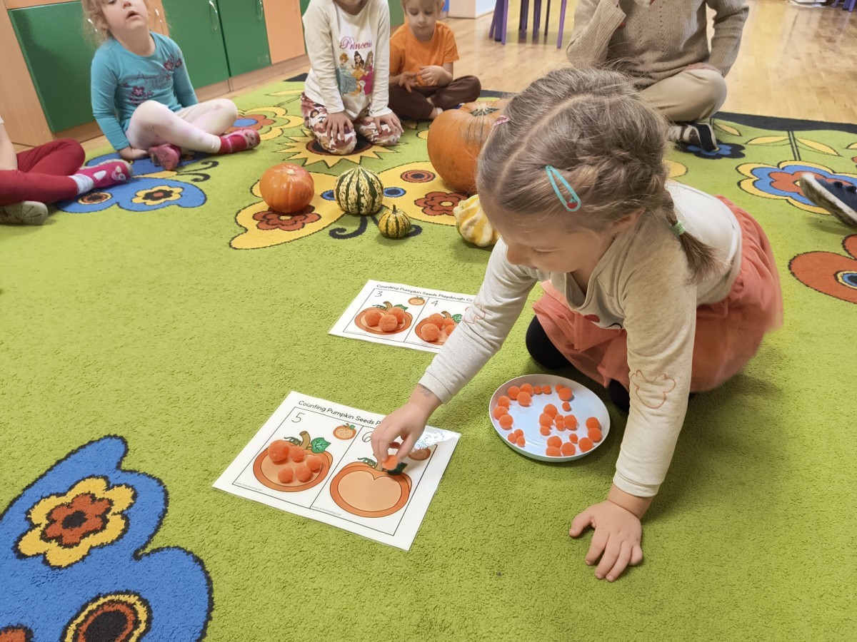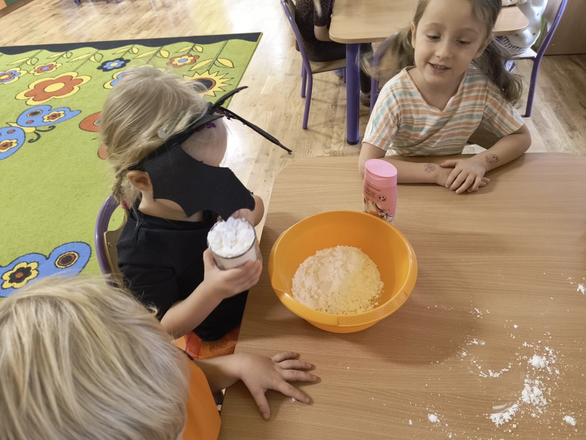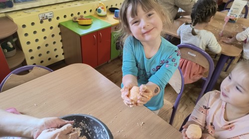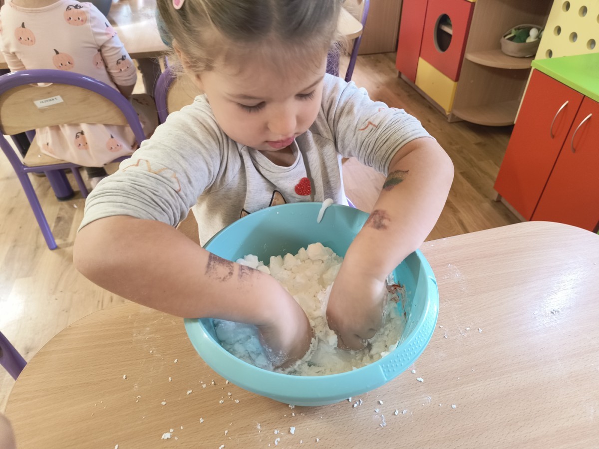 Na koniec z pomocą nauczycielek przygotowały masę aksamitną w kolorze...pomarańczowym, z której tworzyły różne dzieła, ale przede wszystkim - oczywiście małe dynie 🎃