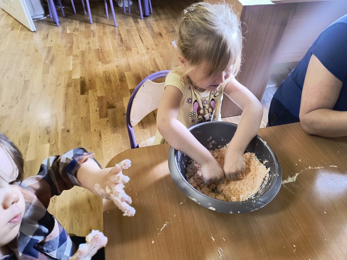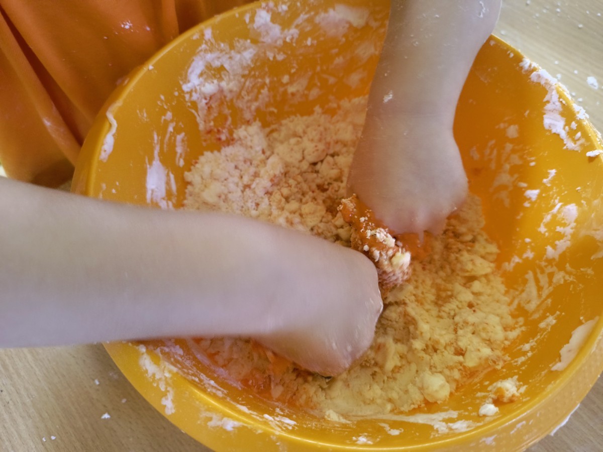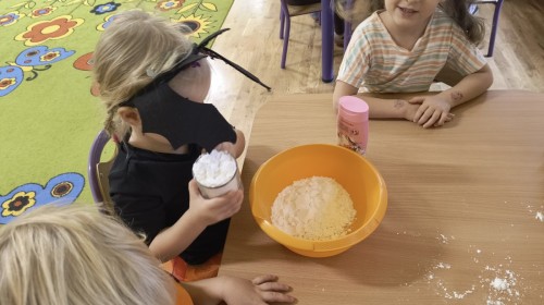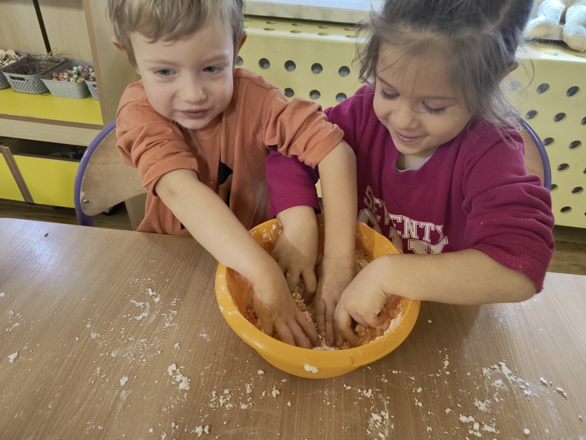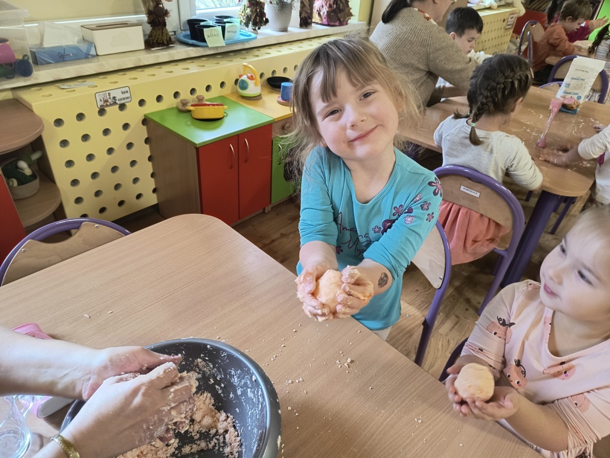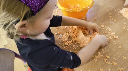Na koniec z pomocą nauczycielek przygotowały masę aksamitną w kolorze...pomarańczowym, z której tworzyły różne dzieła, ale przede wszystkim - oczywiście małe dynie 🎃
