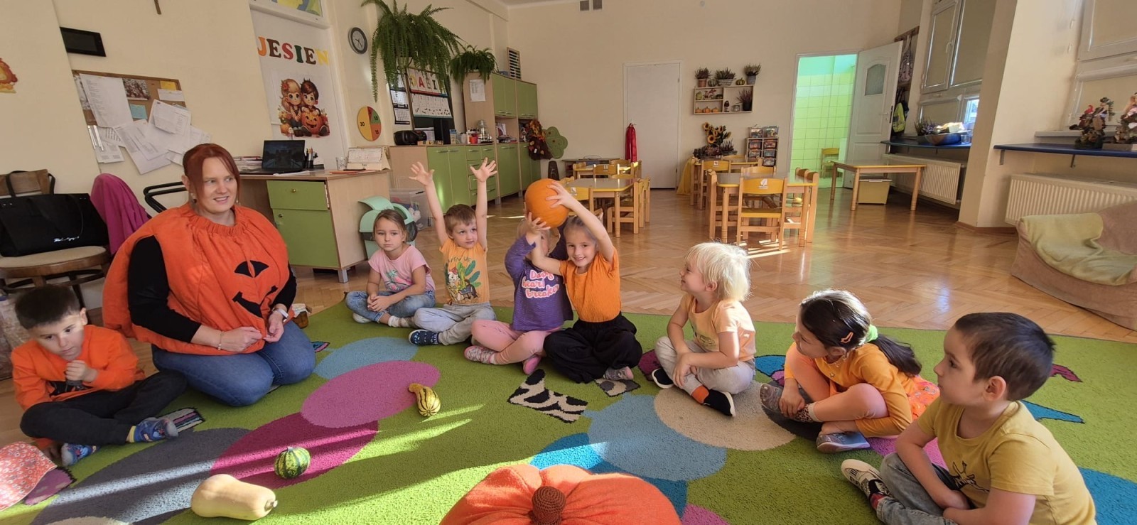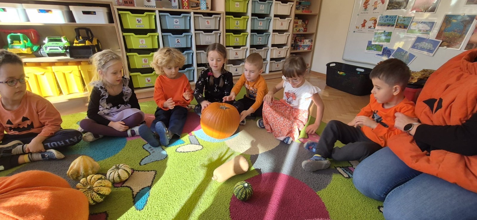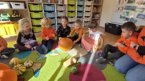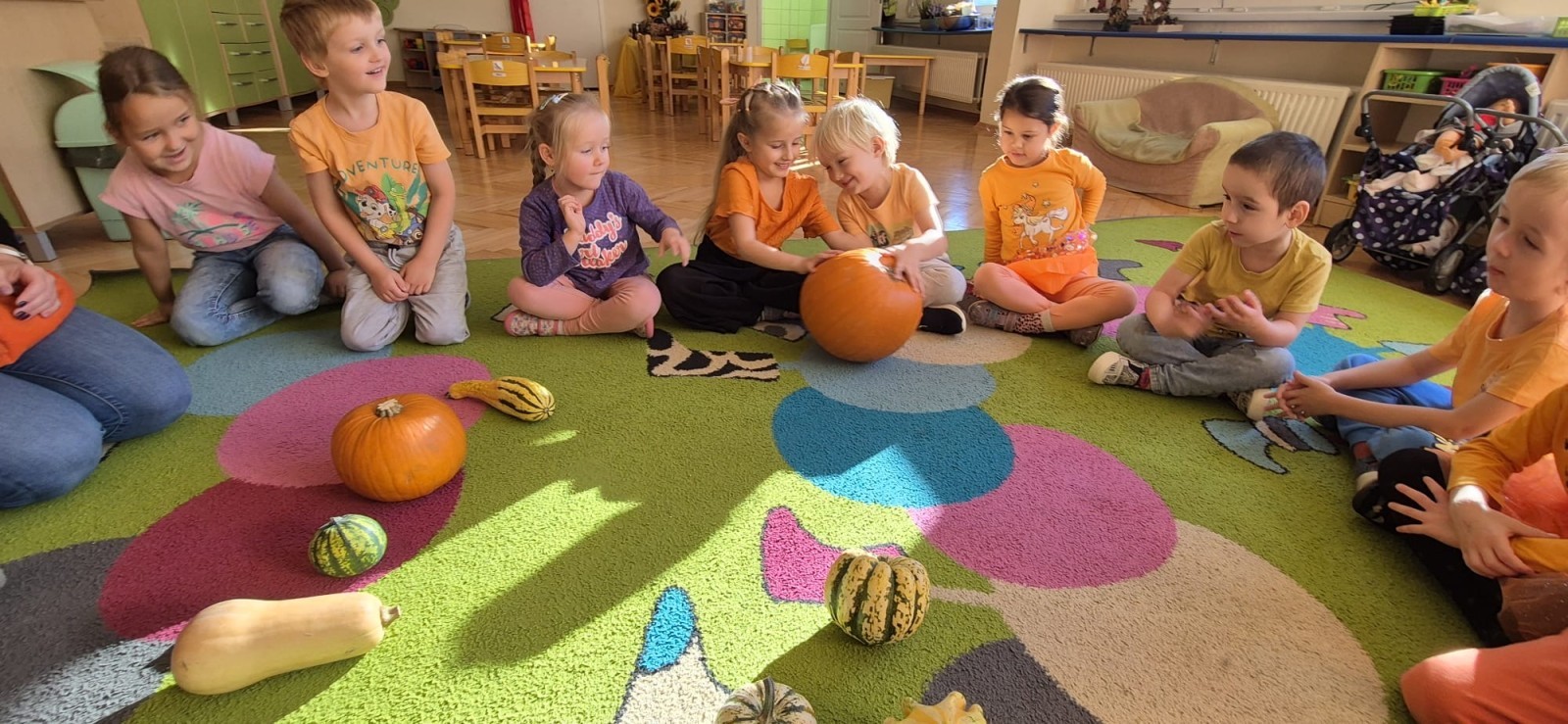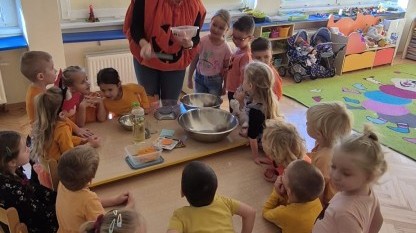 Dzieci z grupy Wilczków z wielkim zaangażowaniem uczestniczyły w zajęciach poświęconych temu wyjątkowemu warzywu. Poznały różne odmiany dyń, ich zastosowanie oraz właściwości zdrowotne. Dowiedziały się, że z dyni można przygotować wiele smacznych potraw, takich jak zupa, ciasto, babeczki czy przetwory.
