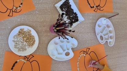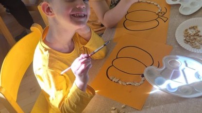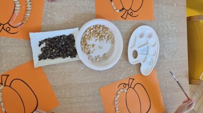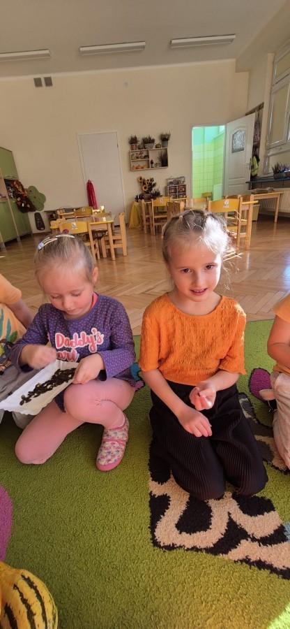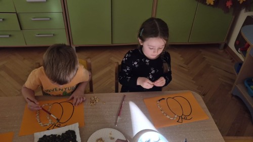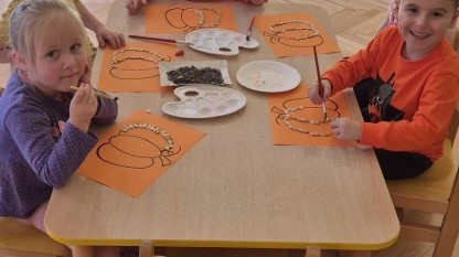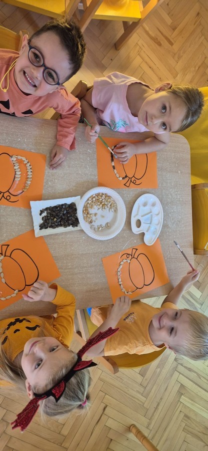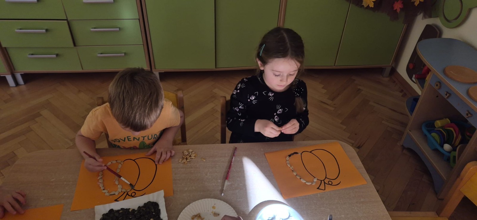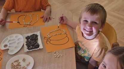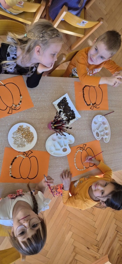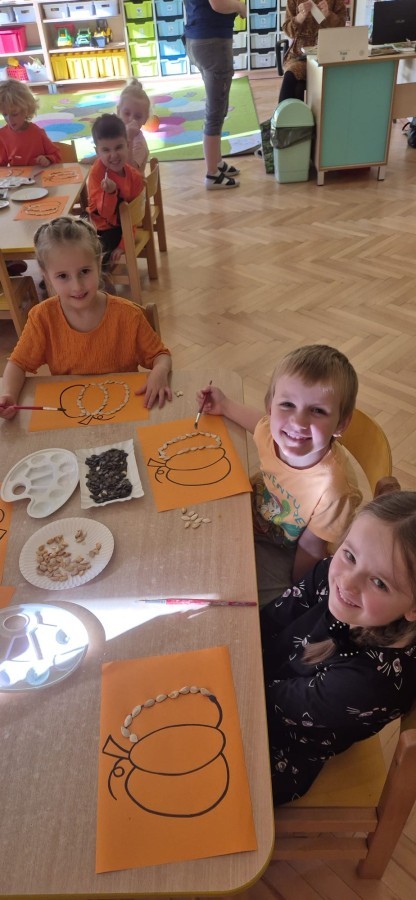 Na zakończenie dnia wykonały pracę plastyczną – wyklejały dynie pestkami, tworząc piękne i pomysłowe kompozycje. To był pełen radości, zapachów i kolorów dzień, który na długo pozostanie w pamięci Wilczków.