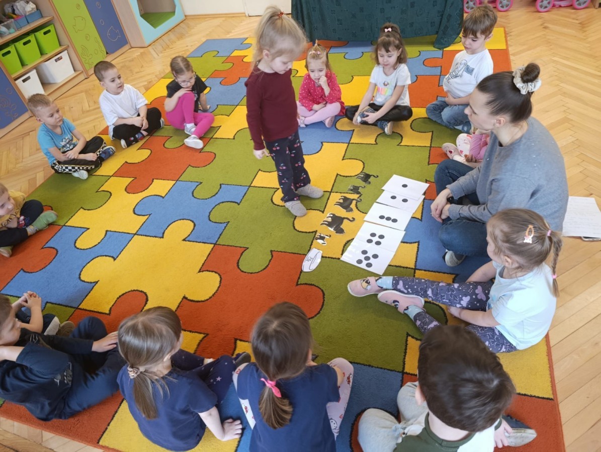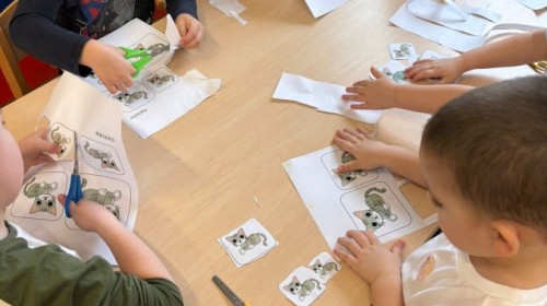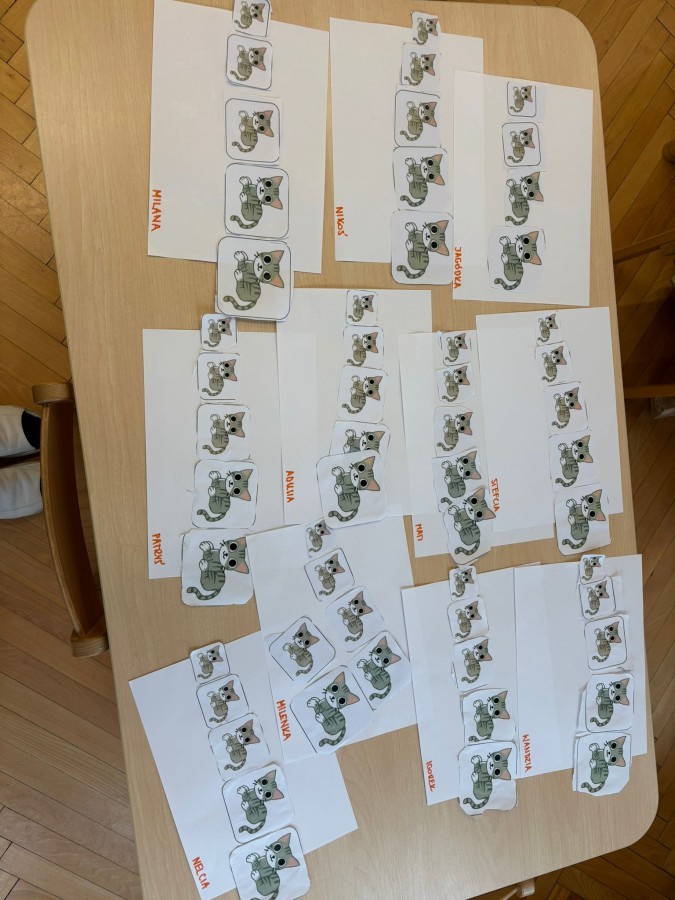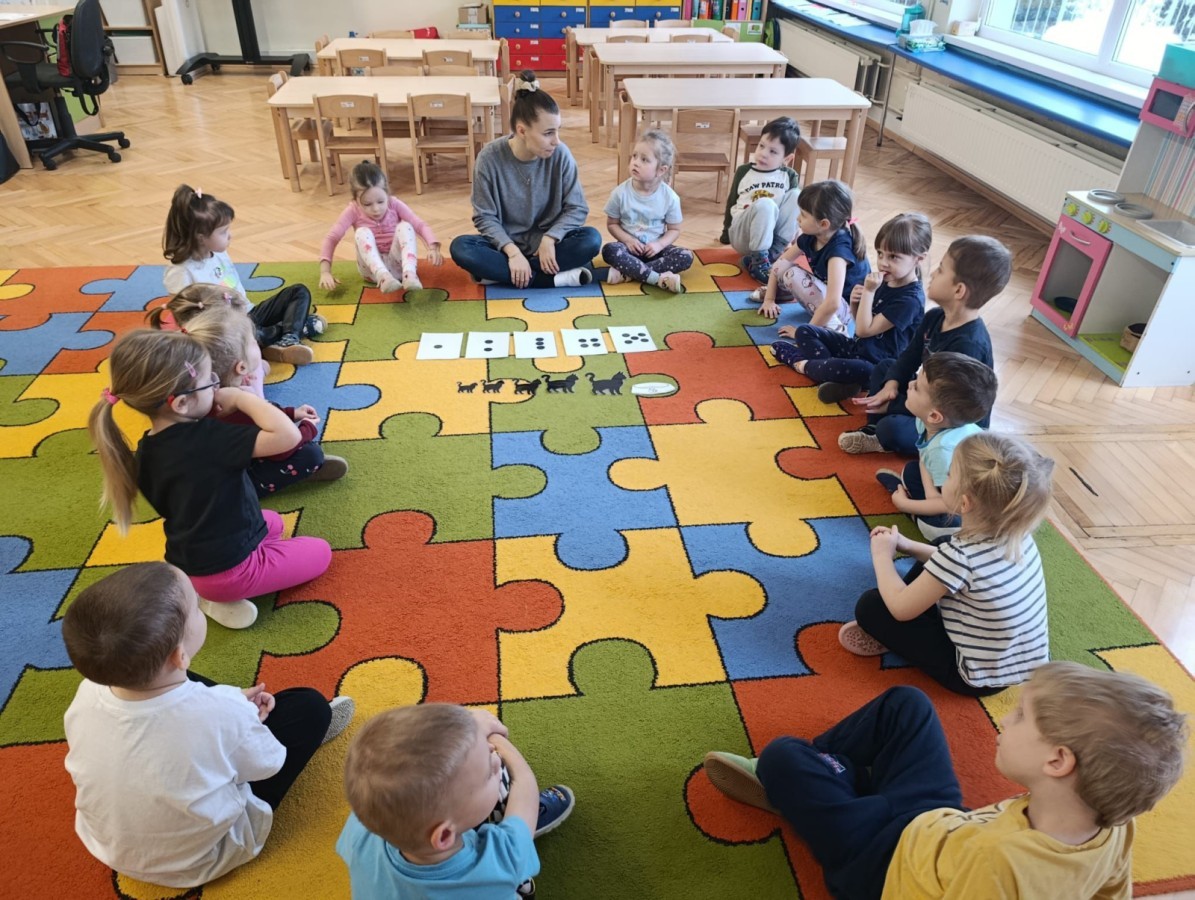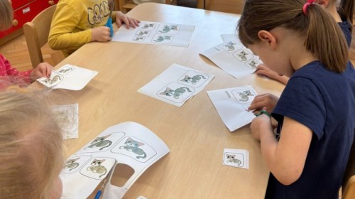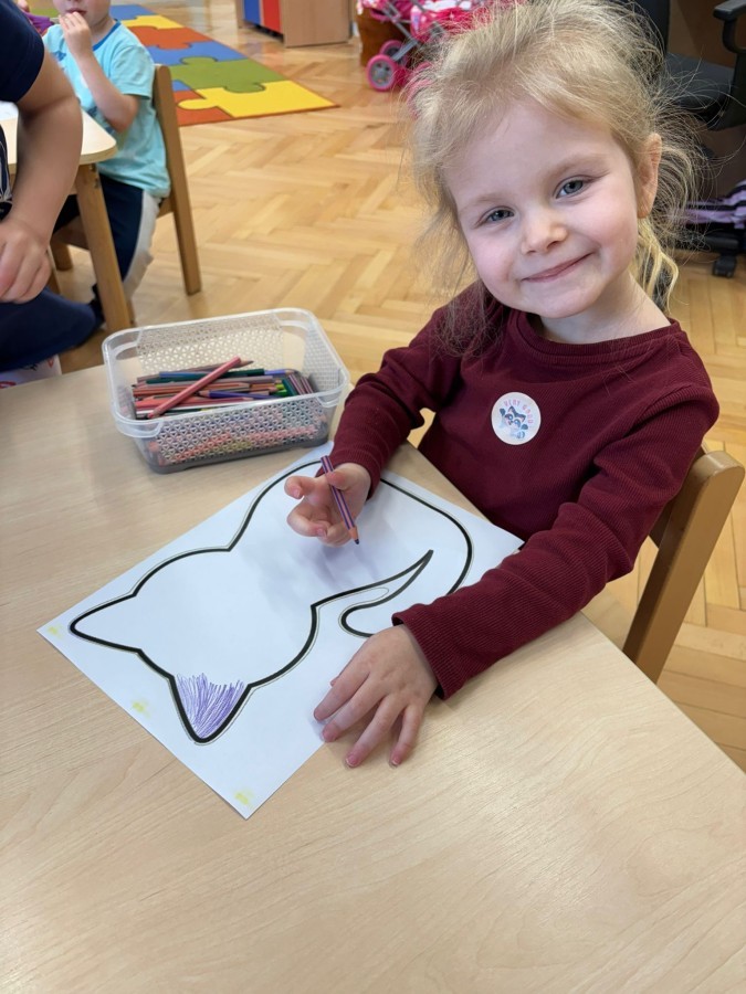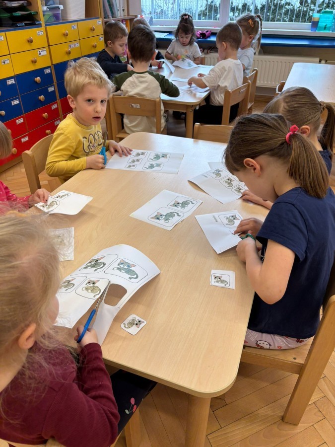 Nie zabrakło również zajęć matematycznych. Dzieci przeliczały kotki, porównywały ich wielkość oraz układały je od najmniejszego do największego. Ćwiczyły przy tym spostrzegawczość i logiczne myślenie. Wykonywały także zadania związane z wycinaniem, doskonaląc swoje umiejętności manualne.