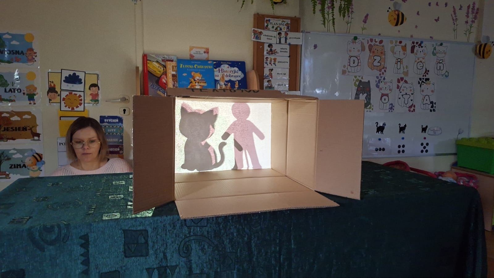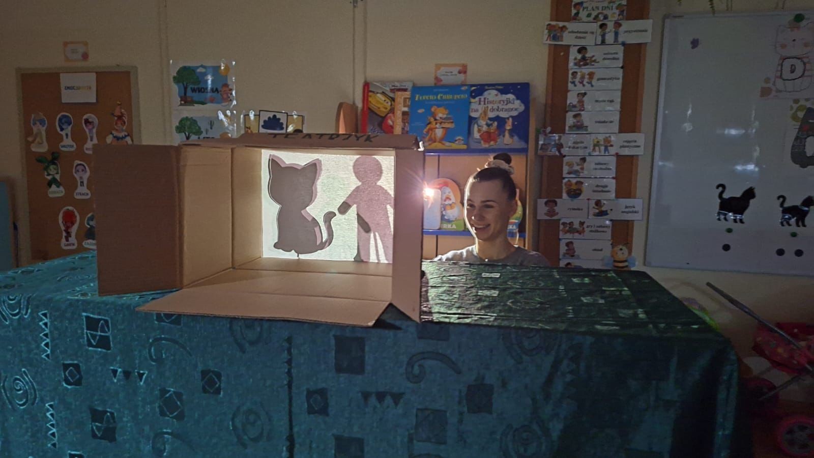 Na początek przedszkolaki obejrzały teatrzyk cieni pt. „Kot w butach”, przygotowany przez nasze Panie. Tajemnicza atmosfera, gra świateł i cieni oraz znana opowieść wzbudziły w dzieciach ogromne zainteresowanie i zachwyt.