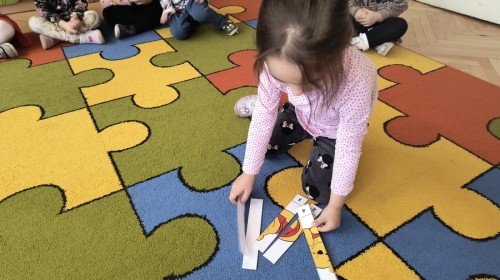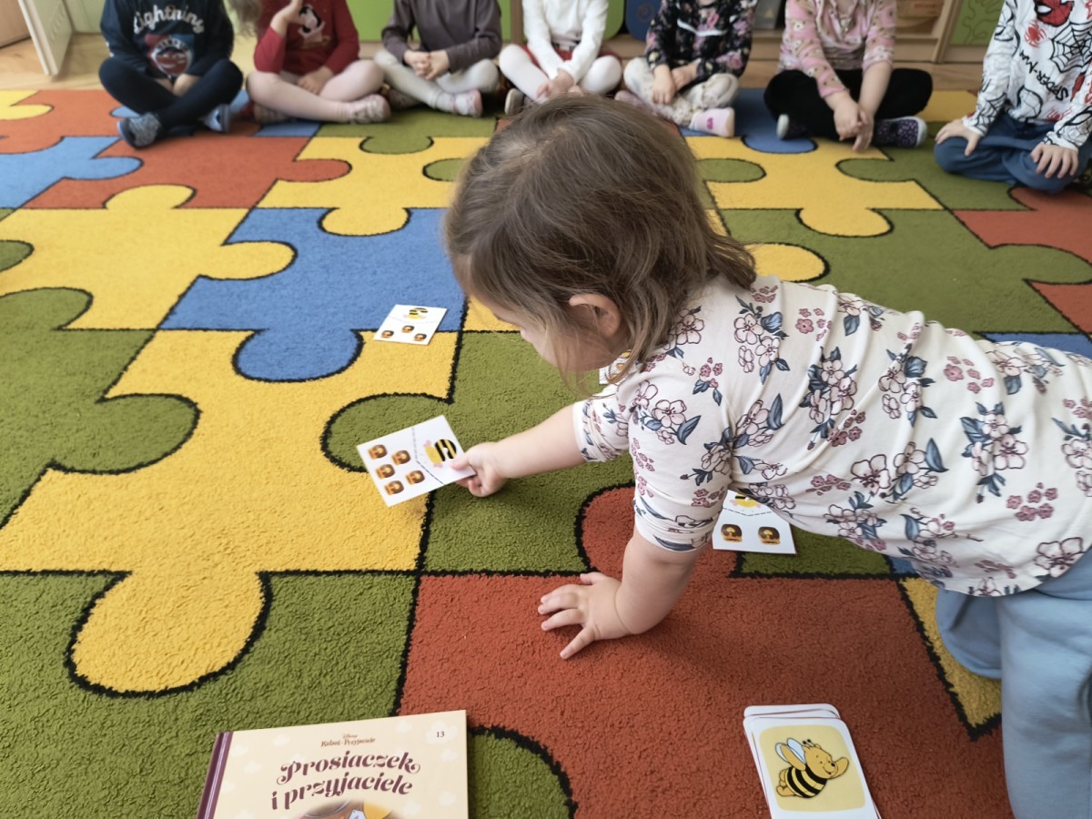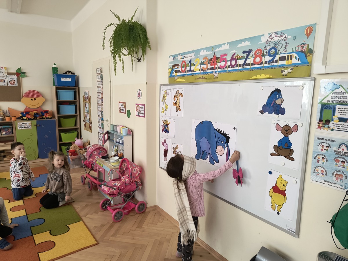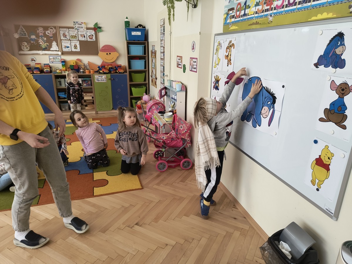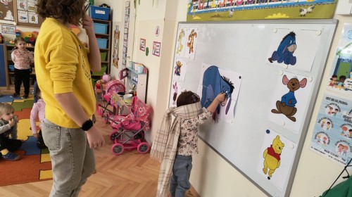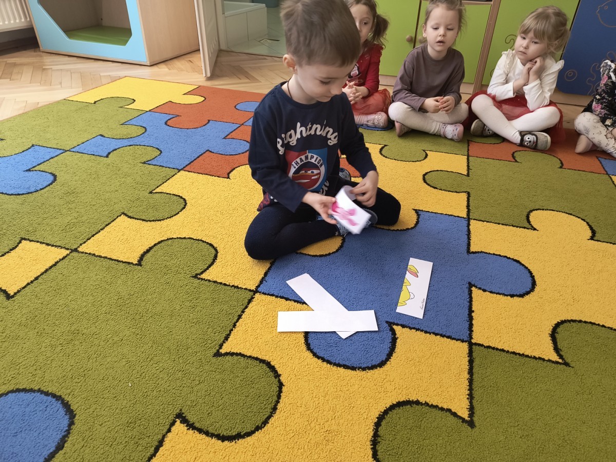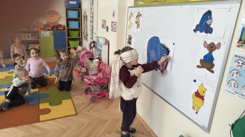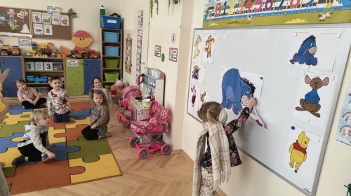 Przedszkolaki rozwiązywały również zagadki dotyczące przyjaciół ze Stumilowego Lasu, układały puzzle, wykonywały prace plastyczne związane z Kubusiem. To był prawdziwie Kubusiowy dzień! Uśmiech zagościł na buzi każdego przedszkolaka.