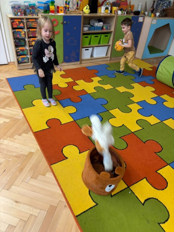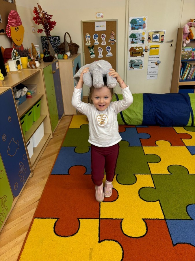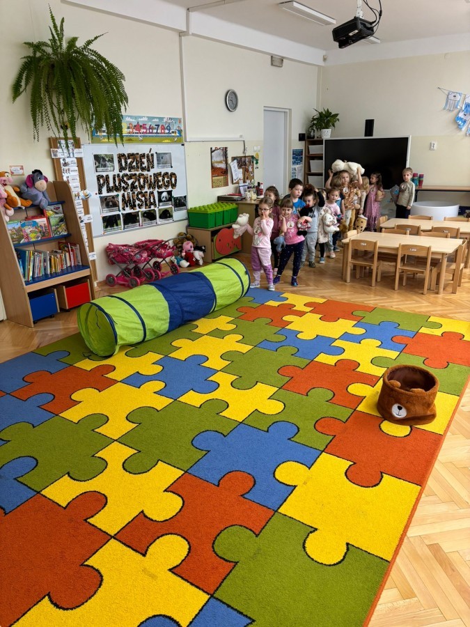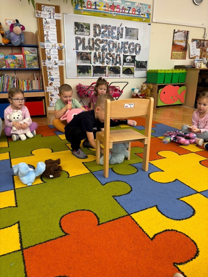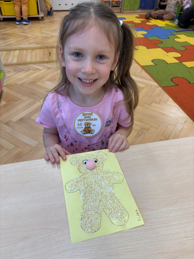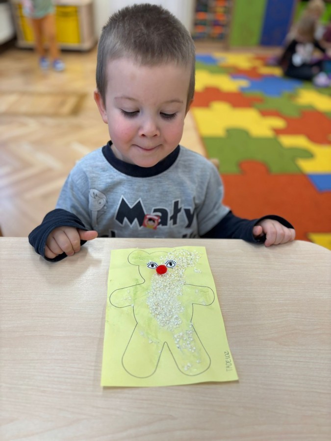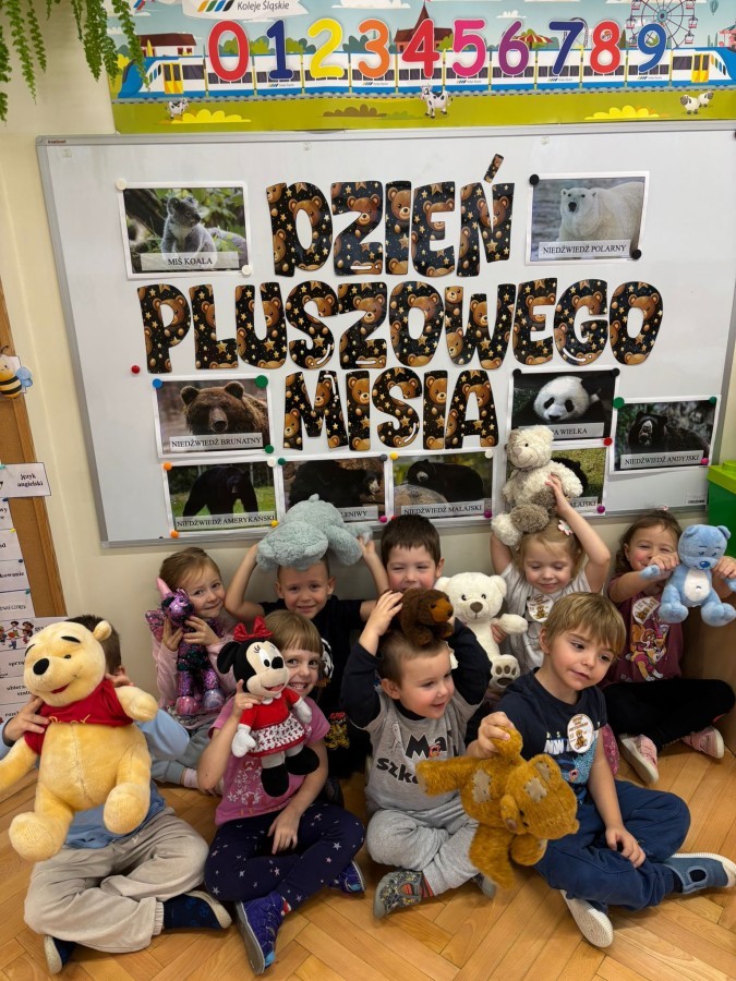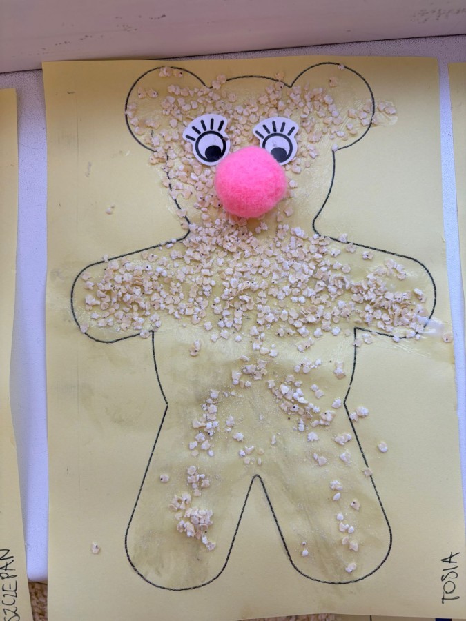 25 listopada świętowaliśmy Dzień Pluszowego Misia. Dzieci wykonały prace plastyczne, wysypując sylwetki misiów płatkami jaglanymi, a także uczestniczyły w torze przeszkód z misiem, ćwicząc równowagę i koordynację.