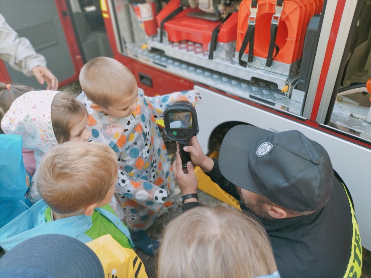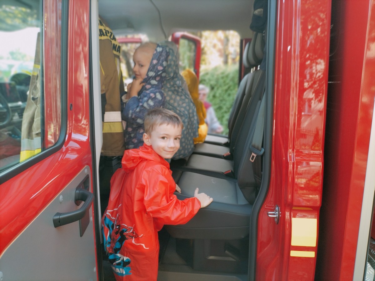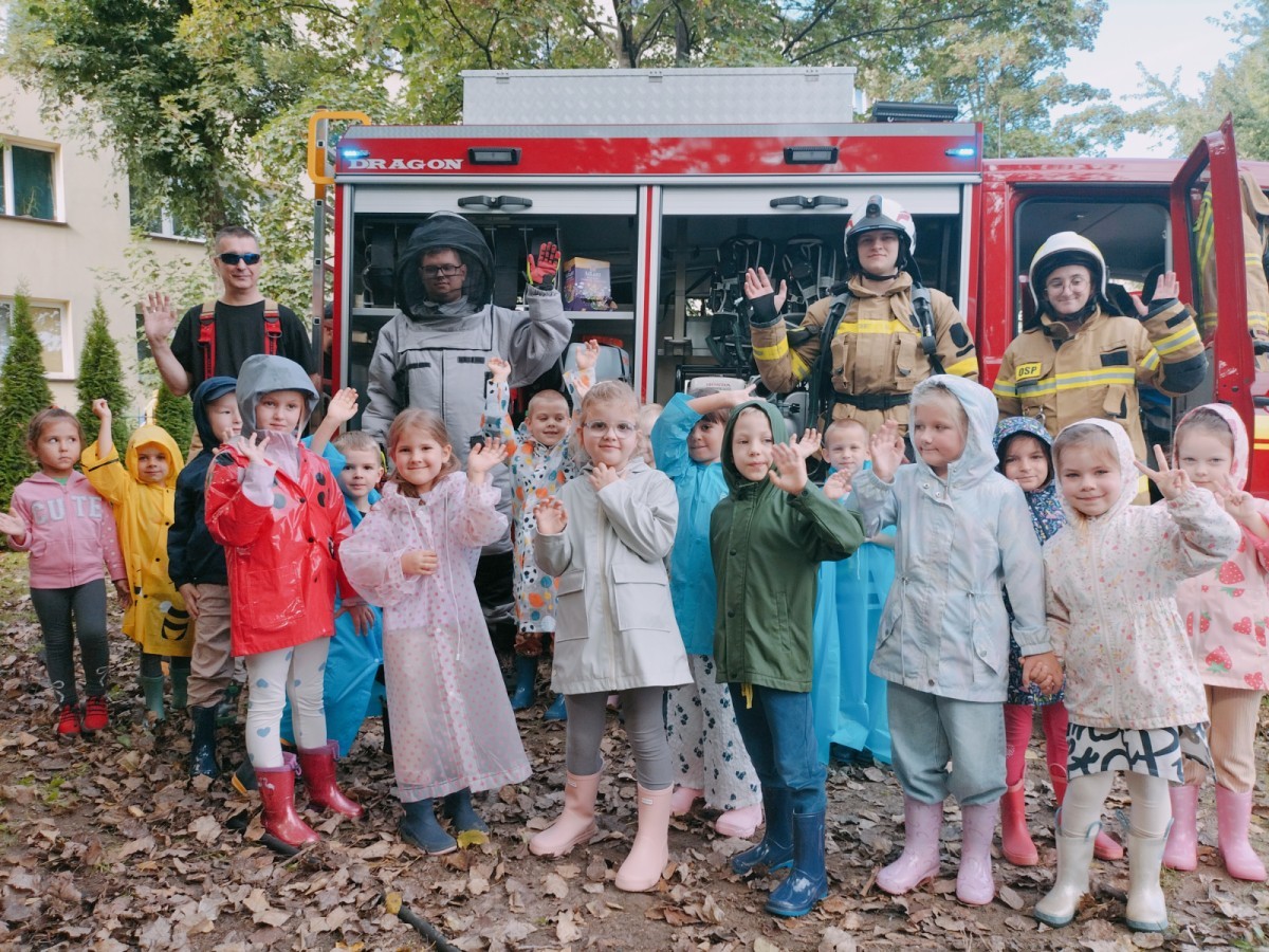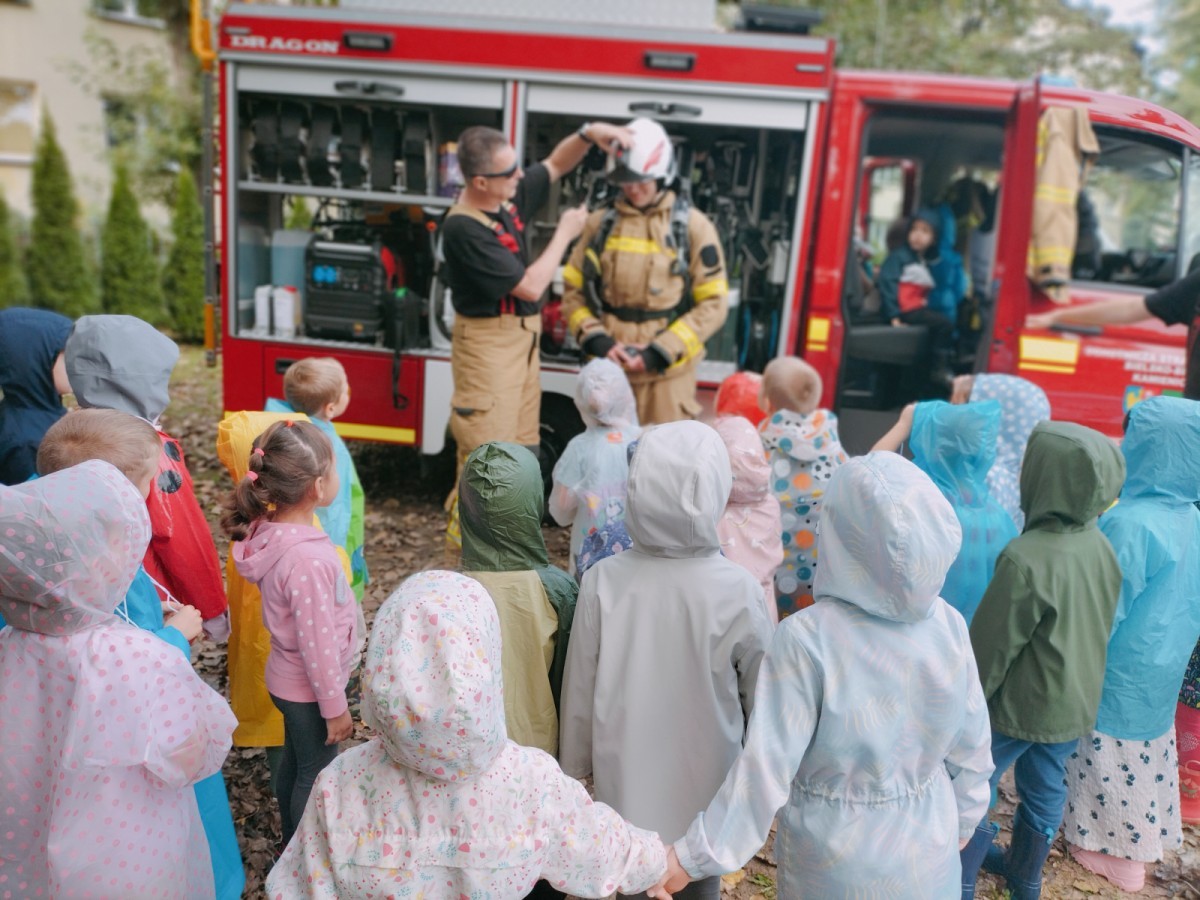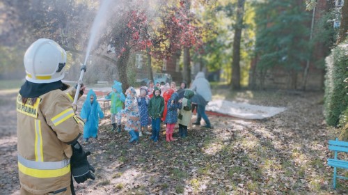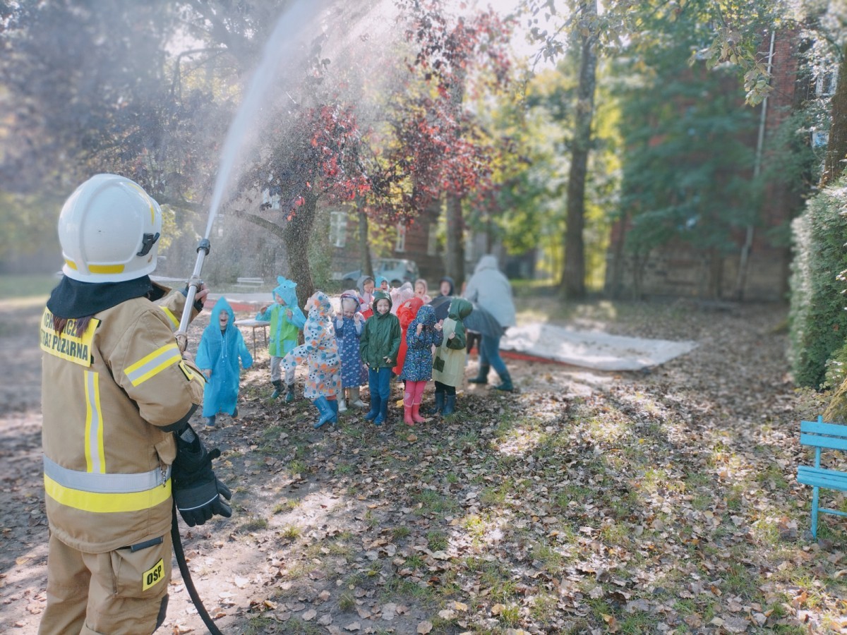 Największą atrakcją okazało się jednak spotkanie ze strażakami w ogrodzie przedszkolnym 🚒👩🚒👨🚒. Dzieci dowiedziały się, jak wygląda codzienna praca strażaka, poznały ekwipunek i mogły dokładnie obejrzeć wyposażenie wozu strażackiego. Każdy chętny przedszkolak mógł przymierzyć kask i usiąść we wnętrzu wozu – radości nie było końca! A na zakończenie… prawdziwy hit dnia – prysznic ze strażackiego węża! 💦💦