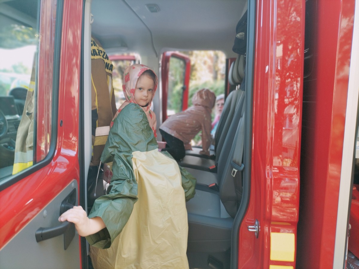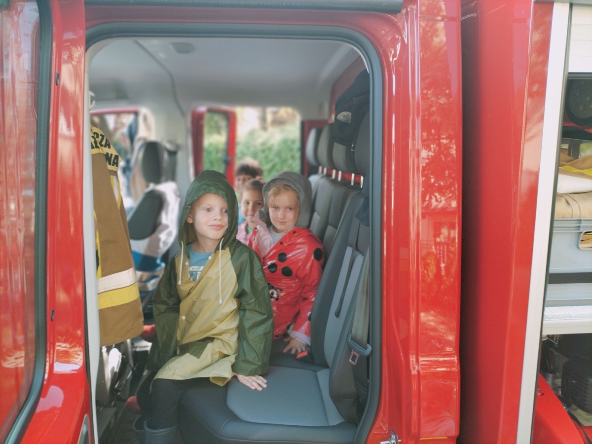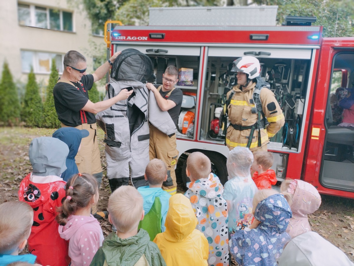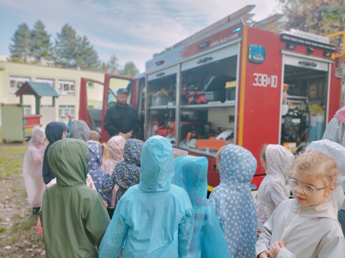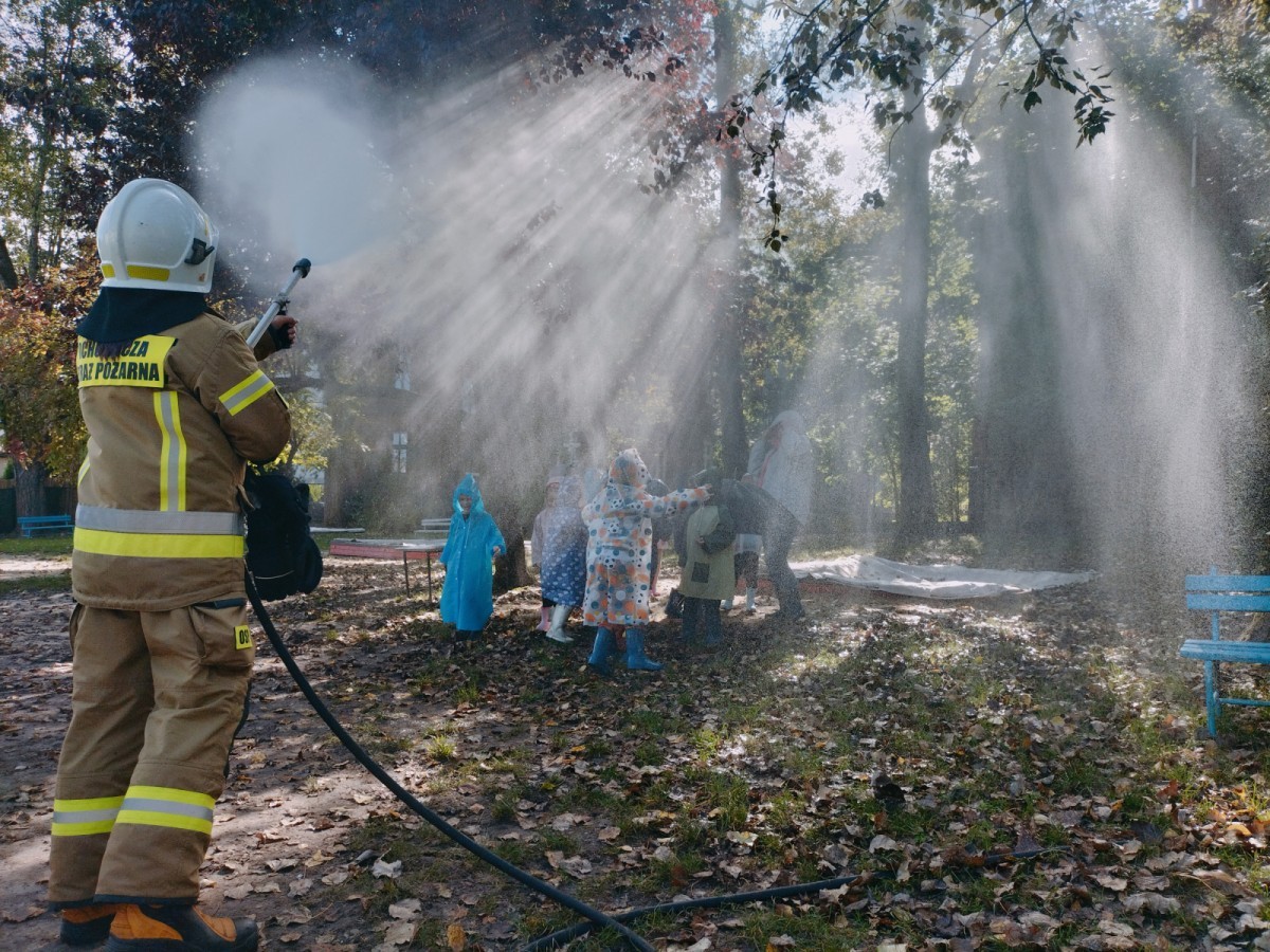 Największą atrakcją okazało się jednak spotkanie ze strażakami w ogrodzie przedszkolnym 🚒👩🚒👨🚒. Dzieci dowiedziały się, jak wygląda codzienna praca strażaka, poznały ekwipunek i mogły dokładnie obejrzeć wyposażenie wozu strażackiego. Każdy chętny przedszkolak mógł przymierzyć kask i usiąść we wnętrzu wozu – radości nie było końca! A na zakończenie… prawdziwy hit dnia – prysznic ze strażackiego węża! 💦💦