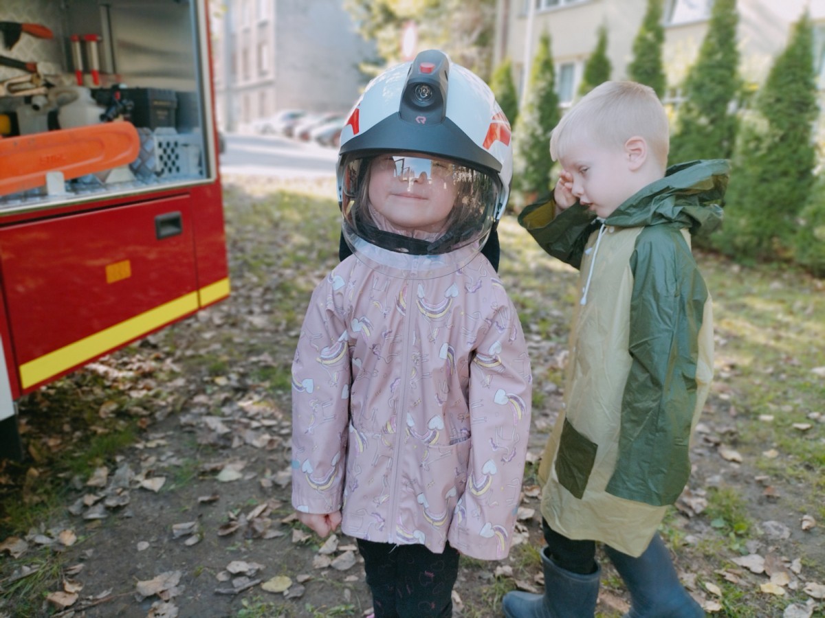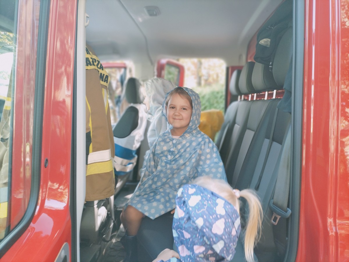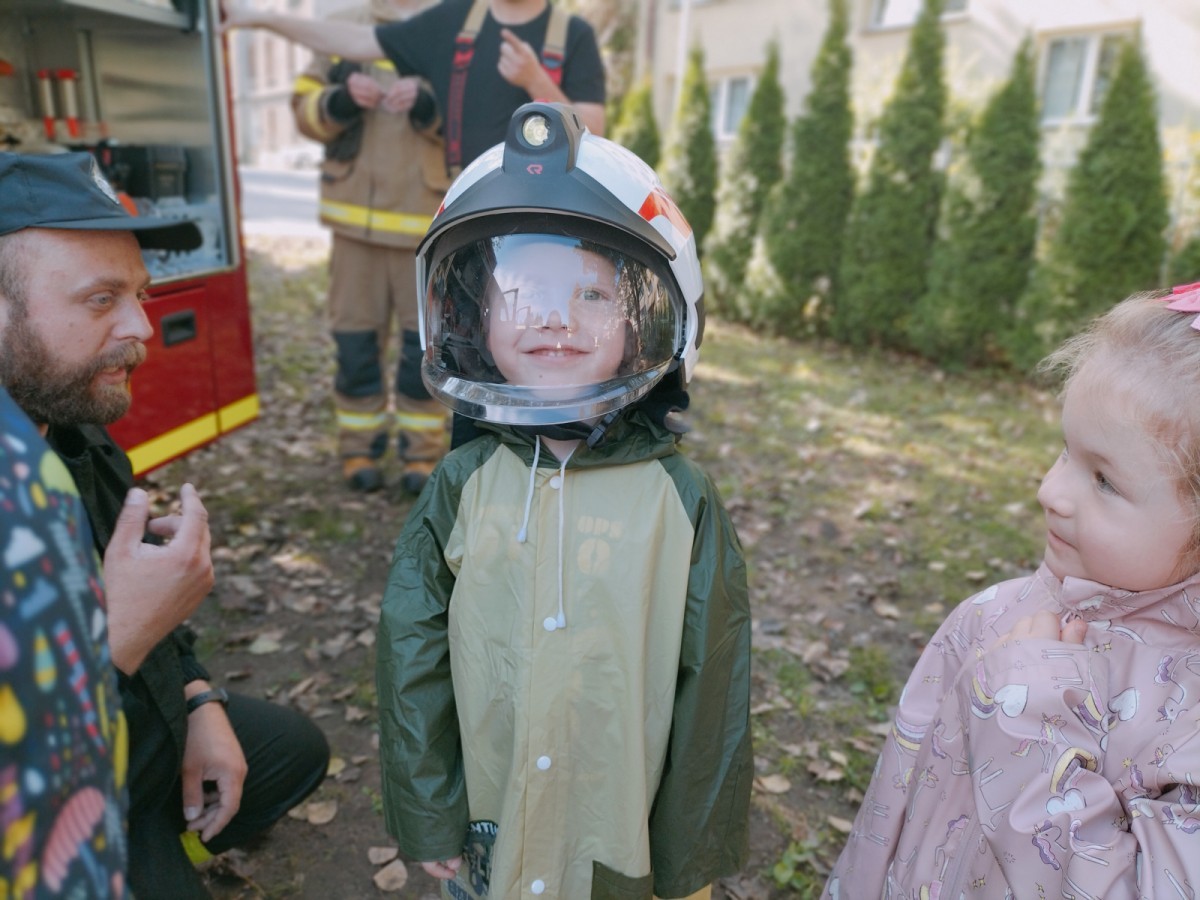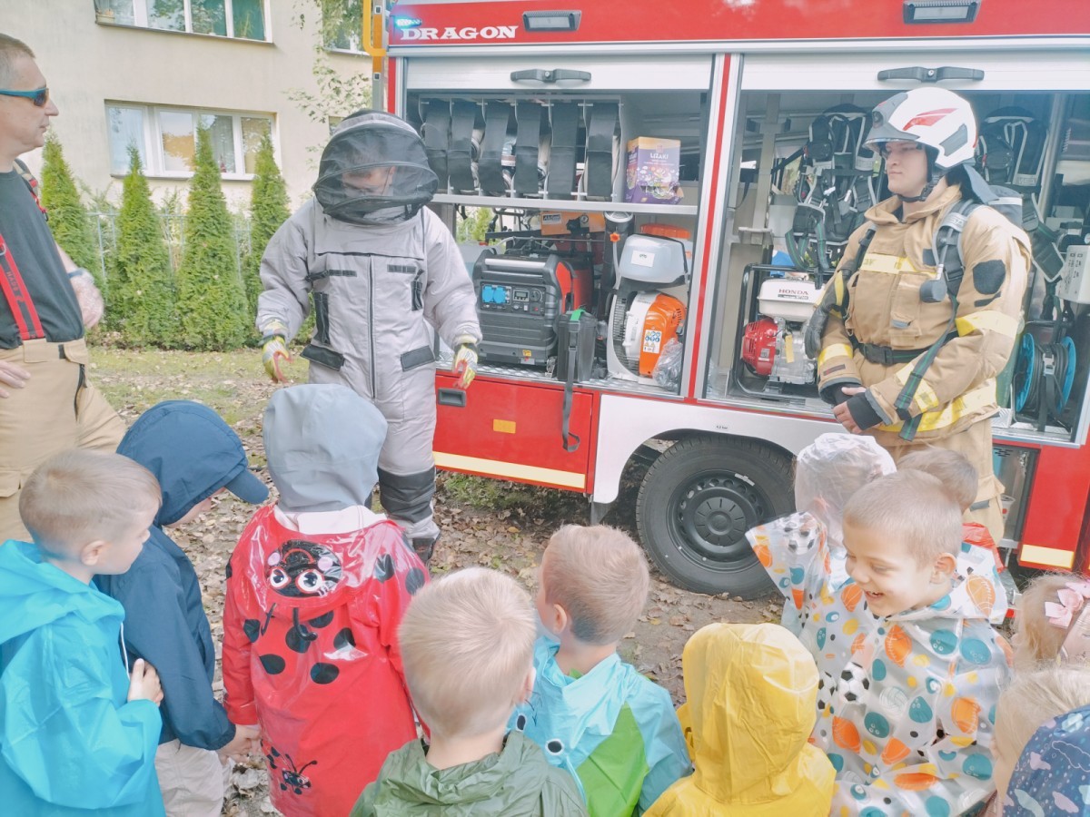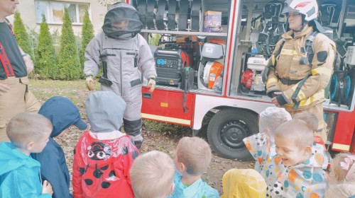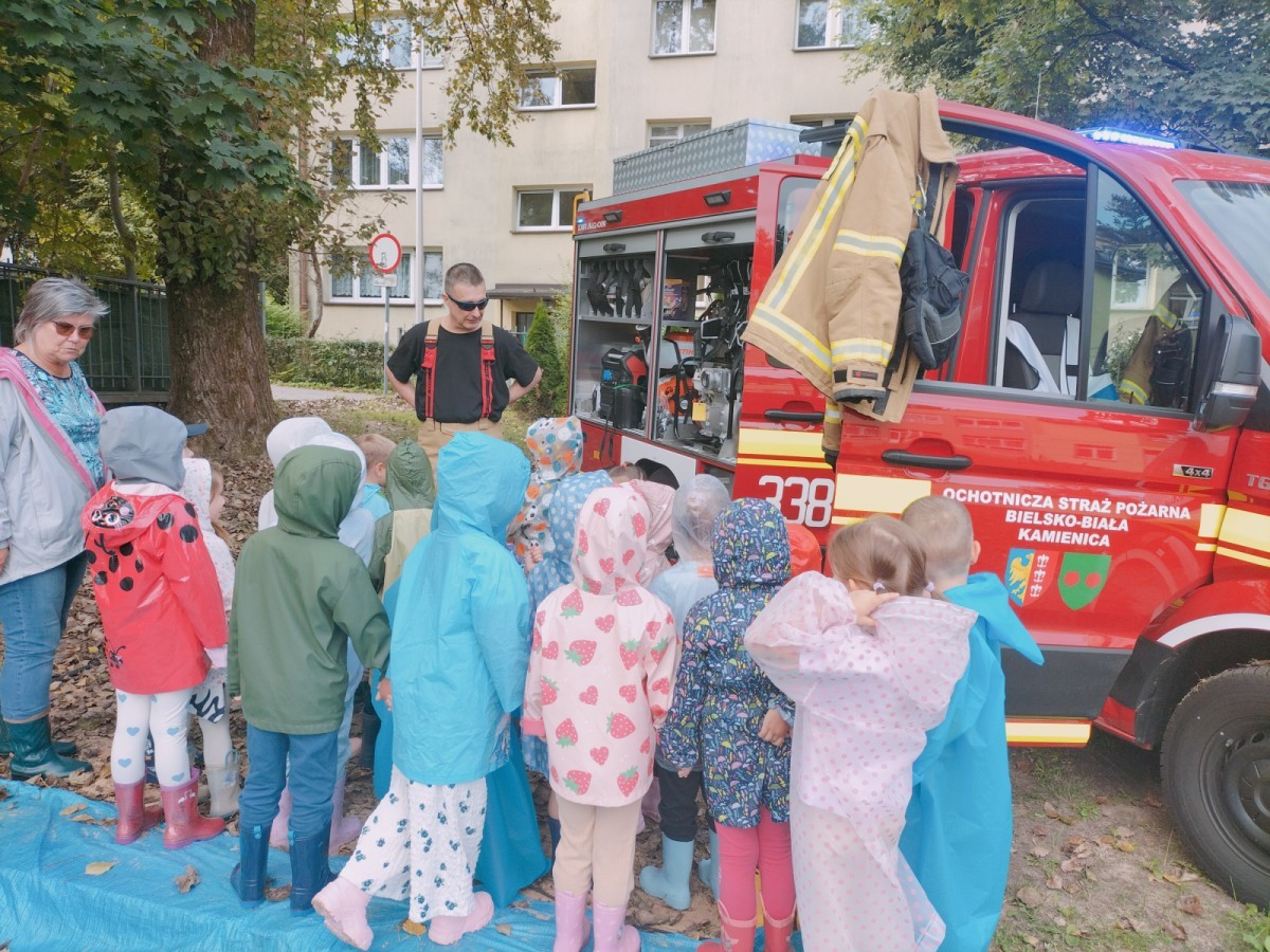 Największą atrakcją okazało się jednak spotkanie ze strażakami w ogrodzie przedszkolnym 🚒👩🚒👨🚒. Dzieci dowiedziały się, jak wygląda codzienna praca strażaka, poznały ekwipunek i mogły dokładnie obejrzeć wyposażenie wozu strażackiego. Każdy chętny przedszkolak mógł przymierzyć kask i usiąść we wnętrzu wozu – radości nie było końca! A na zakończenie… prawdziwy hit dnia – prysznic ze strażackiego węża! 💦💦