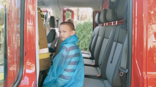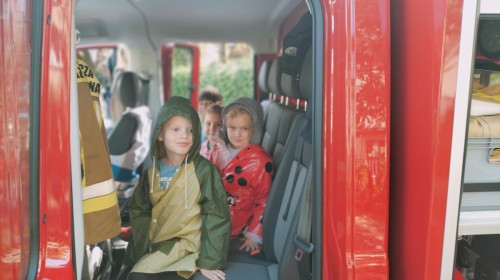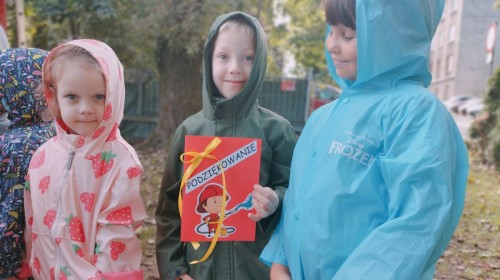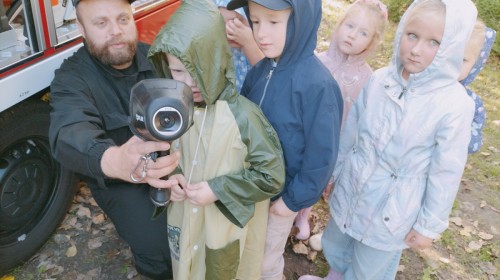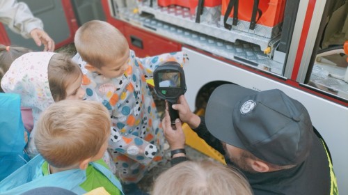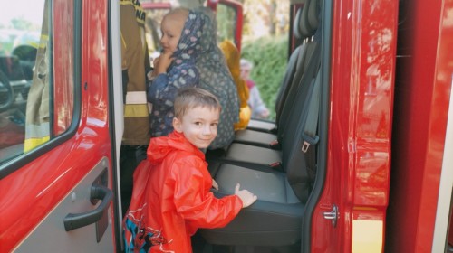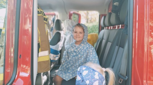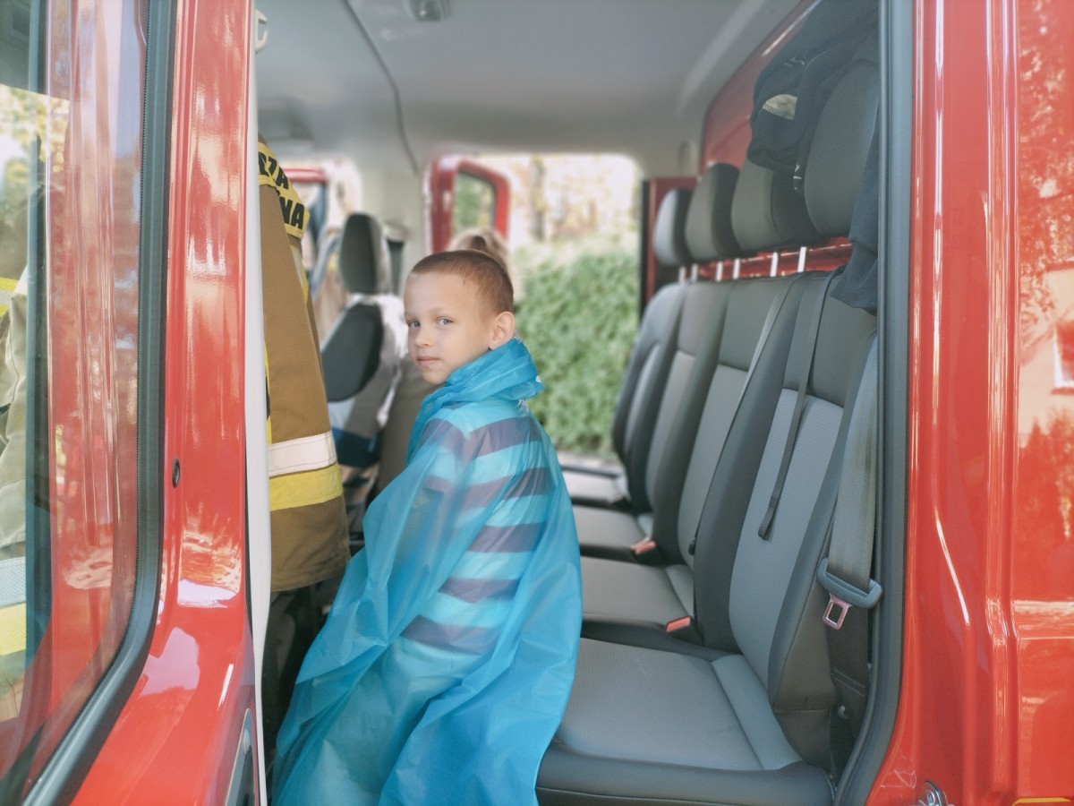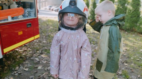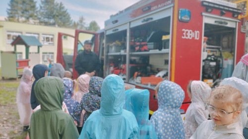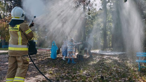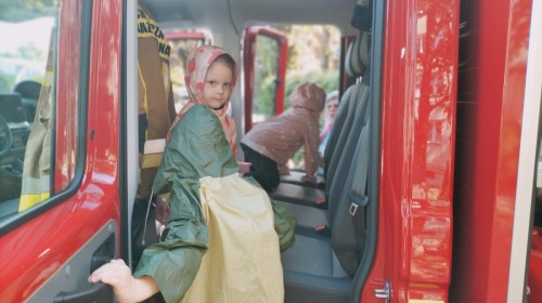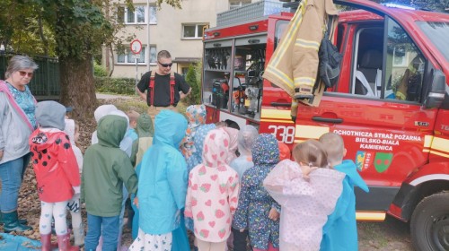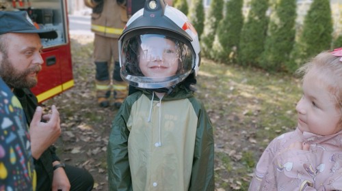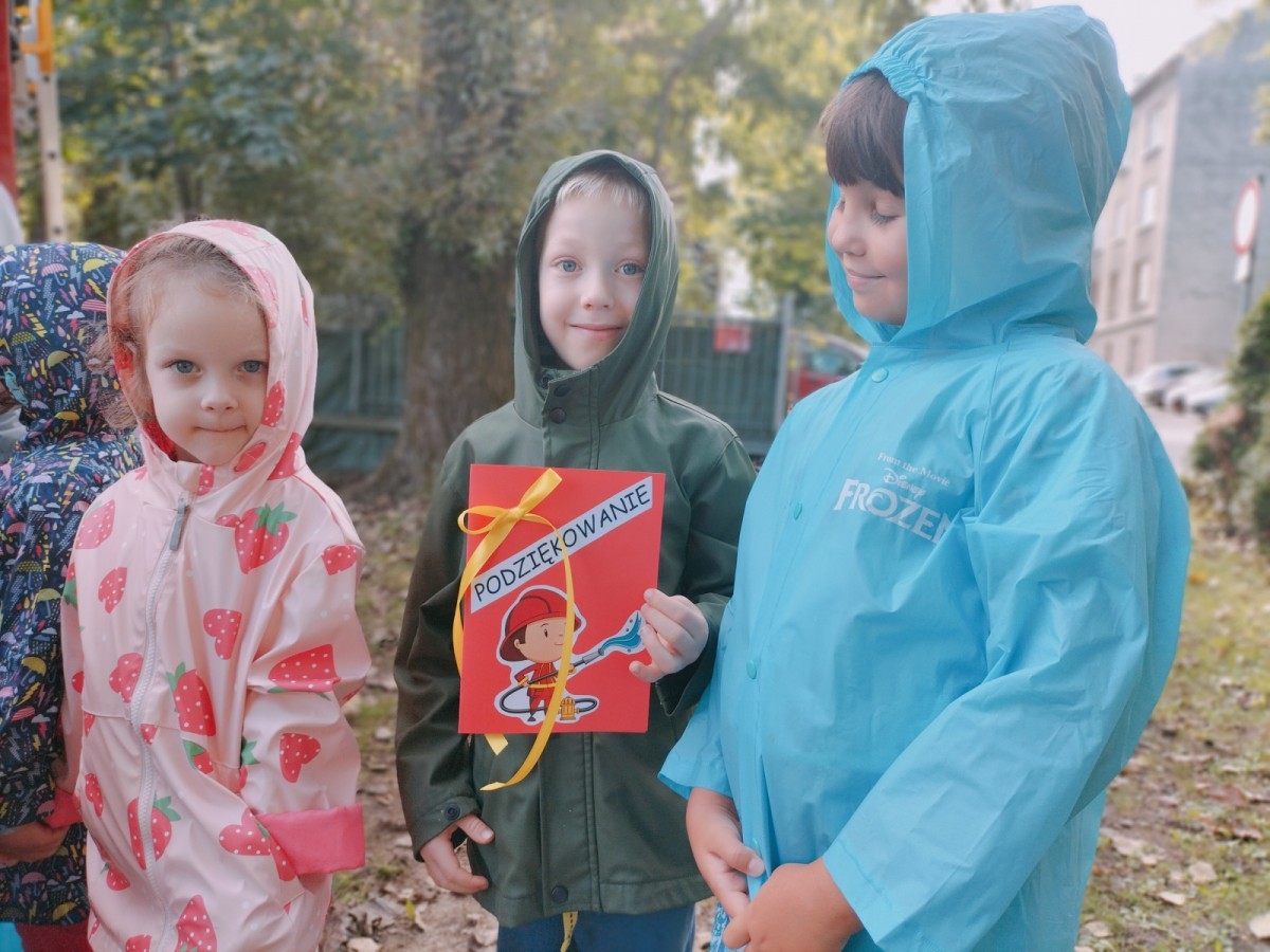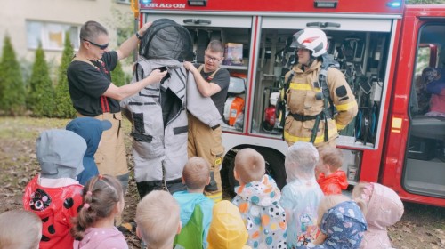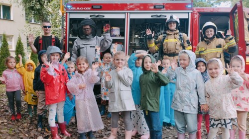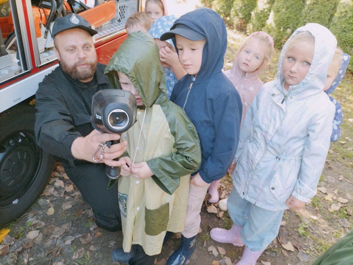 Największą atrakcją okazało się jednak spotkanie ze strażakami w ogrodzie przedszkolnym 🚒👩🚒👨🚒. Dzieci dowiedziały się, jak wygląda codzienna praca strażaka, poznały ekwipunek i mogły dokładnie obejrzeć wyposażenie wozu strażackiego. Każdy chętny przedszkolak mógł przymierzyć kask i usiąść we wnętrzu wozu – radości nie było końca! A na zakończenie… prawdziwy hit dnia – prysznic ze strażackiego węża! 💦💦