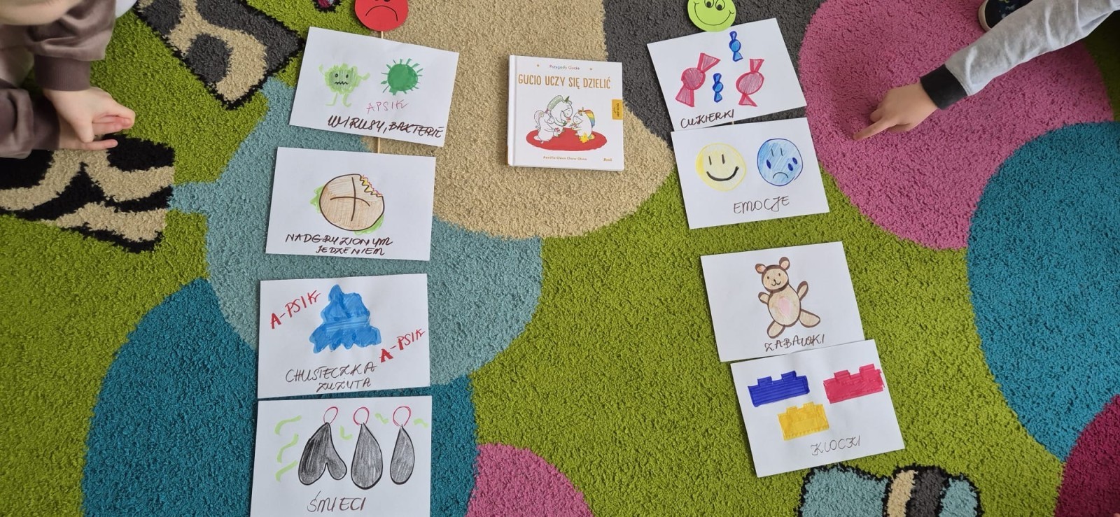 Dzieci uczestniczyły w zajęciach w ramach innowacji pedagogicznej „Gucio uczy się dzielić”, podczas których pracowały z książką Gucio uczy się dzielić.