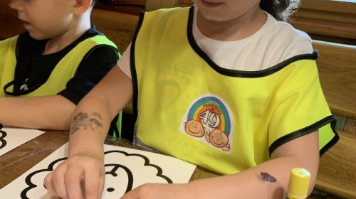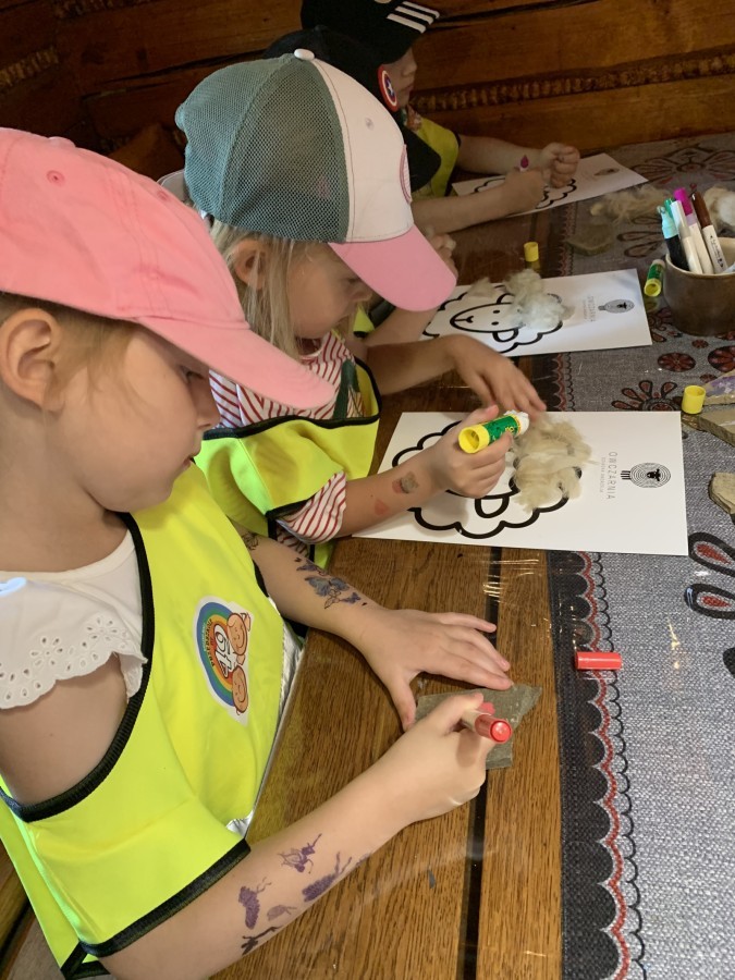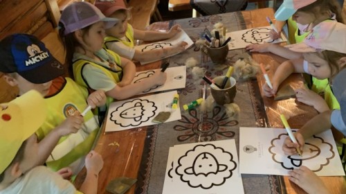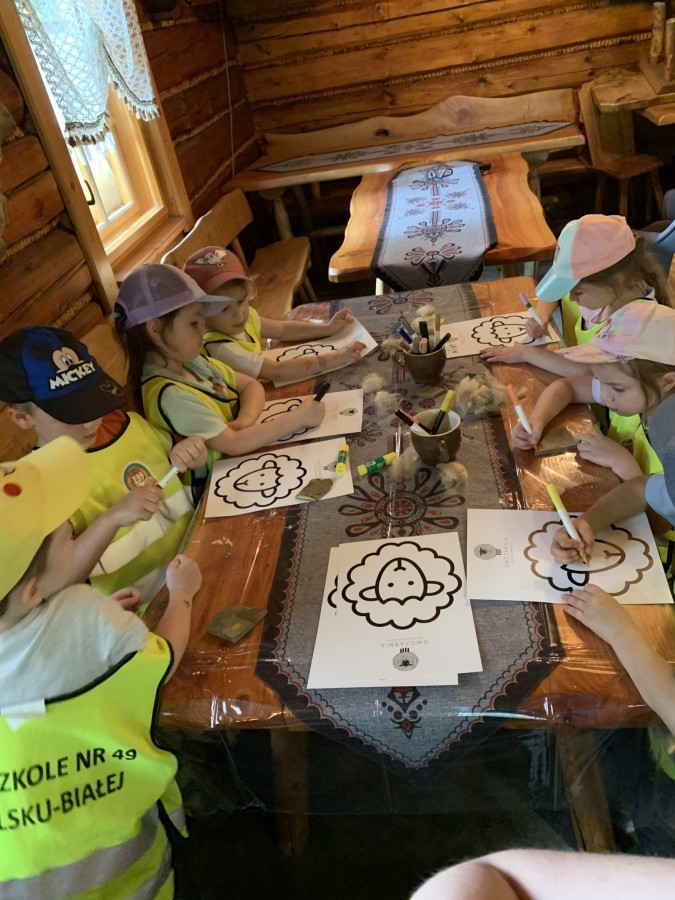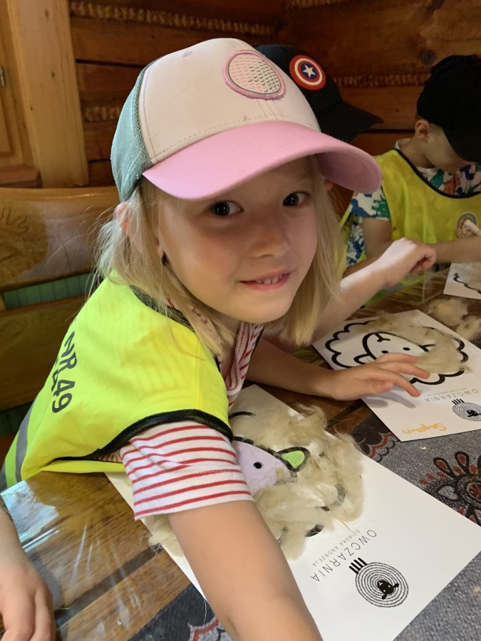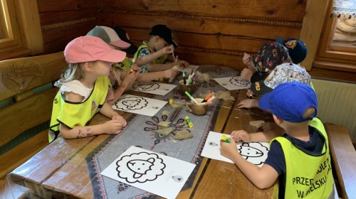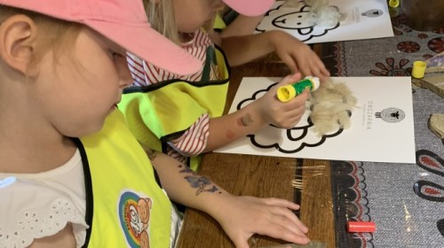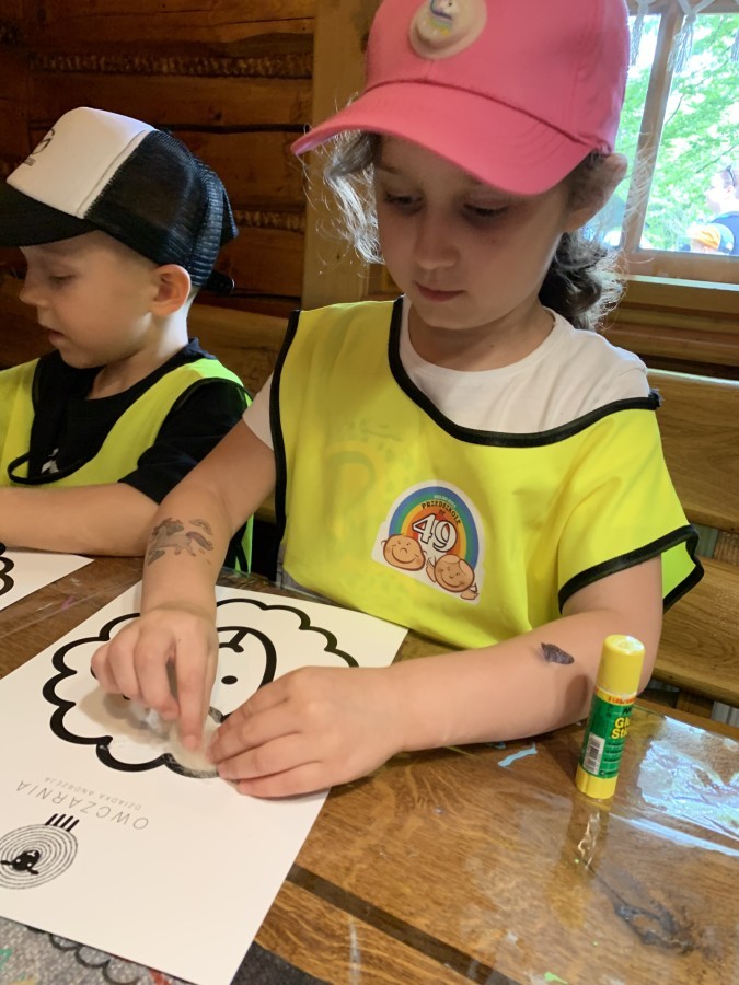 Po chwili odpoczynku nadszedł czas na twórcze działania. Przedszkolaki wyklejały i malowały szablony owiec, tworząc kolorowe i puchate arcydzieła. Nie zabrakło także malowania kamieni – na każdym z nich pojawiły się piękne wzory i uśmiechnięte buzie.