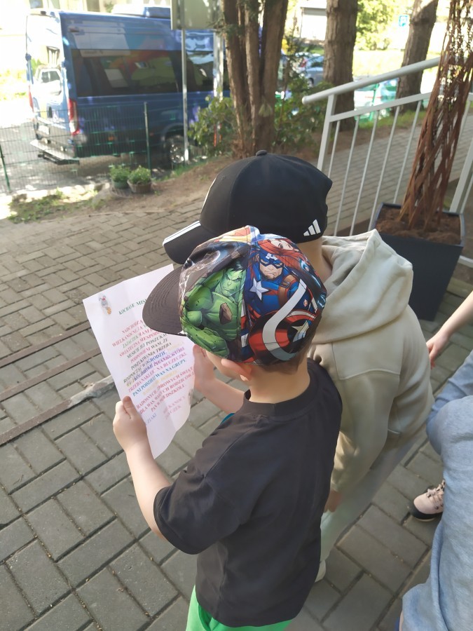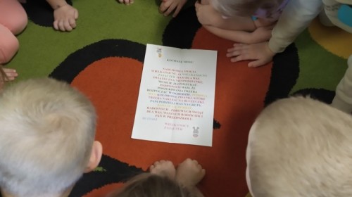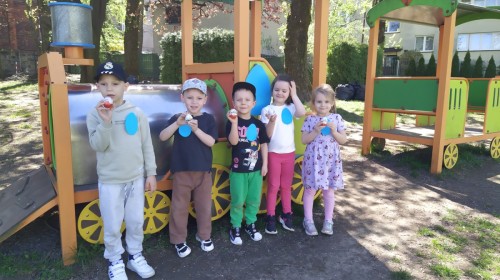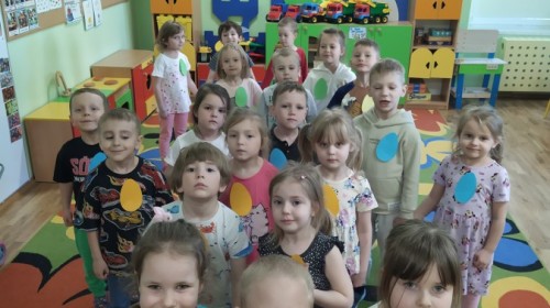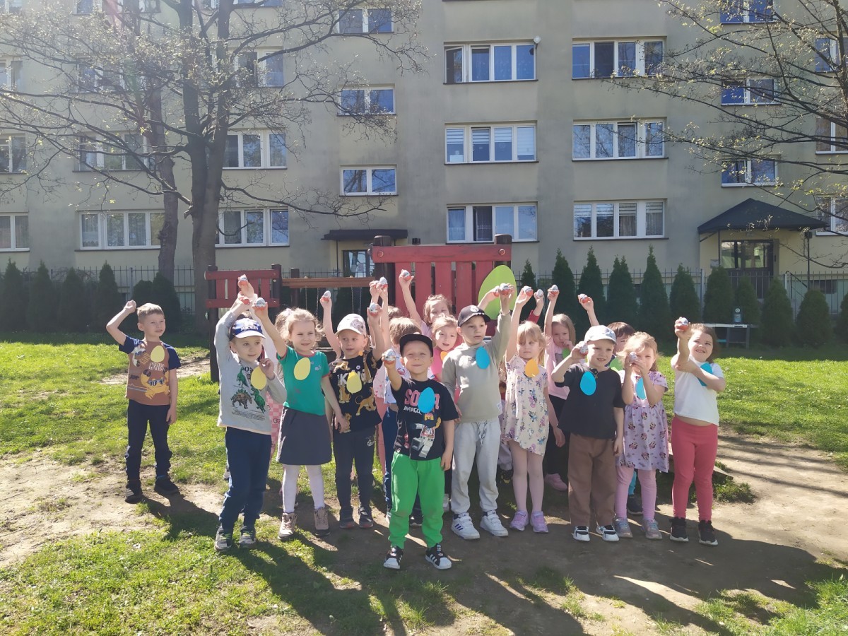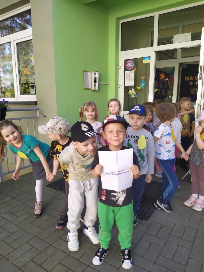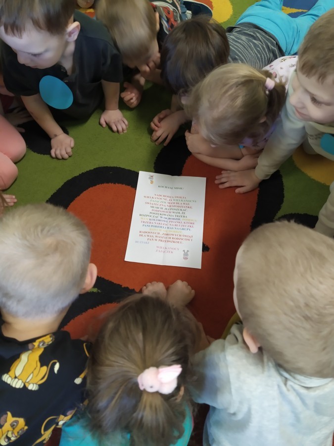 Grupa "Misie" otrzymała list od Wielkanocnego Zajączka, który zaprosił dzieci do poszukiwania niespodzianek w ogrodzie. Każdy mały Miś dostał emblemat- kolorową pisankę. Zadaniem dzieci było odszukanie dużych pisanek w takich samych kolorach i odnalezienie zostawionych przez Zajączka niespodzianek. Radości było wiele, wszystkim udało się wykonać zadanie. Kolorowe strzałki doprowadziły grupę do sali, w której czekały prezenty, zabawki od Zajączka.
