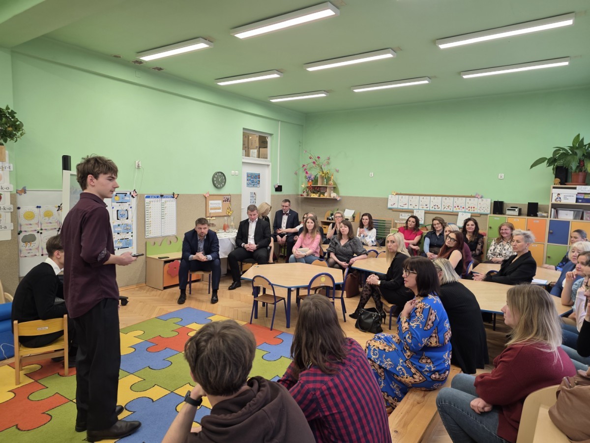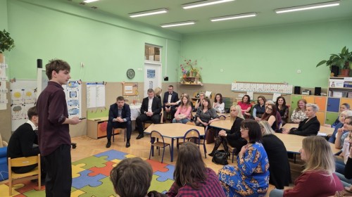 V LO w Bielsku- Białej wraz z w-ce dyrektorem p. Sławomirem Hermą. Zaproszeni goście i nauczyciele wzięli udział w prezentacjach przygotowanych przez uczniów V Liceum Ogólnokształcącego w Bielsku- Białej na temat: „StartoQuest” oraz „CanSat”.