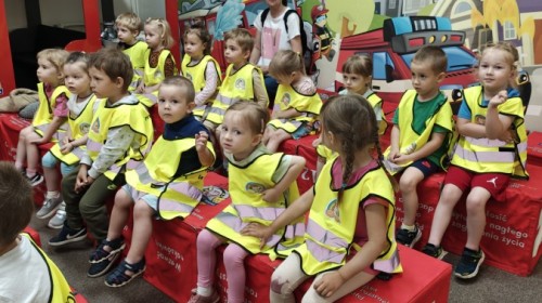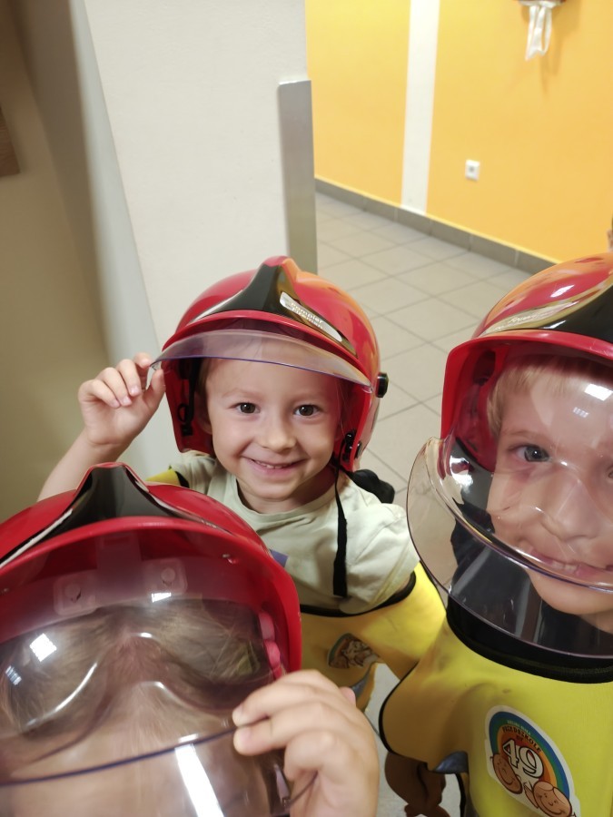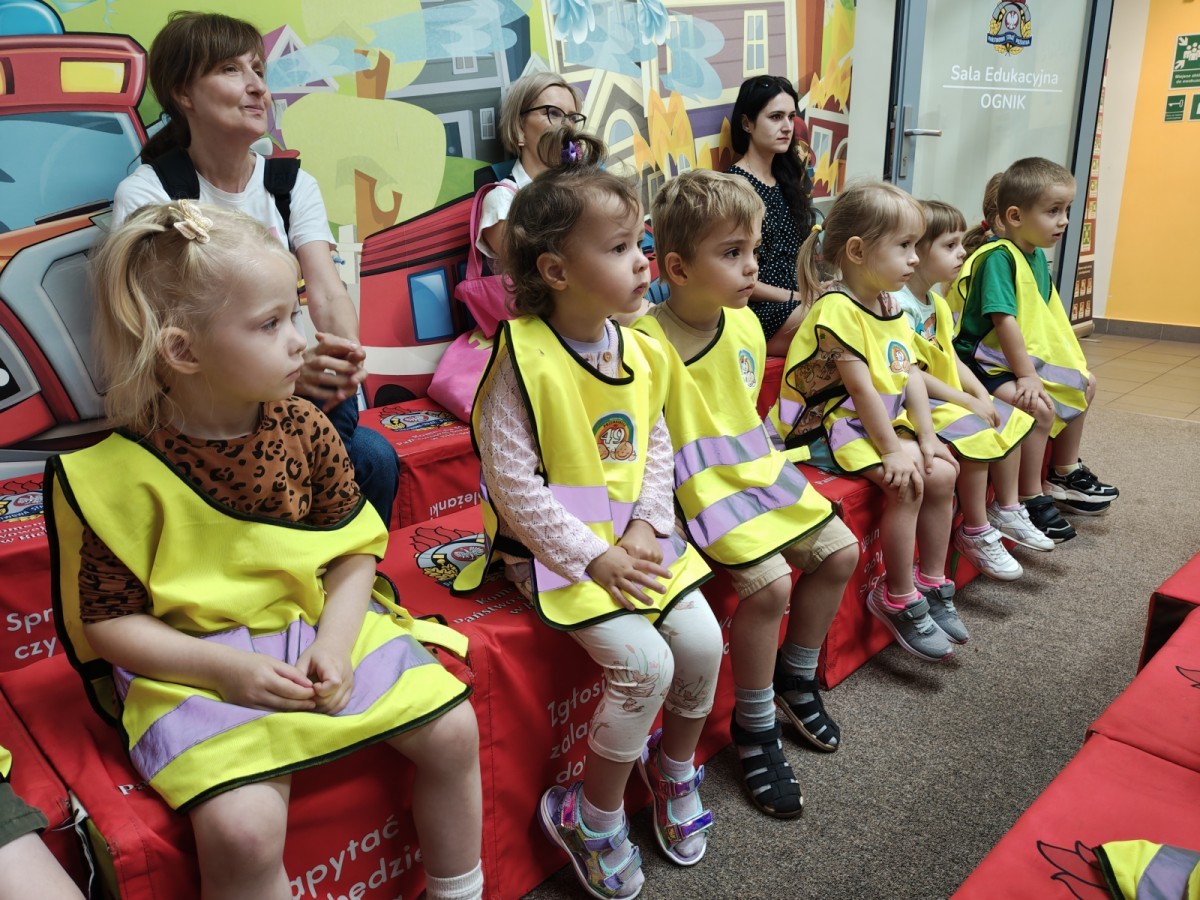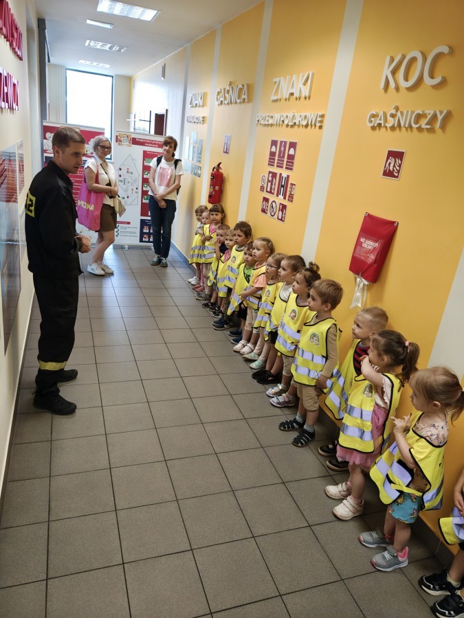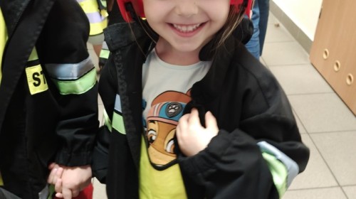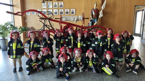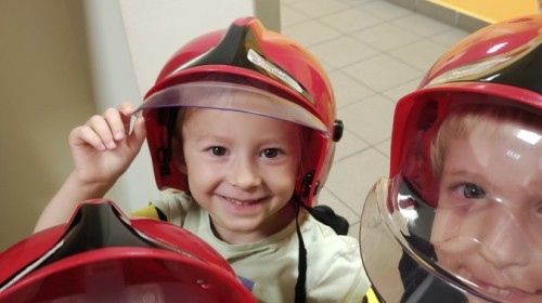 Nasze Przedszkolaki miały okazję poznać specyfikę pracy strażaka, zwiedzić garaż wyposażony w wiele sprzętów i pojazdów specjalistycznych, wziąć udział w zajęciach w sali 'Ognik', a także spróbować swoich sił w zjeździe strażacką rurą.
