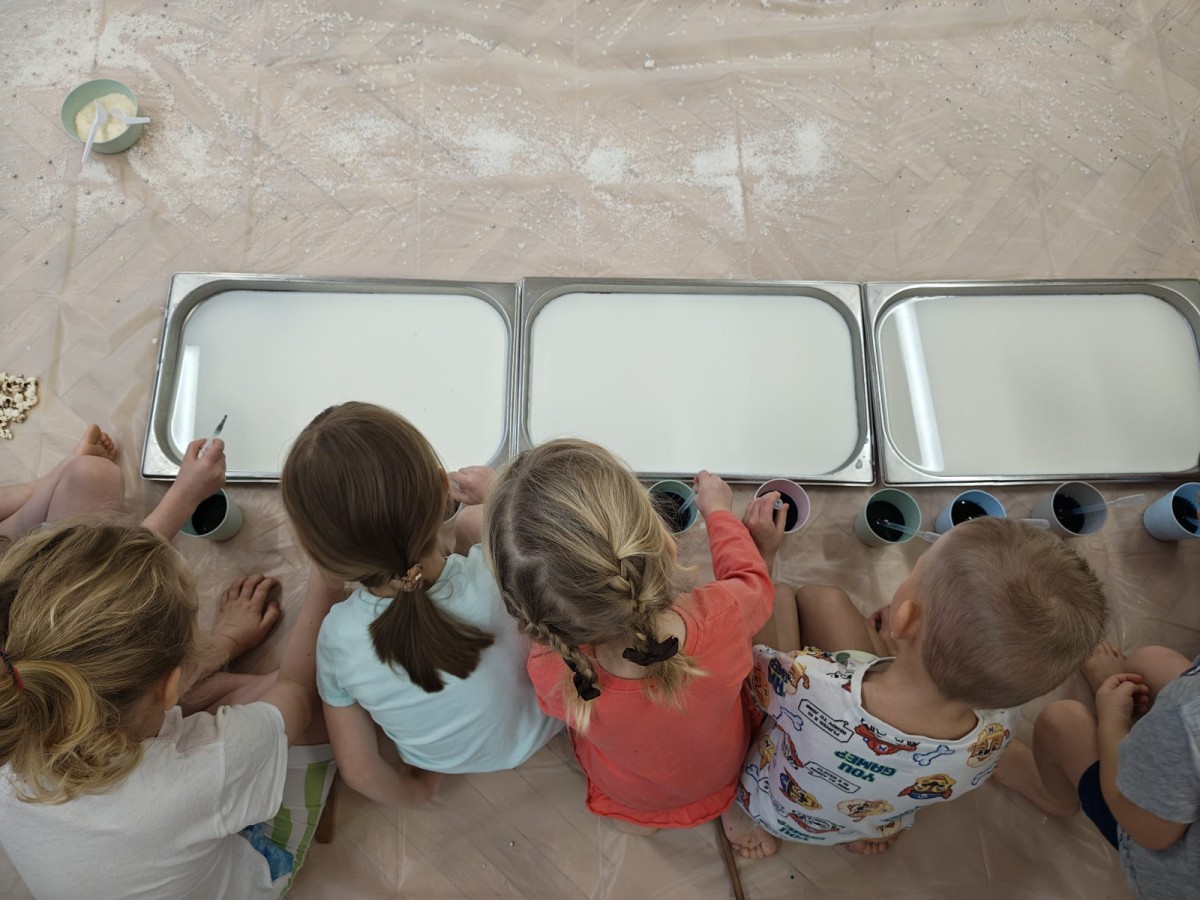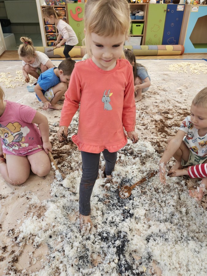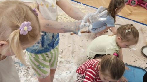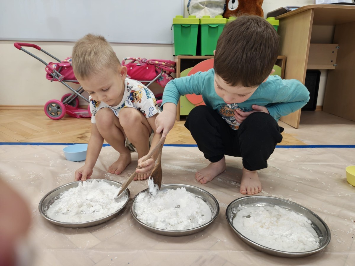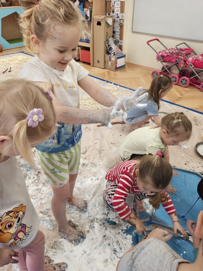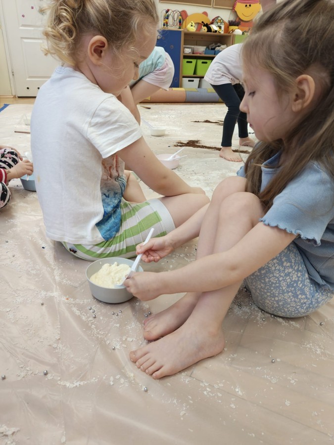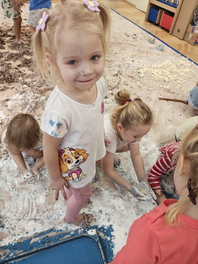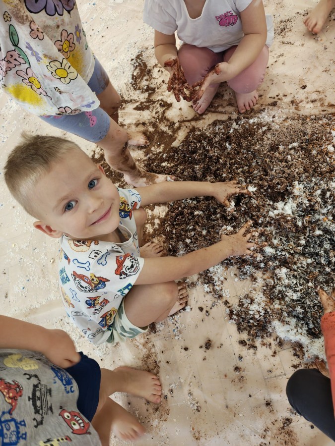 Przedszkolaki mieszały, ugniatały, lepiły i odkrywały nowe faktury, korzystając z naturalnych i bezpiecznych składników. Zabawa sprawiła im ogromną radość – dzieci świetnie się bawiły, rozwijając przy tym wyobraźnię oraz motorykę małą.