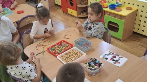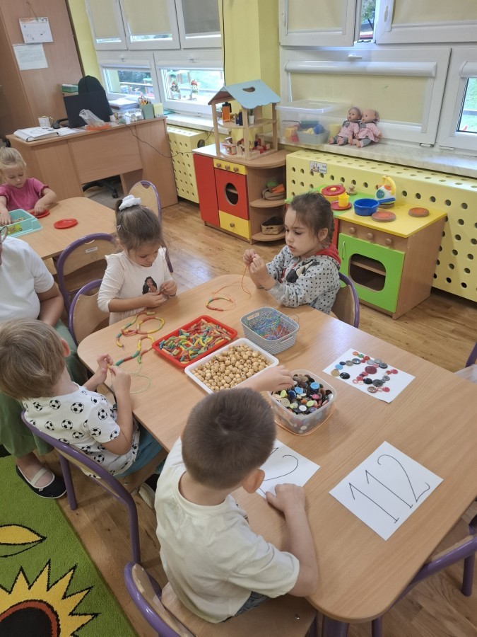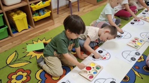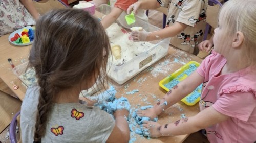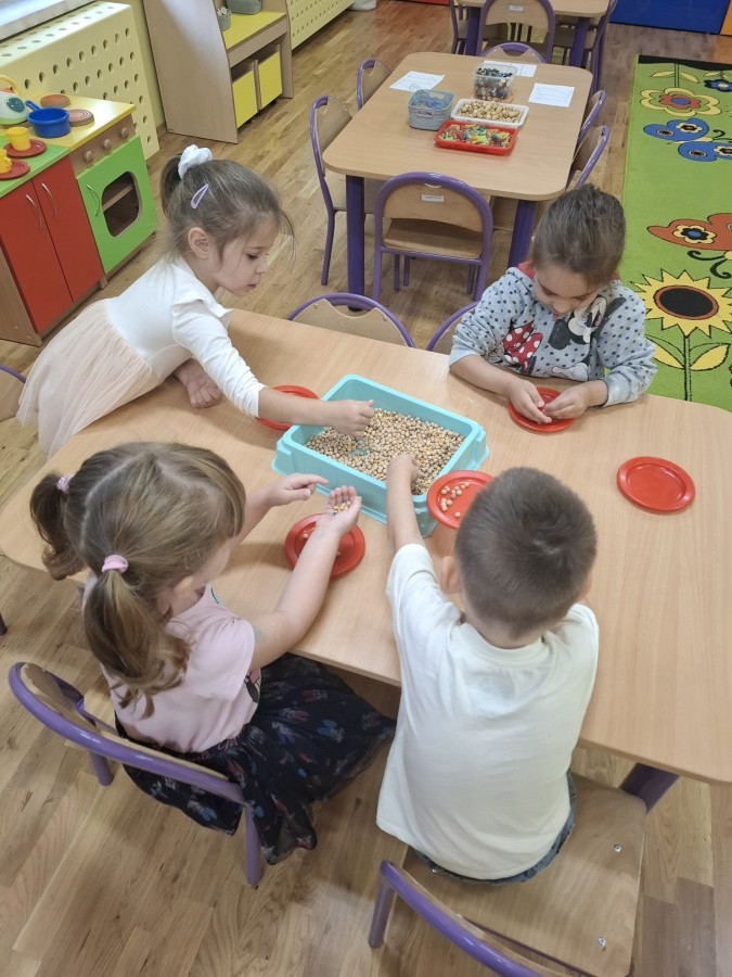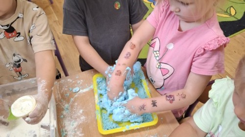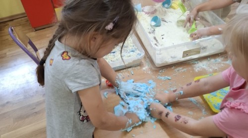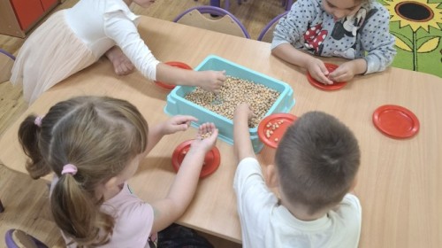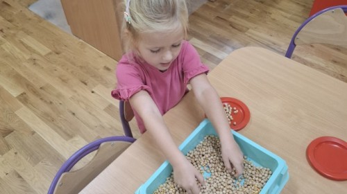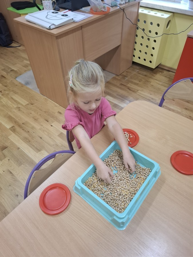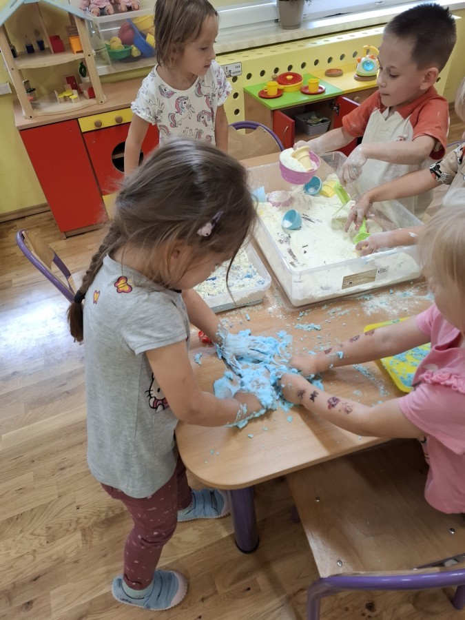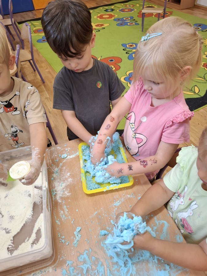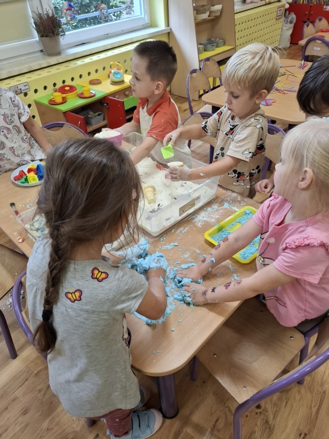 W grupie „ Muchomorki” organizowane są zabawy sensoryczne angażujące zmysły przedszkolaków i sprzyjające rozwijaniu motoryki małej. Dzieci doświadczają różnych faktur, tekstur, mogą przesypywać, ugniatać, wąchać. Wszystko to odbywa się przy dźwiękach muzyki relaksacyjnej co sprzyja nie tylko miłym doznaniom słuchowym ale uspokaja system nerwowy. Zabawy z wykorzystaniem piasku kinestetycznego, mąki, ciastoliny, materiałów sypkich: jak ciecierzyca, groch, barwiony makaron, pianka do kąpieli i inne sprawia dzieciom wiele radości a przy tym rozwija ich umiejętności.