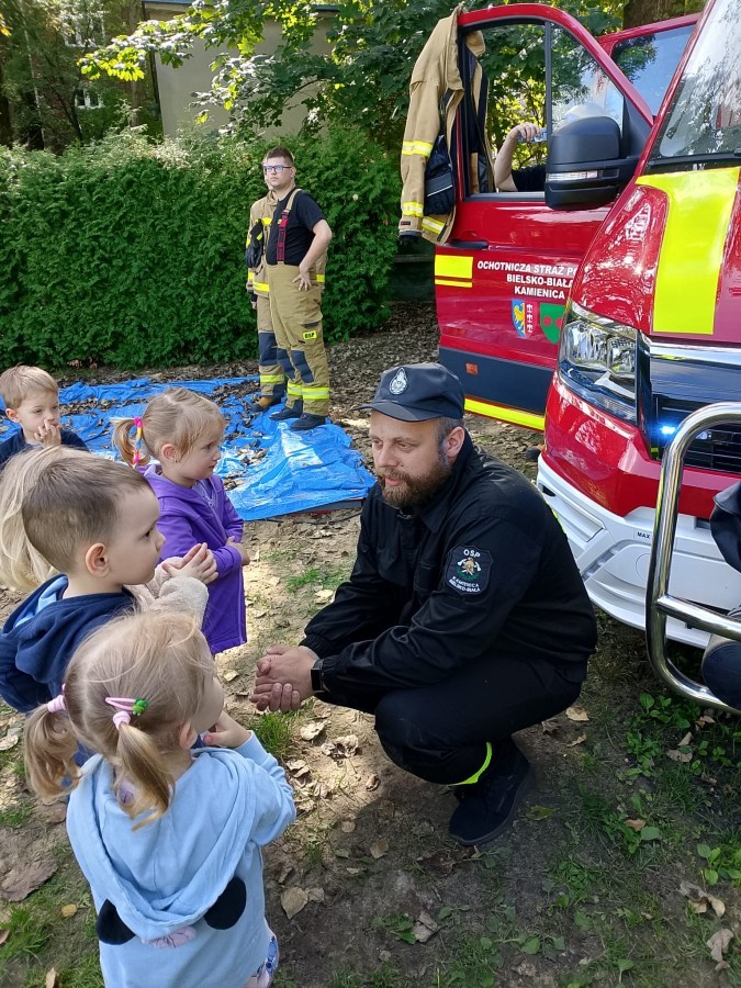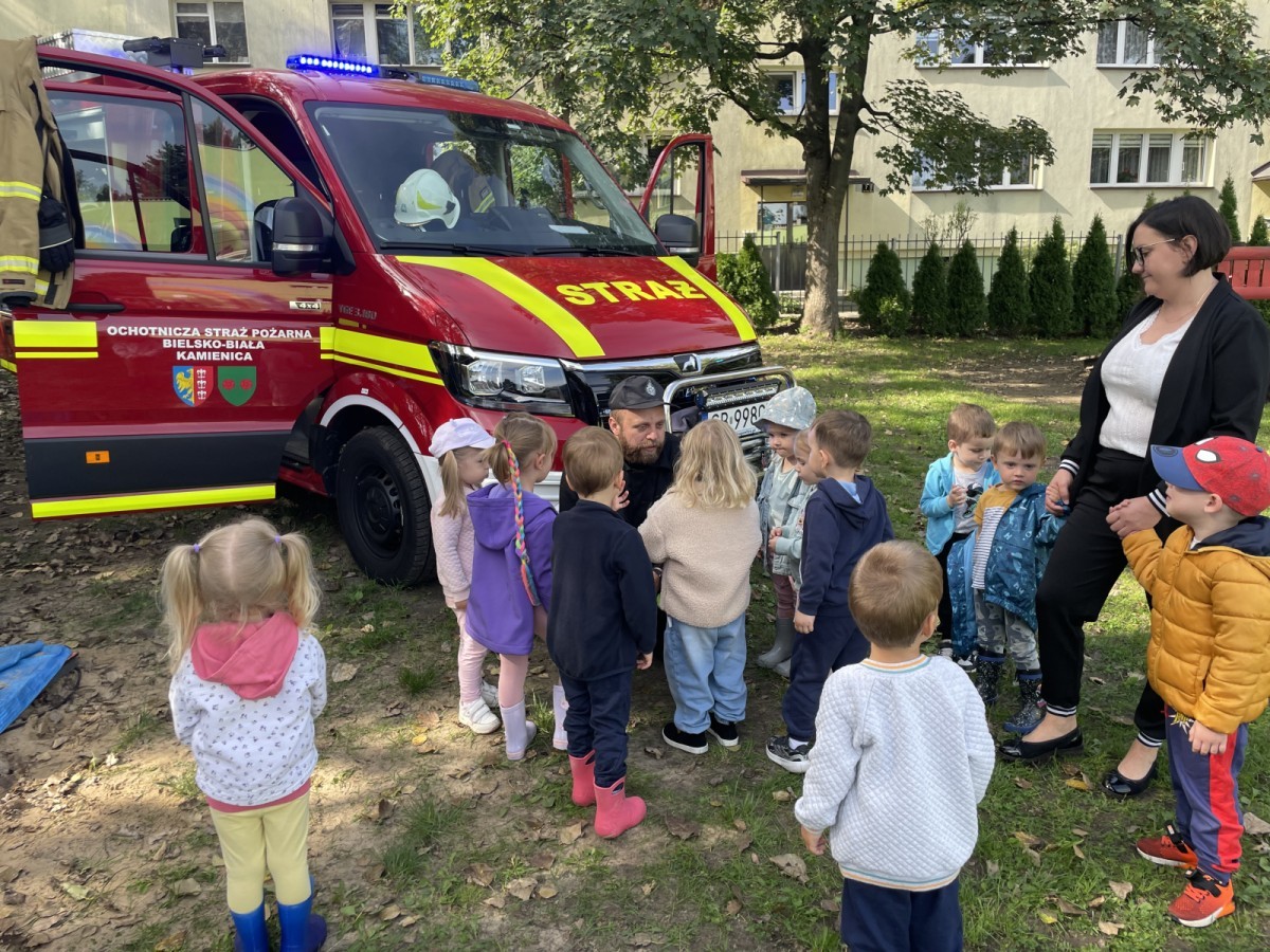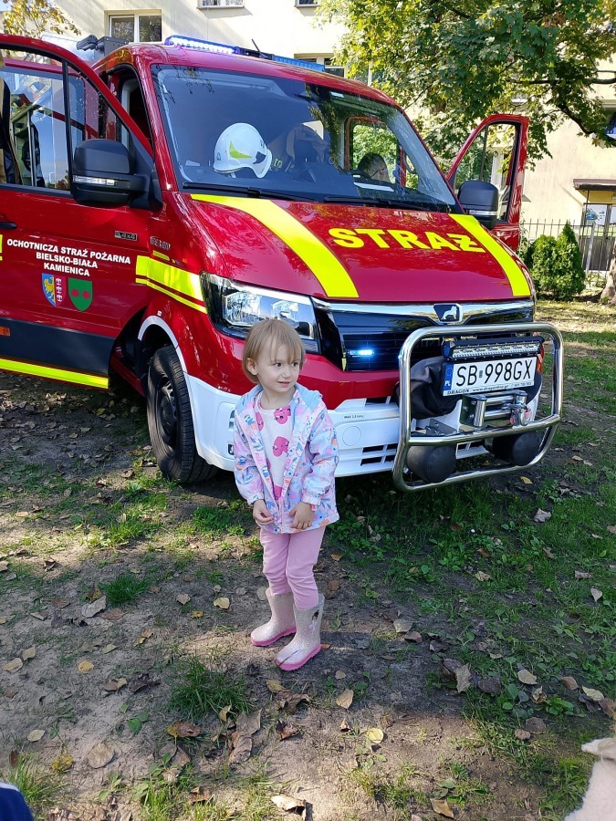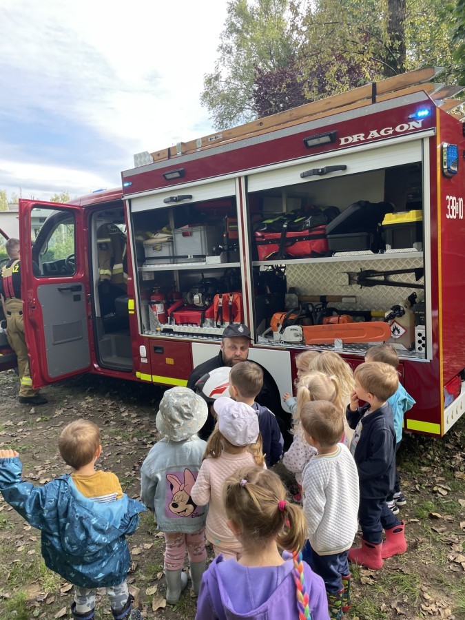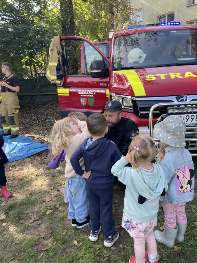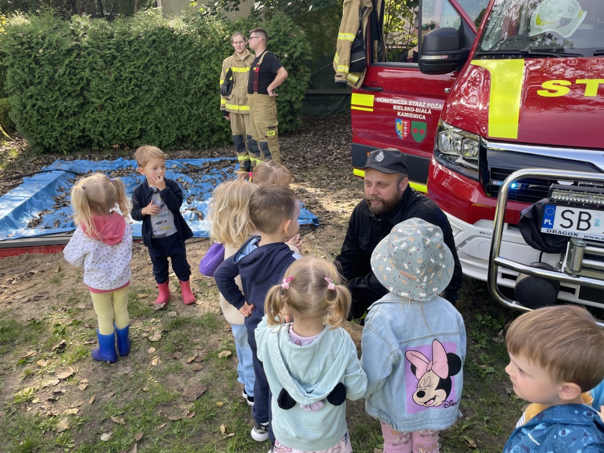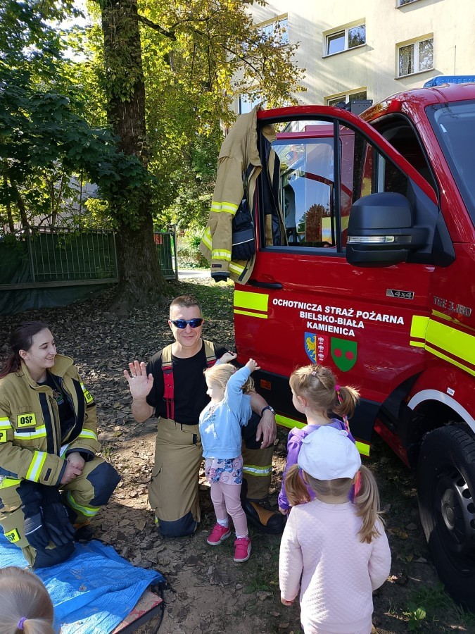 W Dniu 19.09.2025 dzieci z grupy PI - KOTKI miały przyjemność poznać ciężki i niebezpieczny, ale bardzo potrzebny zawód - strażaka . Odwiedziła nas odważna ekipa z Ochotniczej Straży Pożarnej Bielsko -Biała Kamienica , która opowiedziała o swojej pracy . Dzieci miały możliwość podziwiać wyposażenie, jakim dysponują strażacy podczas swojej pracy, poznały elementy ubioru, a ochotnicy mogli nawet przymierzyć hełm strażacki. Każdy mógł wejść do wozu i poczuć się jak prawdziwy strażak. Na koniec otrzymaliśmy słodko - mokrą niespodziankę :) DZIĘKUJEMY !