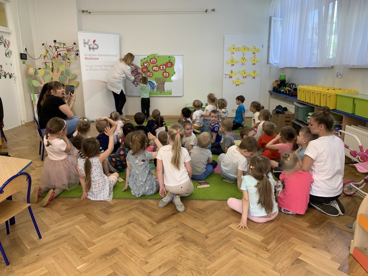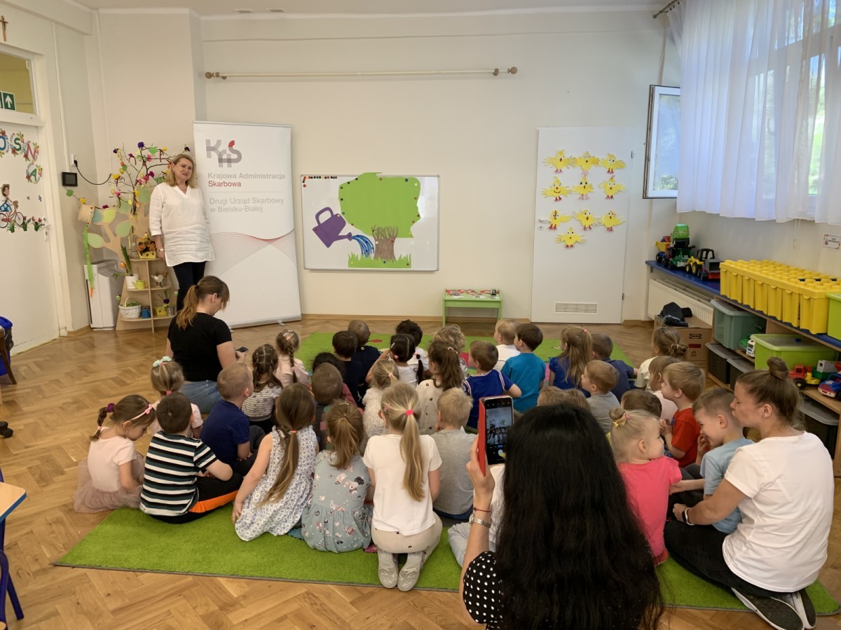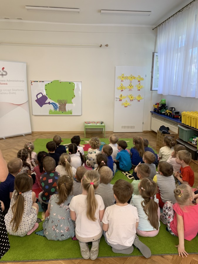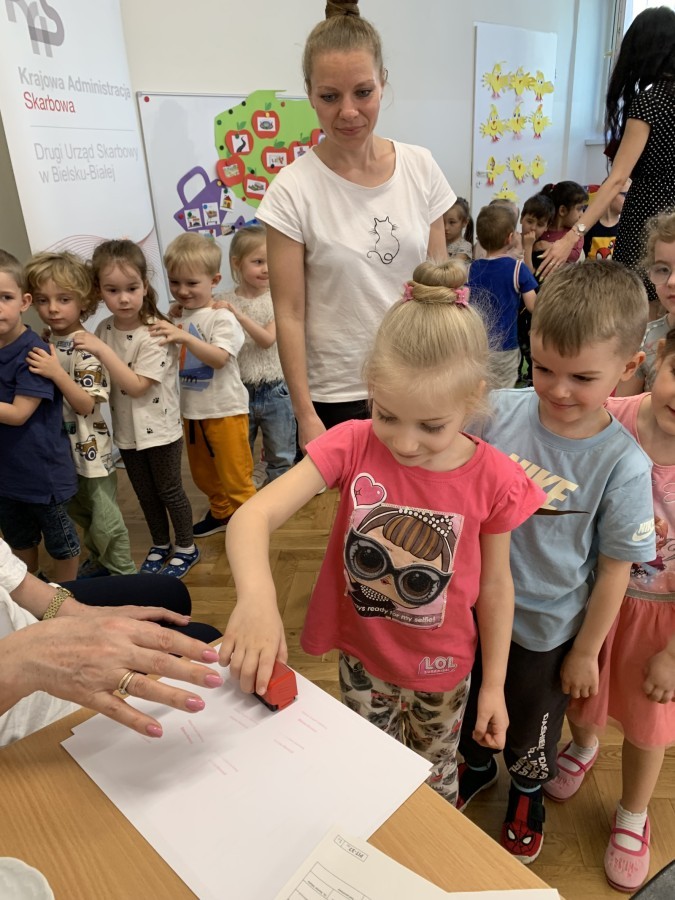 Dnia 17 kwietnia nasze przedszkole odwiedziła Pani z II Urzędu Skarbowego w Bielsku-Białej. Opowiedziała nam o swojej pracy, przybliżyła wiedzę na temat podatków oraz w ciekawy sposób zapoznała dzieci z tajnikami pracy w urzędzie skarbowym. Wszyscy chętnie brali udział w zajęciach, a na zakończenie każdy przedszkolak mógł poczuć się jak prawdziwy pracownik urzędu skarbowego i poprzybijać pieczątki.
