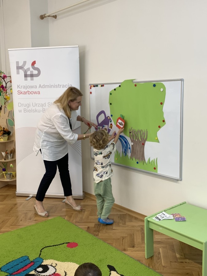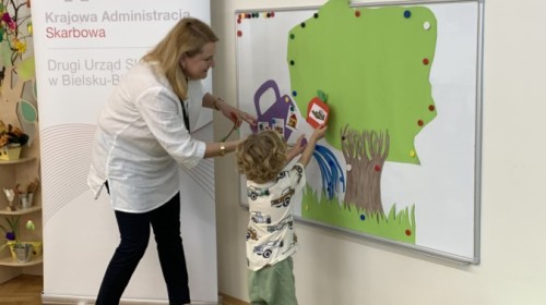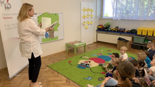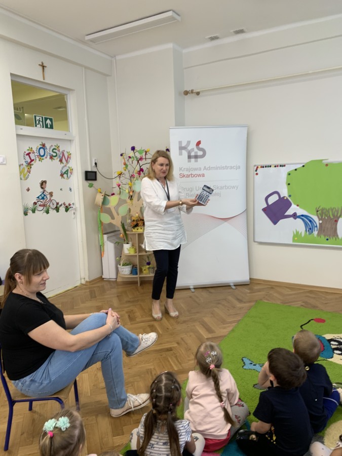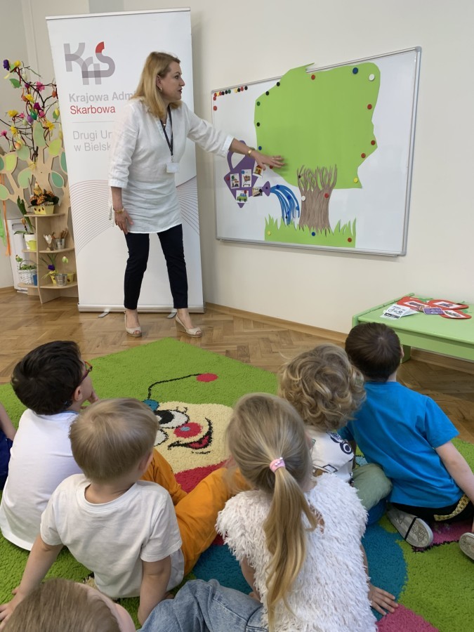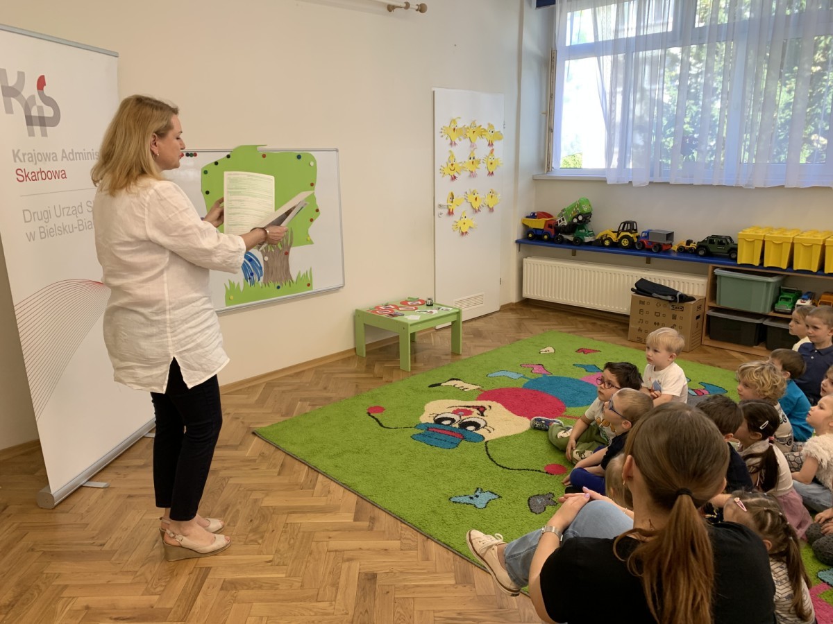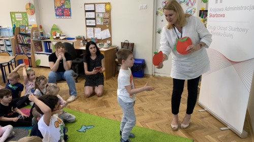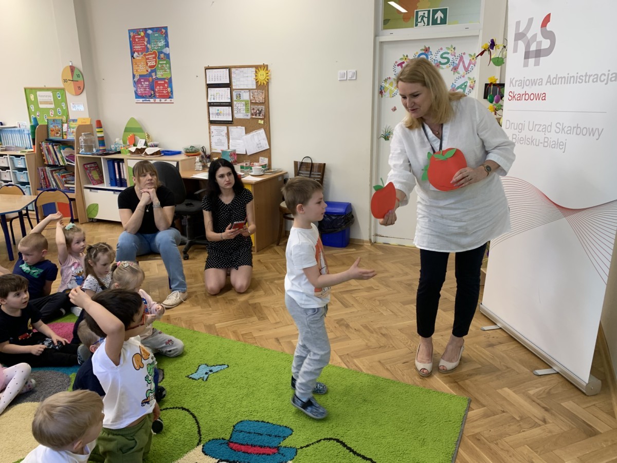 Dnia 17 kwietnia nasze przedszkole odwiedziła Pani z II Urzędu Skarbowego w Bielsku-Białej. Opowiedziała nam o swojej pracy, przybliżyła wiedzę na temat podatków oraz w ciekawy sposób zapoznała dzieci z tajnikami pracy w urzędzie skarbowym. Wszyscy chętnie brali udział w zajęciach, a na zakończenie każdy przedszkolak mógł poczuć się jak prawdziwy pracownik urzędu skarbowego i poprzybijać pieczątki.