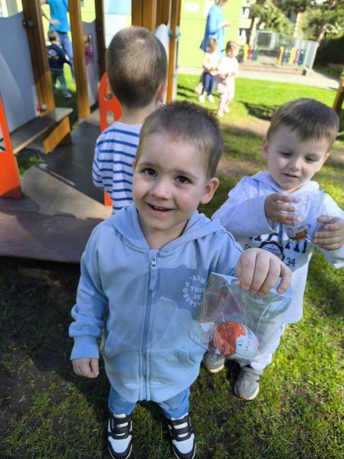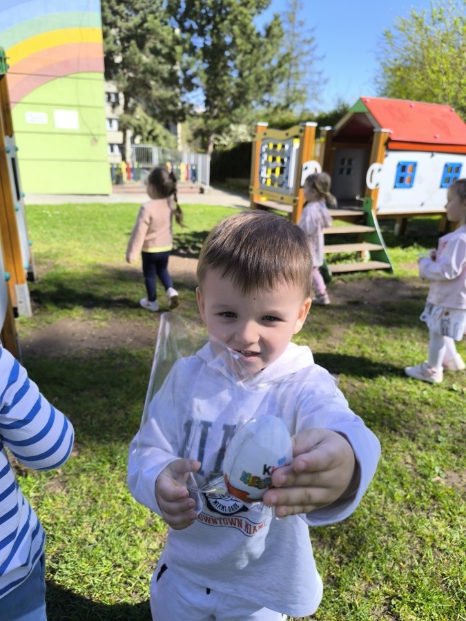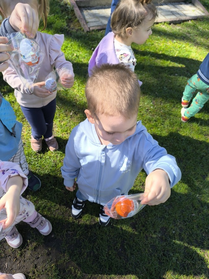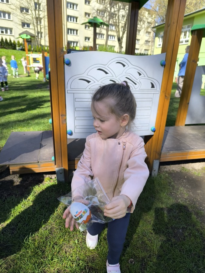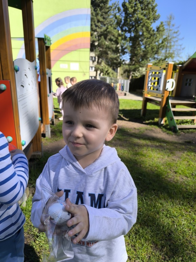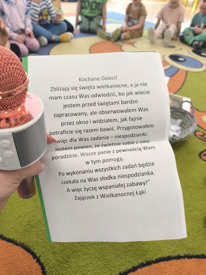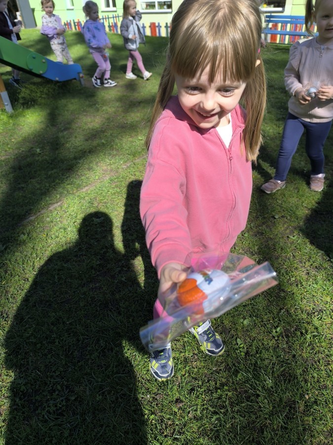 16 kwietnia do naszego przedszkola zawitał niespodziewanie Wielkanocny Zajączek. Już od samego rana wszyscy z niecierpliwością wypatrywali śladów zajączka. Dzieci odnalazły koszyczek z listem od Wielkanocnego Zajączka, który prosił dzieci o pomoc w odszukaniu zaginionych jajeczek, jak również dzieci wykonały wszystkie zadania, które ukryte były w liście. Po ich wykonaniu nasze przedszkolaki udały się wyznaczoną trasą szukać śladów Wielkanocnego Gościa. Z wielkim zapałem dzieci szukały w ogrodzie jajek niespodzianek , ale to nie był koniec niespodzianek, ponieważ w sali zajączek ukrył jeszcze jeden prezent :)