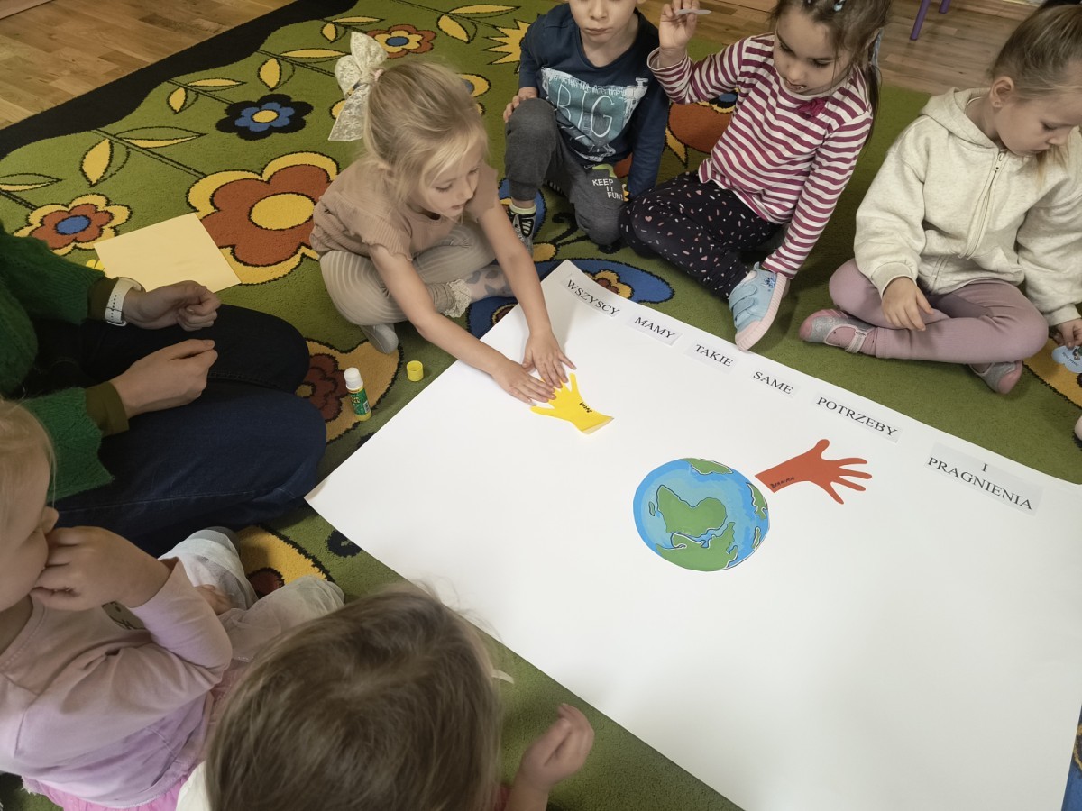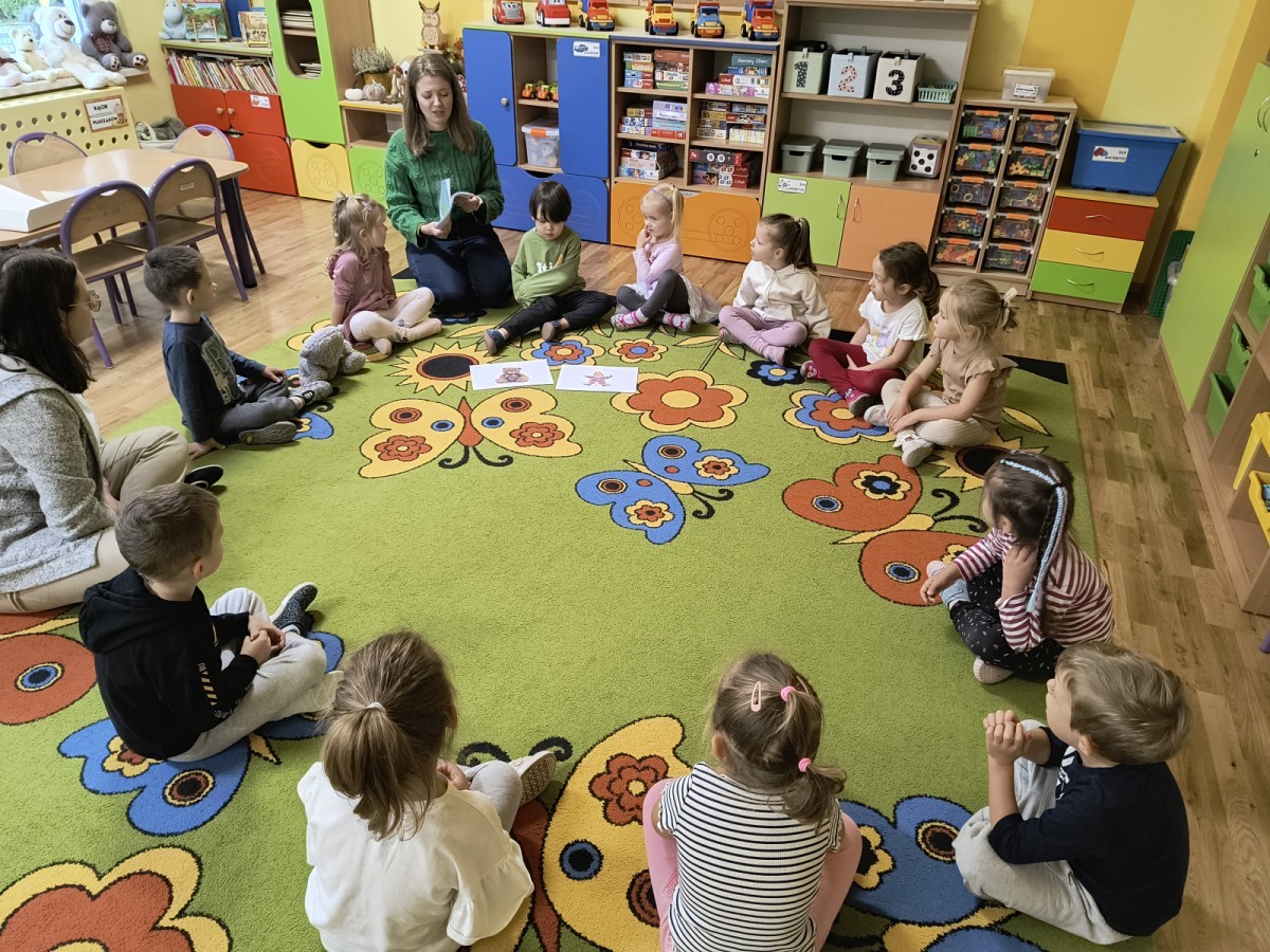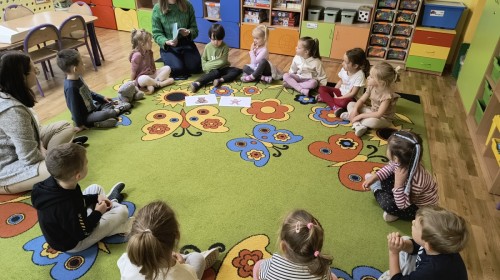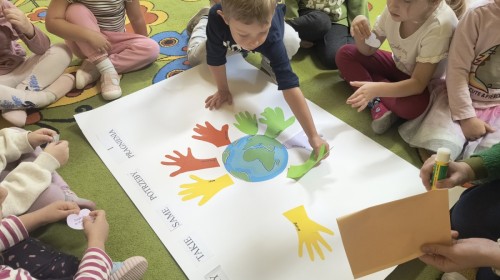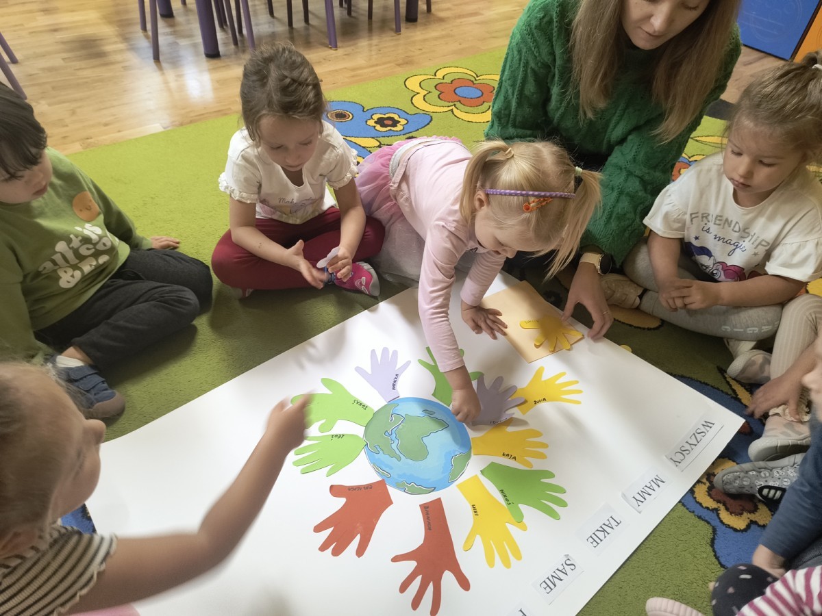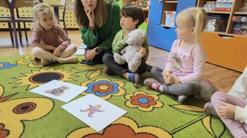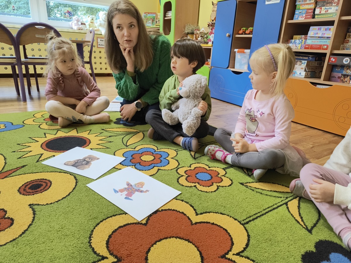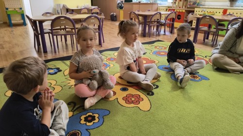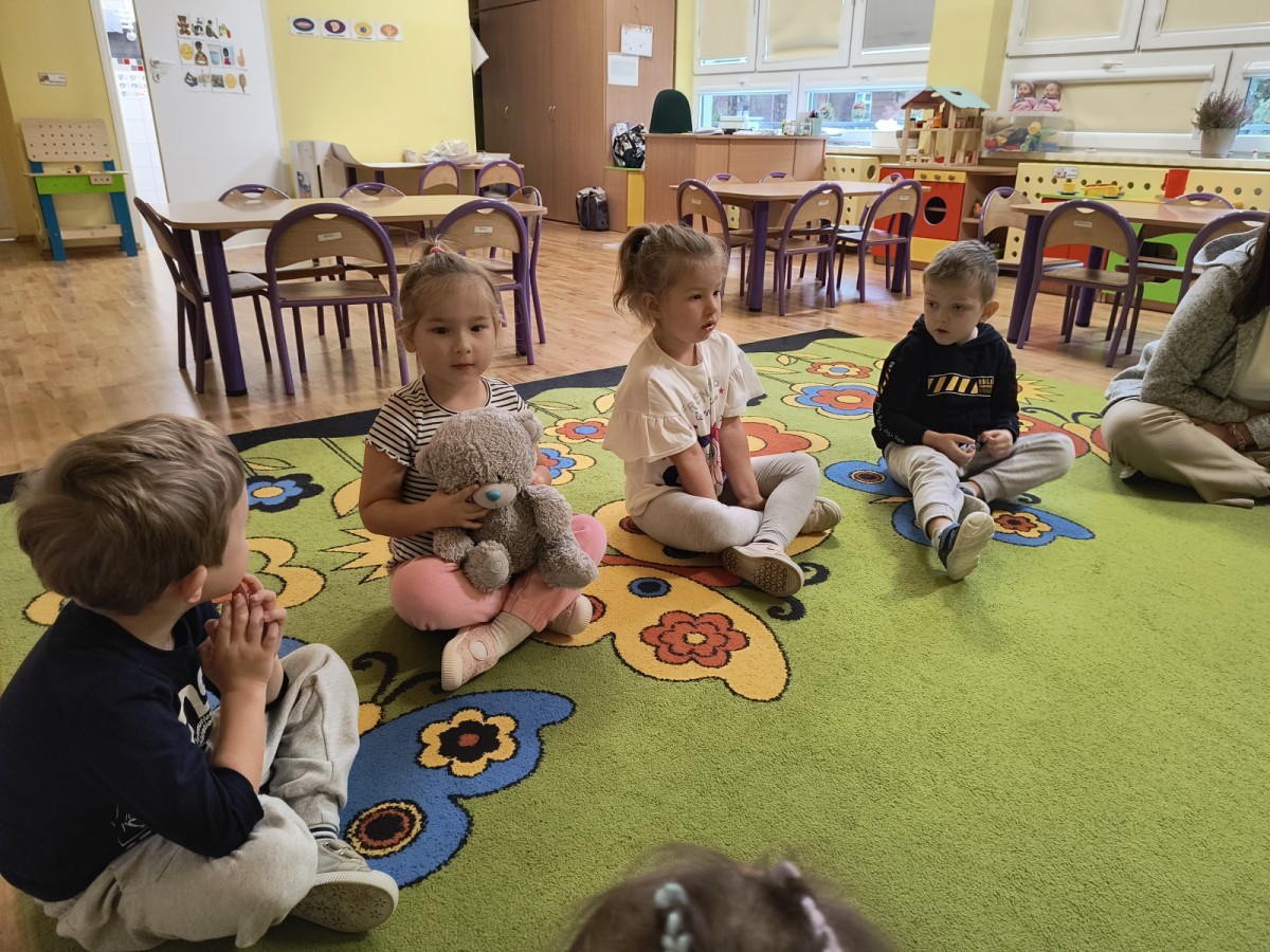 Pani Ada poprzez wspólne zabawy, aktywności, rozmowę oraz opowiadania o pajacyku i misiu, przybliżyła dzieciom tematykę tolerancji, różnorodności, inności i wzajemnego szacunku.