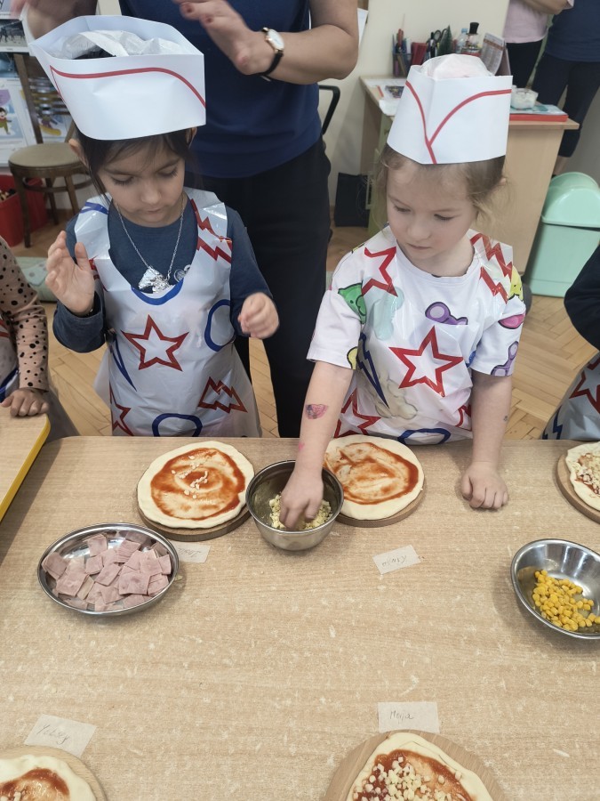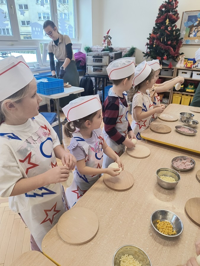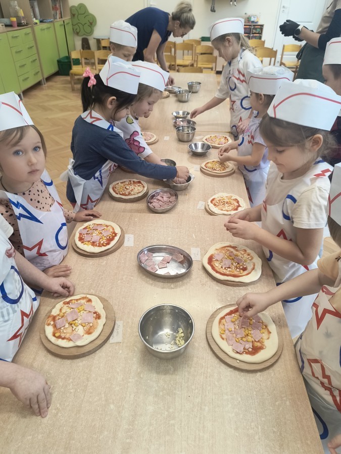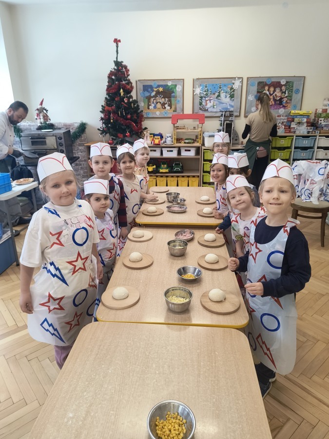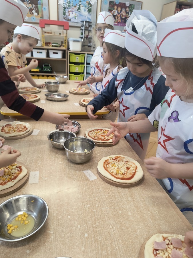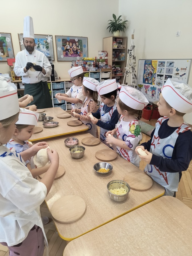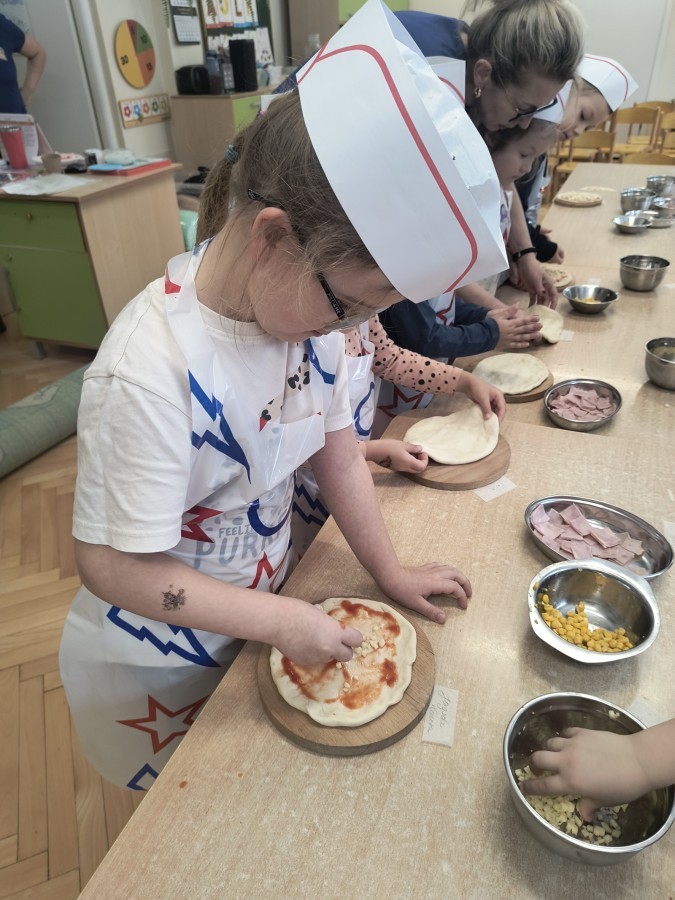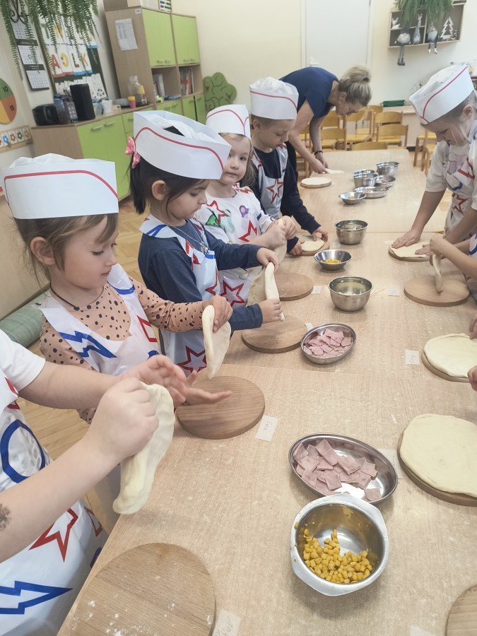 Na czas warsztatów dzieci założyły specjalne czapki pizzermana i fartuszki, co sprawiło, że poczuły się jak w prawdziwej pizzerii! 😊🎩