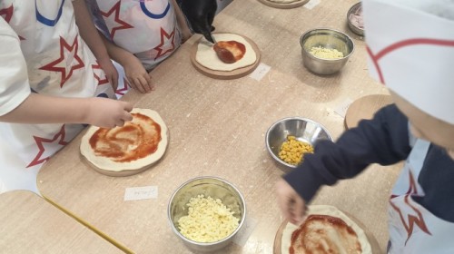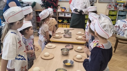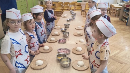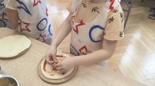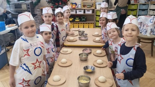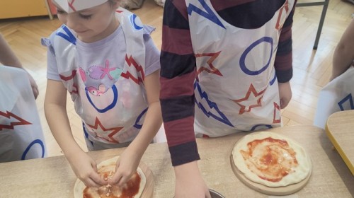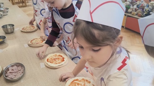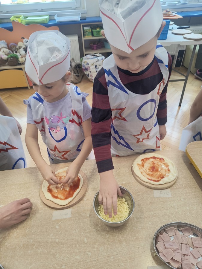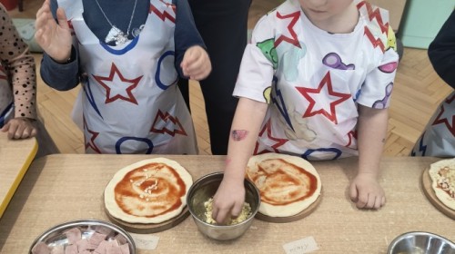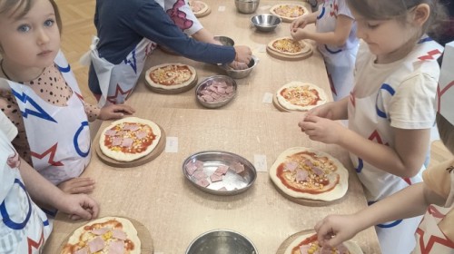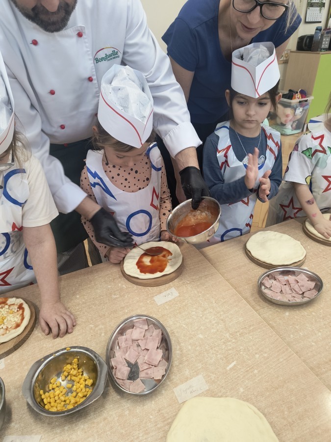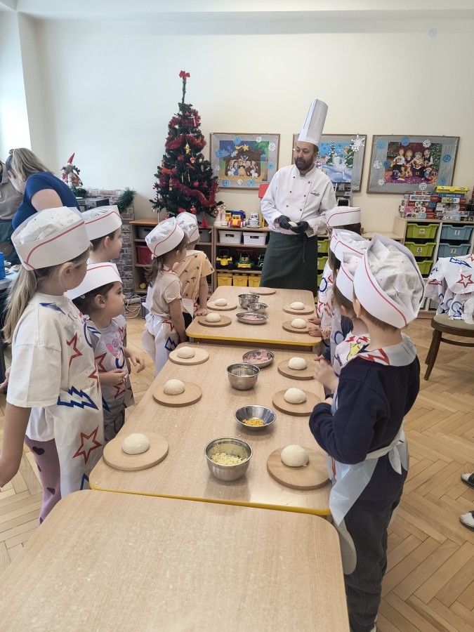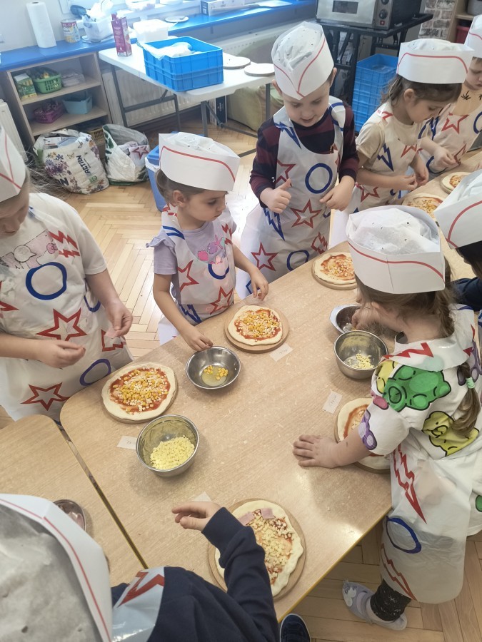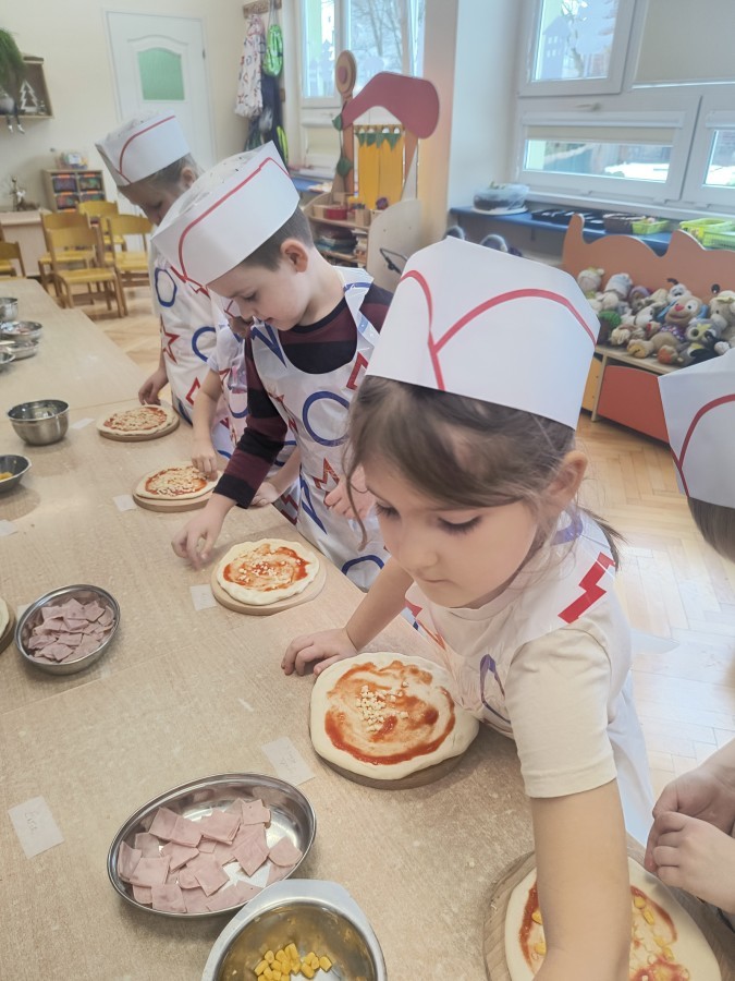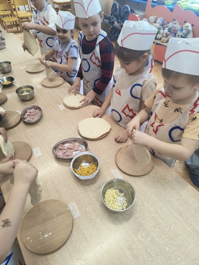 Na czas warsztatów dzieci założyły specjalne czapki pizzermana i fartuszki, co sprawiło, że poczuły się jak w prawdziwej pizzerii! 😊🎩
