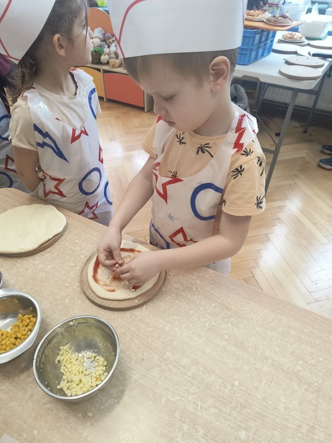 Każde dziecko otrzymało własną kulę ciasta, z której samodzielnie formowało swoją pizzę. Następnie przedszkolaki wybierały ulubione dodatki: aromatyczny sos pomidorowy, ser, szynkę oraz kukurydzę. 🍅🧀🌽