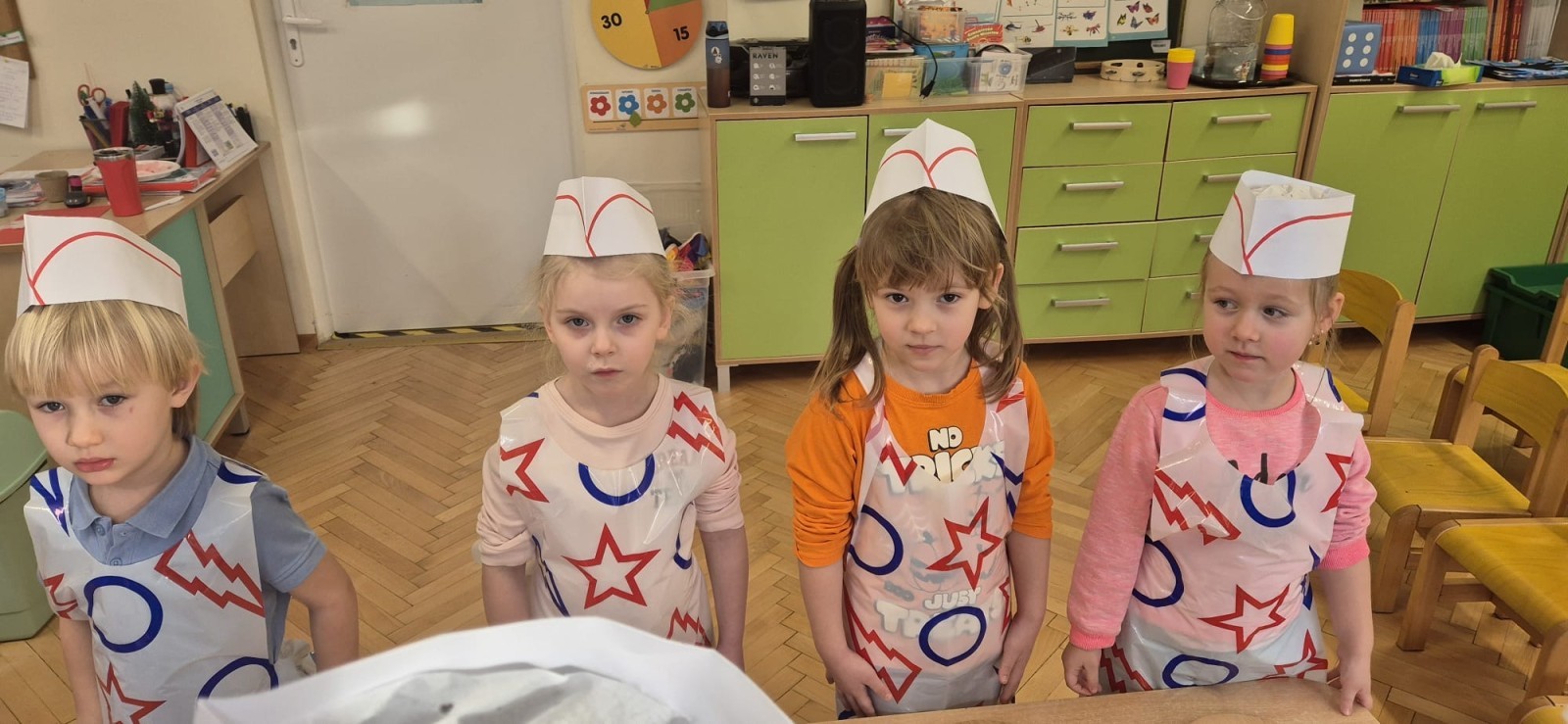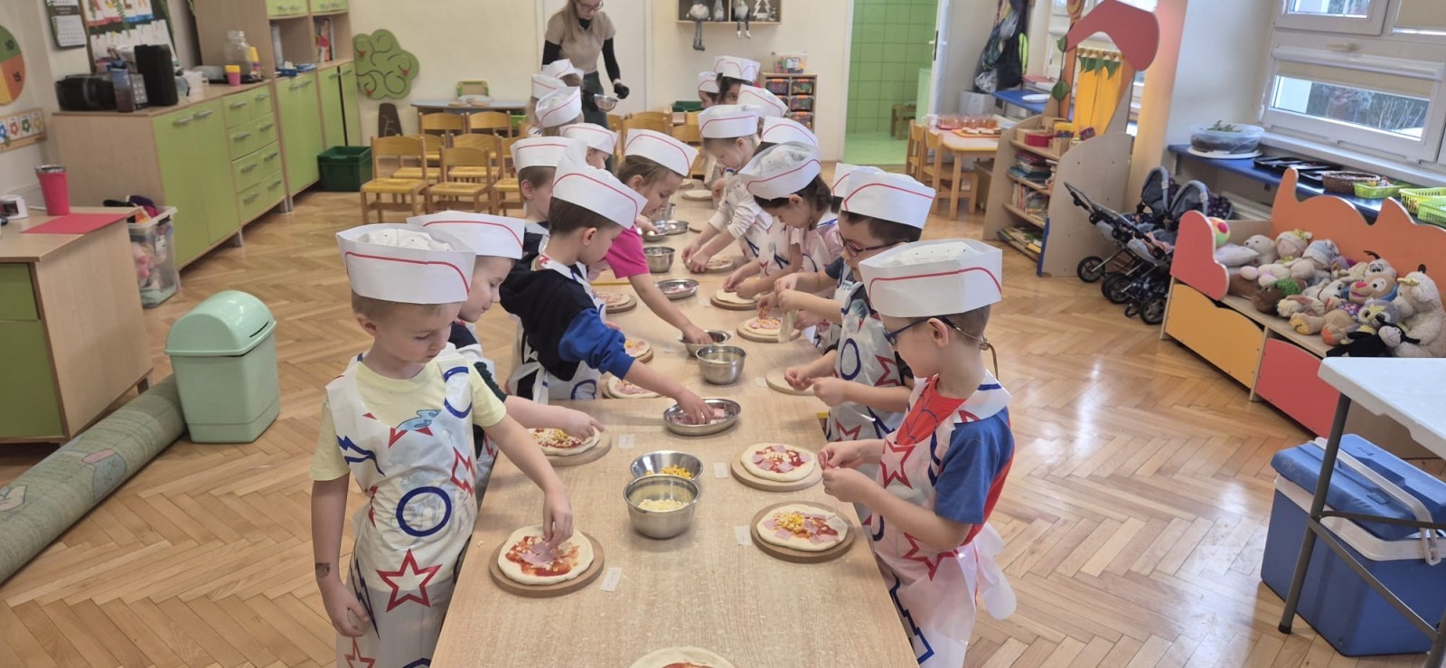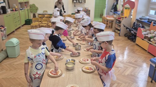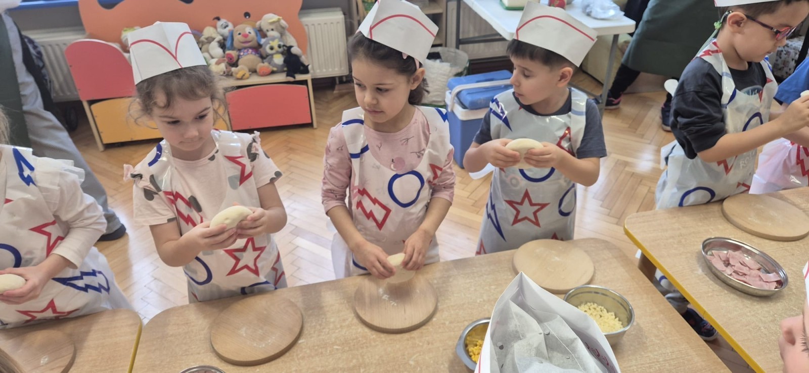 Na czas warsztatów dzieci założyły specjalne czapki pizzermana i fartuszki, co sprawiło, że poczuły się jak w prawdziwej pizzerii! 😊🎩