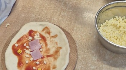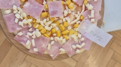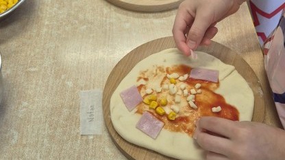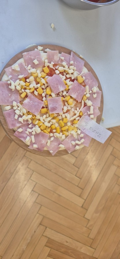 Każde dziecko otrzymało własną kulę ciasta, z której samodzielnie formowało swoją pizzę. Następnie przedszkolaki wybierały ulubione dodatki: aromatyczny sos pomidorowy, ser, szynkę oraz kukurydzę. 🍅🧀🌽