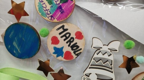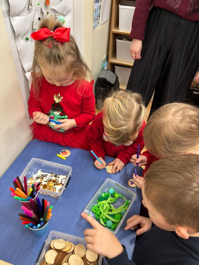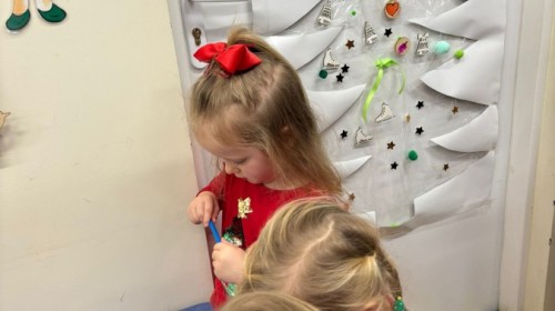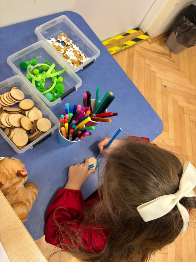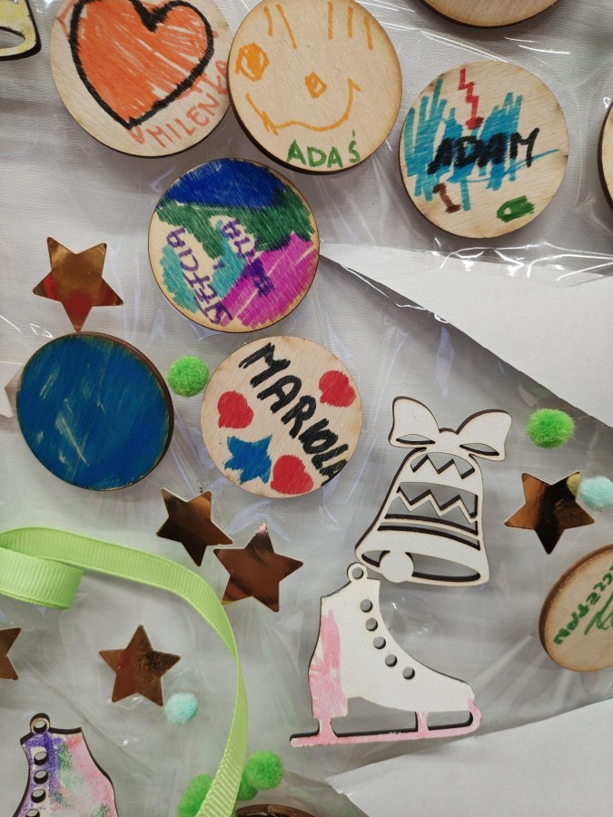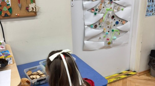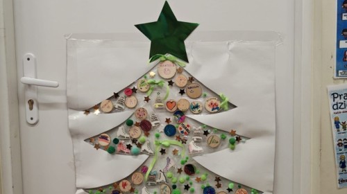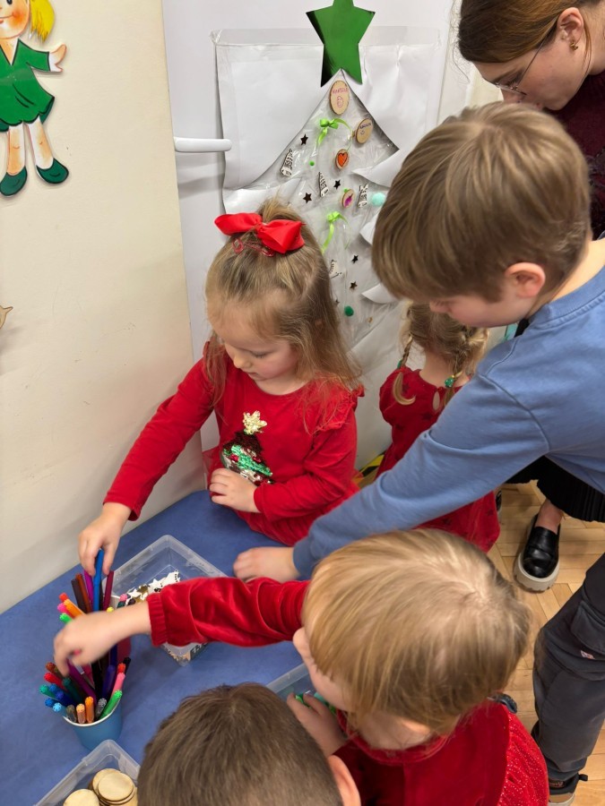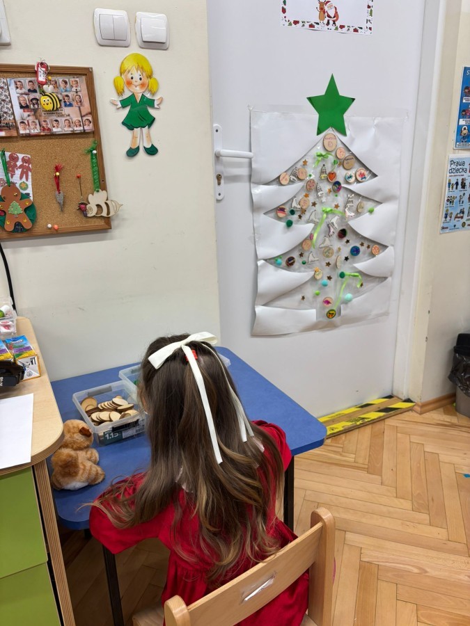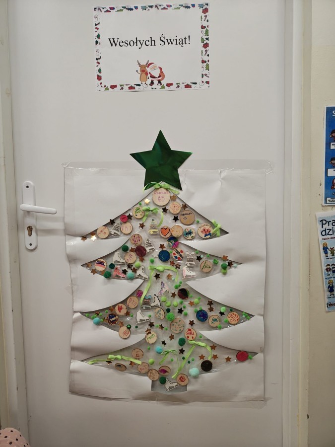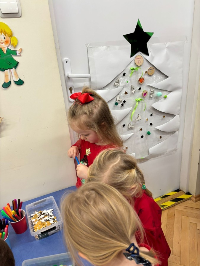 Kolejnym punktem zajęć było wspólne wyklejanie choinki na drzwiach sali. Dzieci naklejały kolorowe pompony, wstążki oraz drewniane bombki, tworząc piękną, świąteczną dekorację.