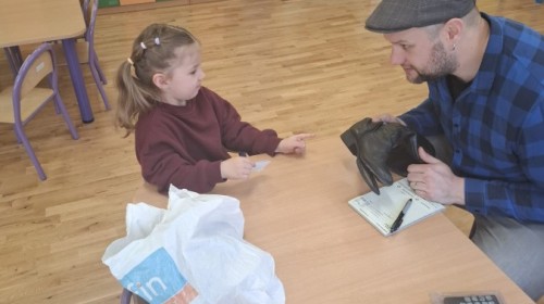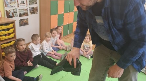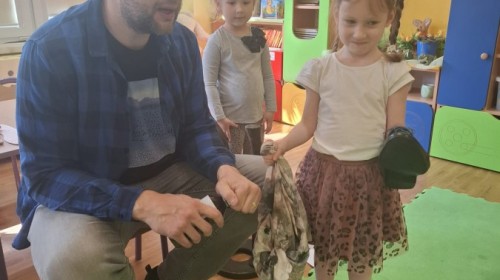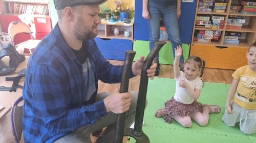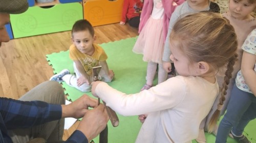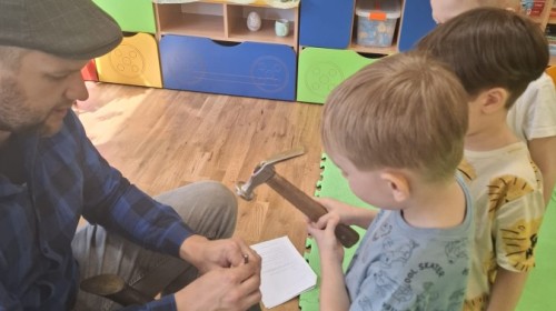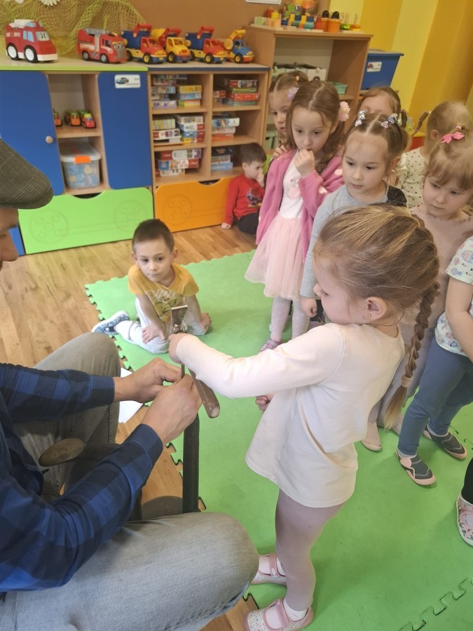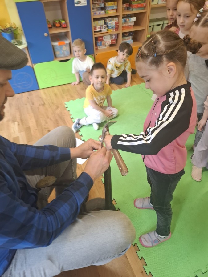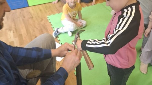To spotkanie dostarczyło dzieciom mnóstwo radości! Z ogromnym skupieniem i zaangażowaniem uczestniczyły w każdej części zajęć. Możliwość samodzielnego zbadania rekwizytów sprawiła, że była to dla nich niezapomniana lekcja przez doświadczenie. Na koniec każdy mógł z pomocą naszego gościa wybić w skórzanej zawieszce literkę swojego imienia.