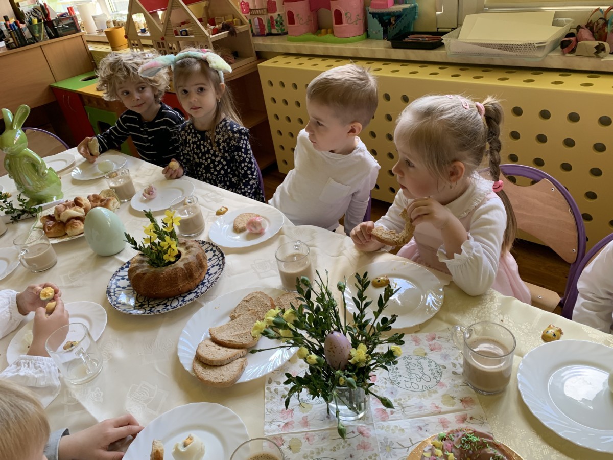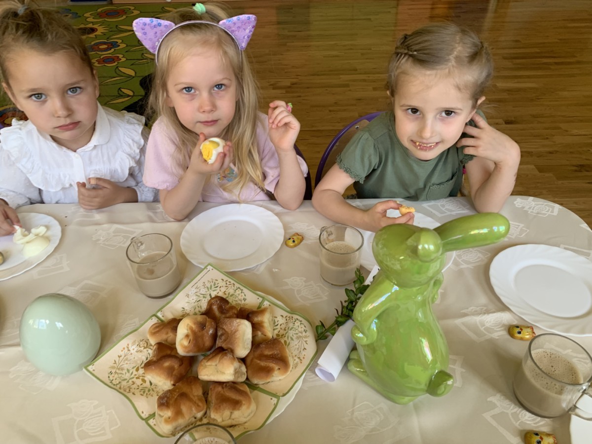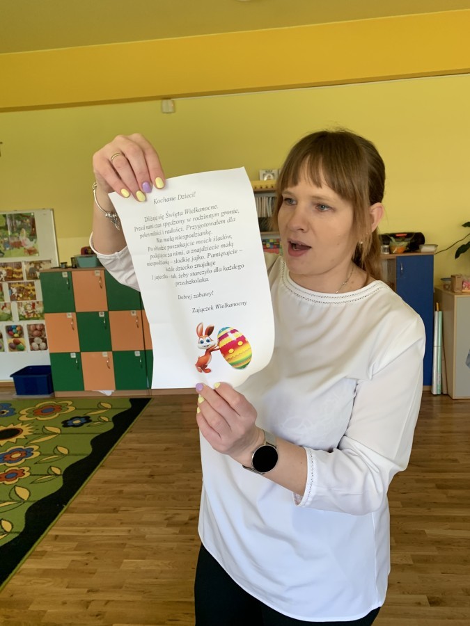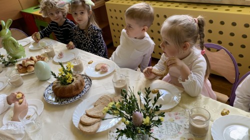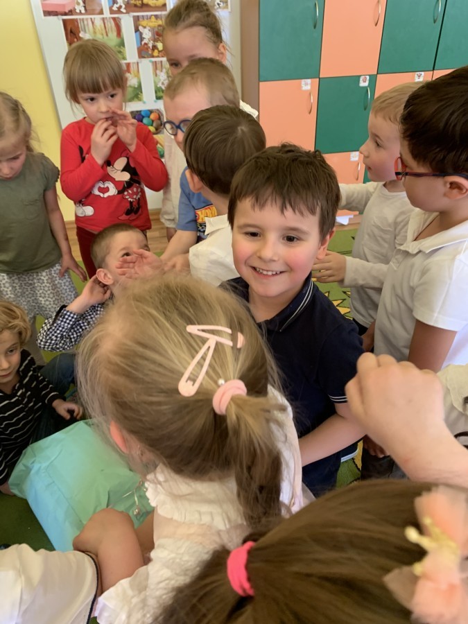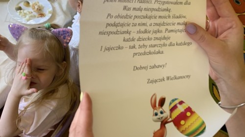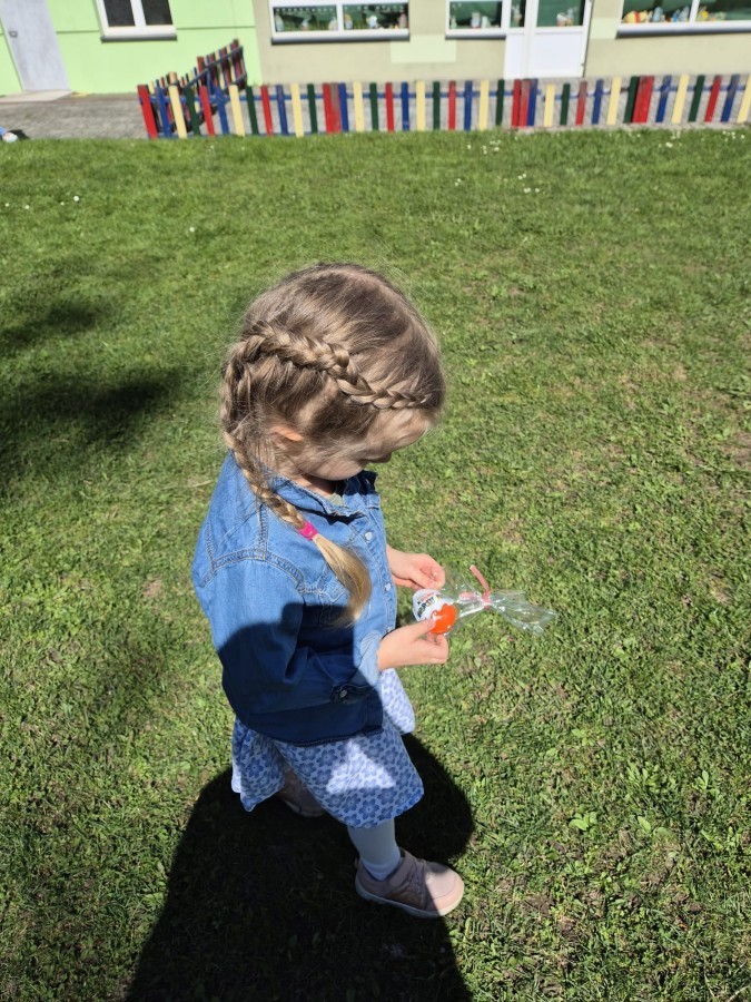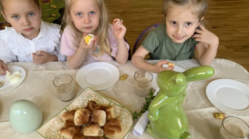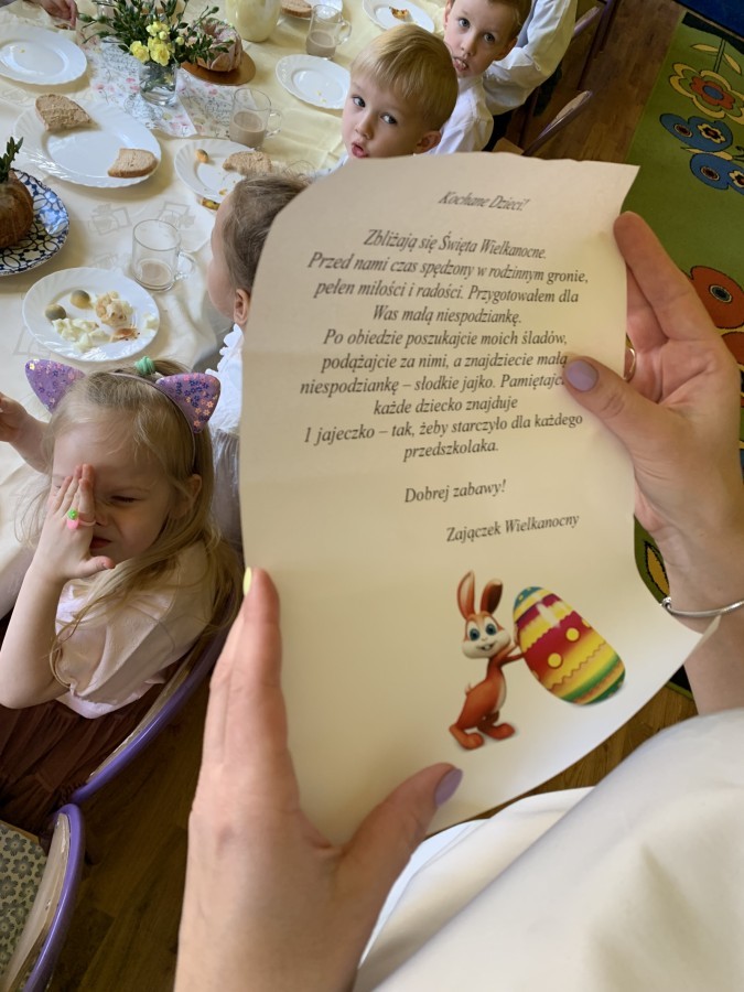 Wilczki z radością przygotowują się do Wielkanocy. Zapoznały się z najważniejszymi tradycjami, a w środę 16 kwietnia zasiadły wspólnie przy wielkanocnym śniadaniu. Nie zabrakło tradycyjnego stukania się jajkami oraz składania wielkanocnych życzeń. Tego dnia spotkała nas także niespodzianka… dostaliśmy list od tajemniczego gościa, którym okazał się Wielkanocny Zajączek. Podążaliśmy jego śladami, które zaprowadziły nas do ogrodu przedszkolnego - tam, zostawił dla nas słodkie jajka. Po powrocie okazało się, że to nie koniec niespodzianek - w sali czekał na nas prezent dla całej grupy!