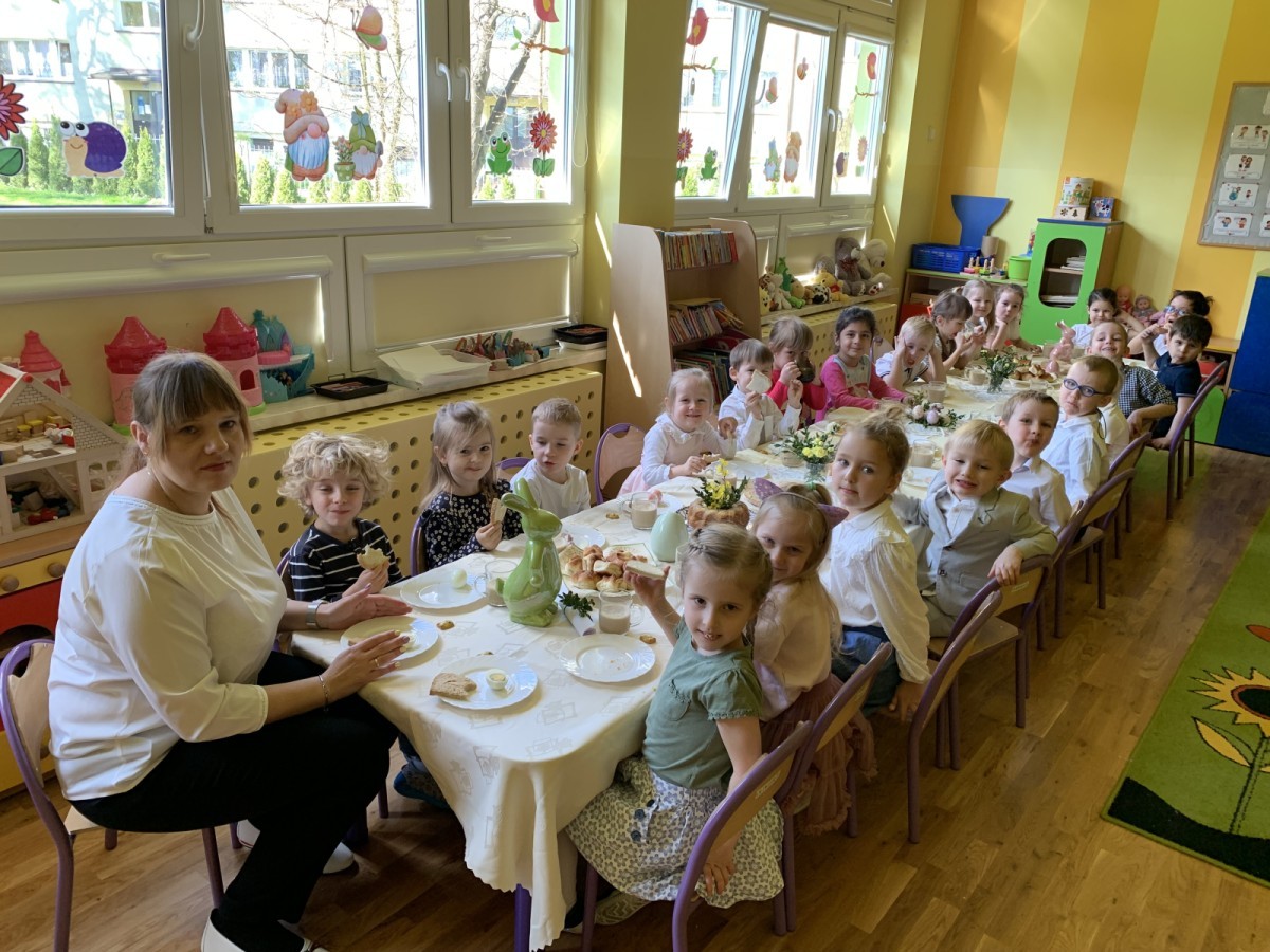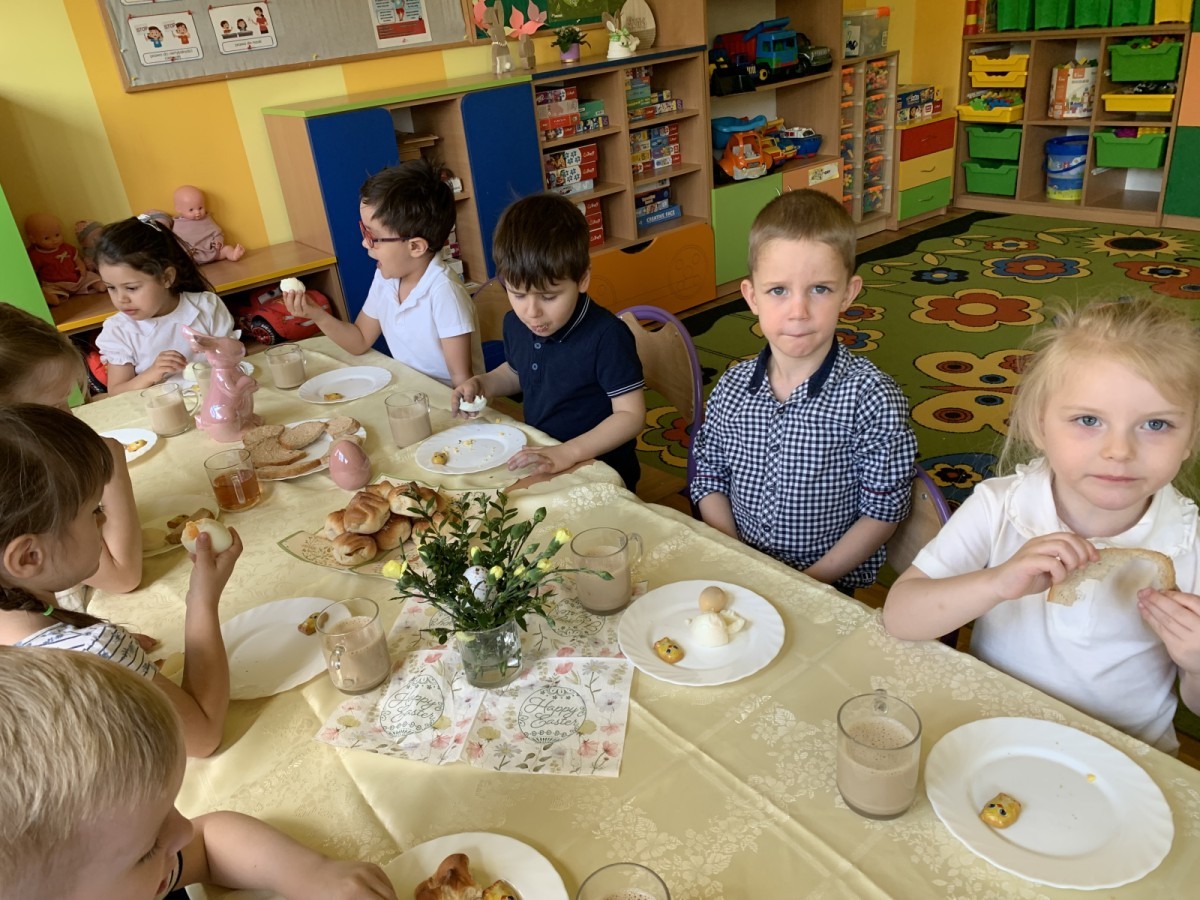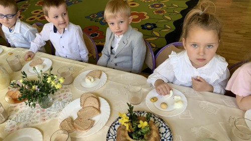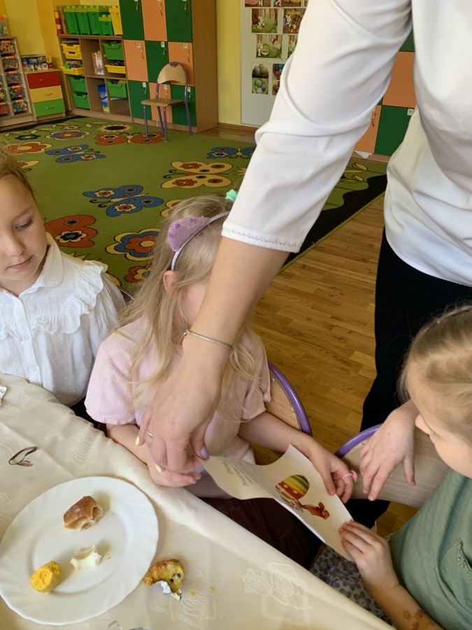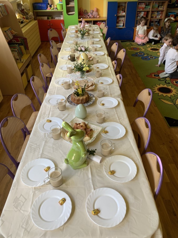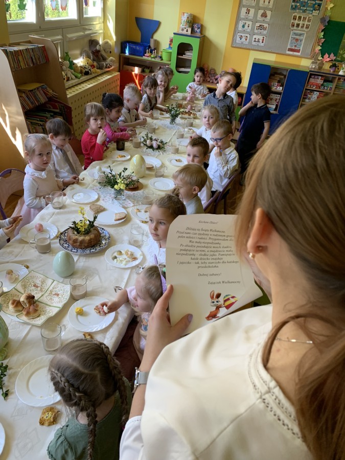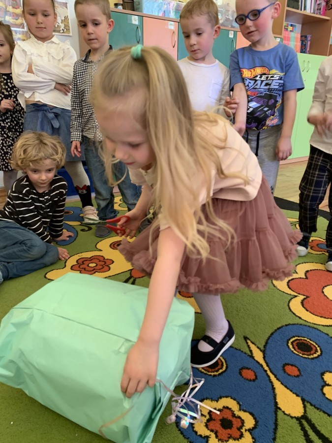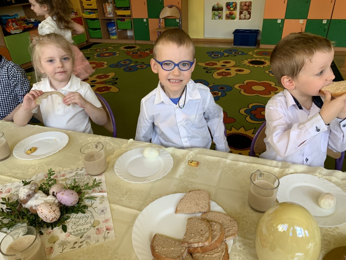Wilczki z radością przygotowują się do Wielkanocy. Zapoznały się z najważniejszymi tradycjami, a w środę 16 kwietnia zasiadły wspólnie przy wielkanocnym śniadaniu. Nie zabrakło tradycyjnego stukania się jajkami oraz składania wielkanocnych życzeń. Tego dnia spotkała nas także niespodzianka… dostaliśmy list od tajemniczego gościa, którym okazał się Wielkanocny Zajączek. Podążaliśmy jego śladami, które zaprowadziły nas do ogrodu przedszkolnego - tam, zostawił dla nas słodkie jajka. Po powrocie okazało się, że to nie koniec niespodzianek - w sali czekał na nas prezent dla całej grupy!
