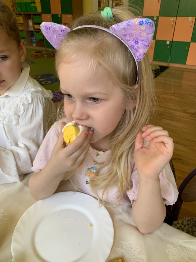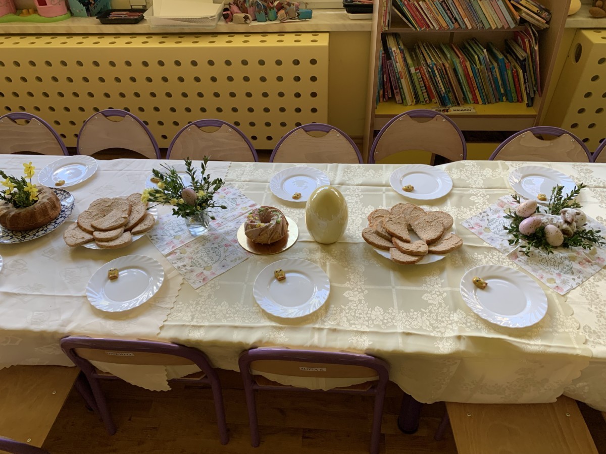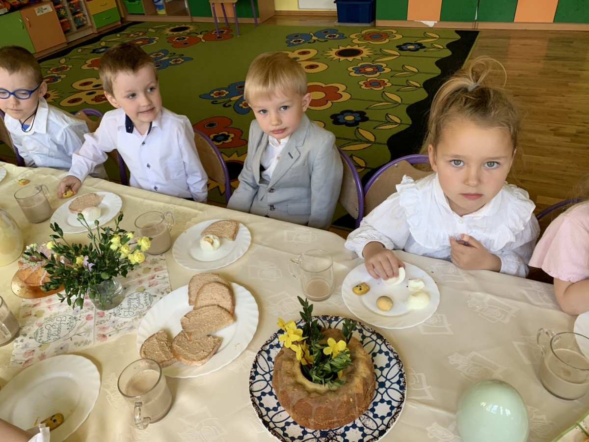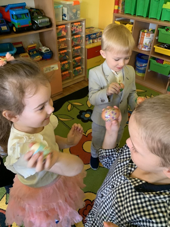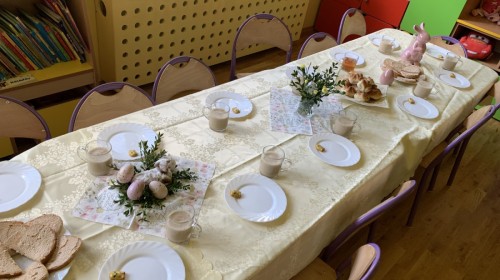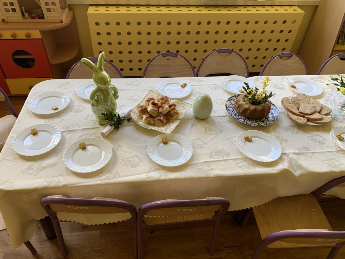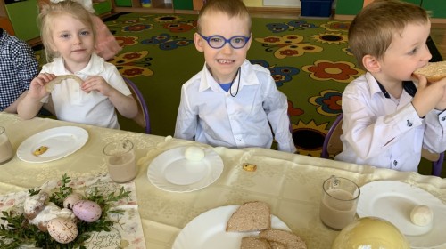 Wilczki z radością przygotowują się do Wielkanocy. Zapoznały się z najważniejszymi tradycjami, a w środę 16 kwietnia zasiadły wspólnie przy wielkanocnym śniadaniu. Nie zabrakło tradycyjnego stukania się jajkami oraz składania wielkanocnych życzeń. Tego dnia spotkała nas także niespodzianka… dostaliśmy list od tajemniczego gościa, którym okazał się Wielkanocny Zajączek. Podążaliśmy jego śladami, które zaprowadziły nas do ogrodu przedszkolnego - tam, zostawił dla nas słodkie jajka. Po powrocie okazało się, że to nie koniec niespodzianek - w sali czekał na nas prezent dla całej grupy!