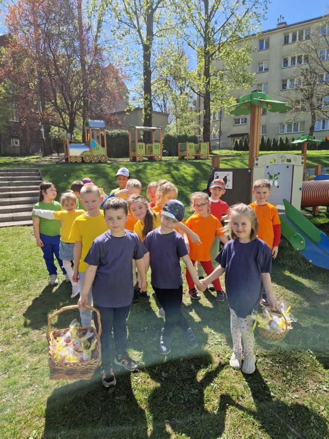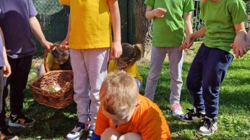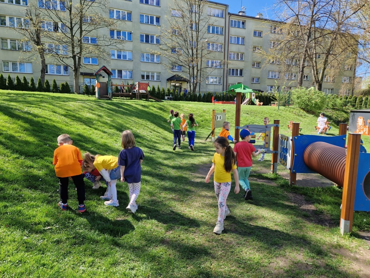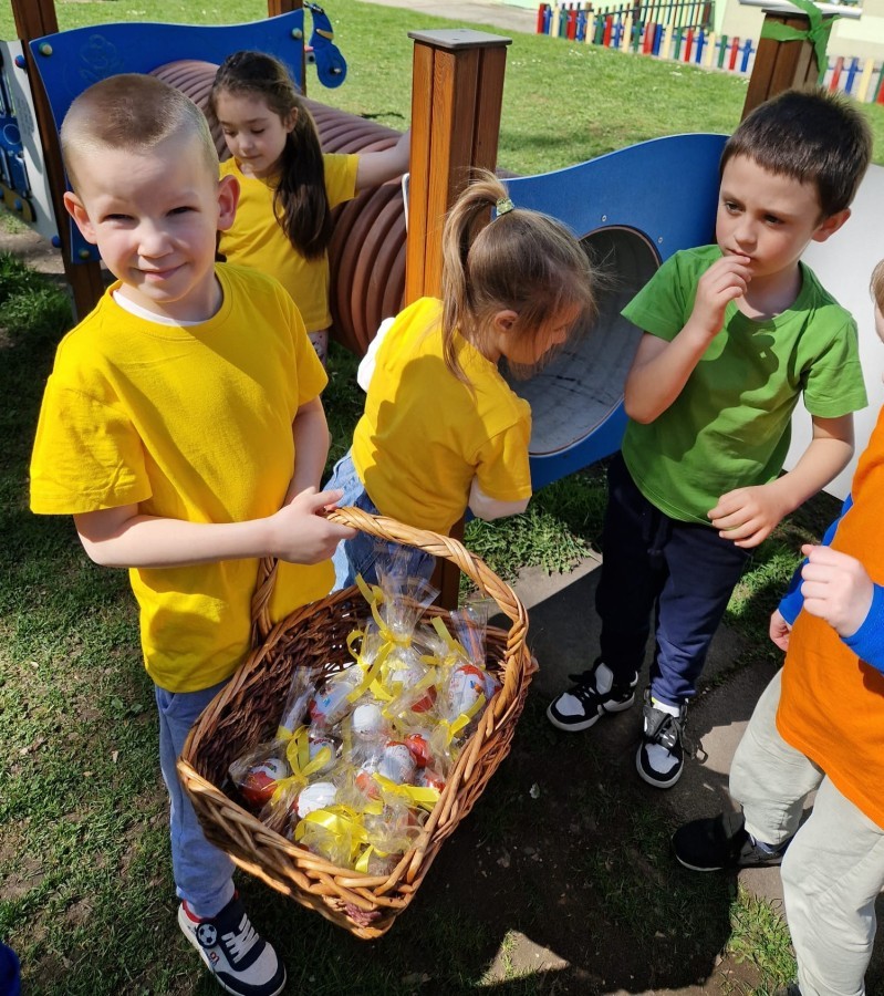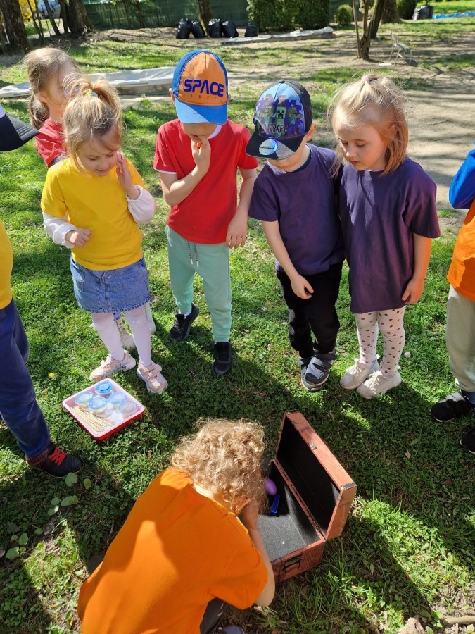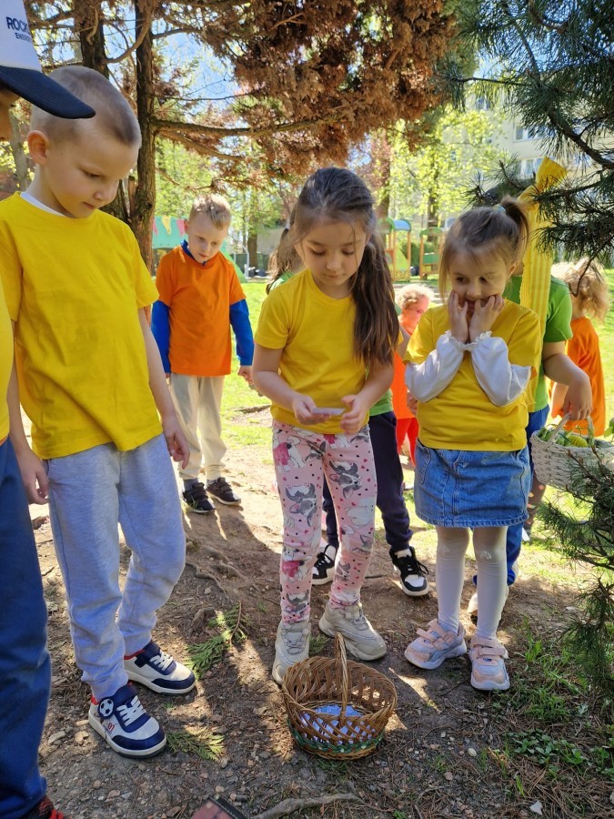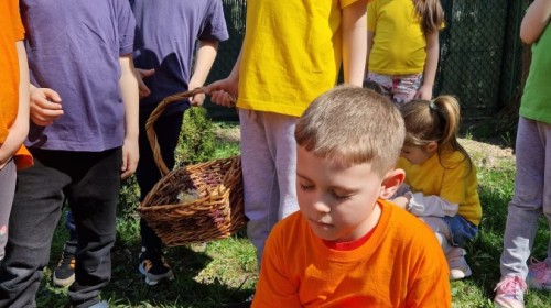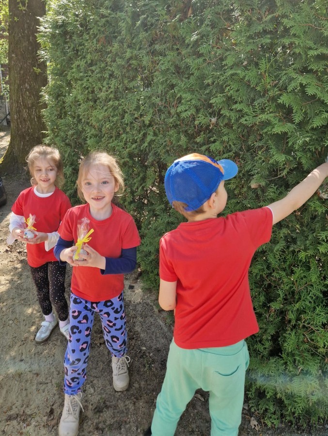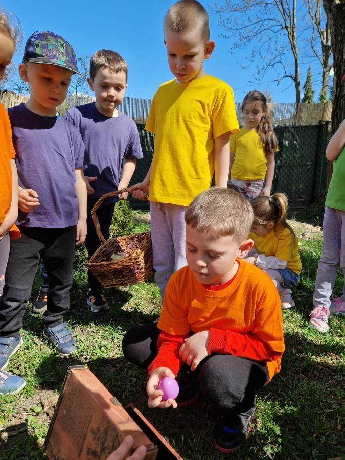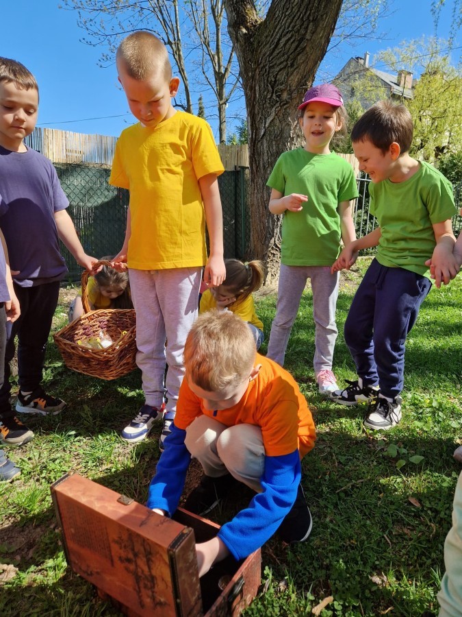 Z okazji zbliżających się Świąt Wielkanocnych Przedszkolaki z Grupy Słoneczek wzięły udział w wielkich poszukiwaniach :) Ich zadaniem było odszukanie ukrytych w ogrodzie przedszkolnym czekoladowych jajeczek. Dzieci podzielone na zespoły miały do wykonania różne zadania, których rozwiązanie pozwalało rozpocząć poszukiwania. Nasze Bystrzaki rozwiązały wszystkie rebusy i zagadki sensoryczne, a dzięki temu odnalazły ukryte w ogrodzie jajeczka :)