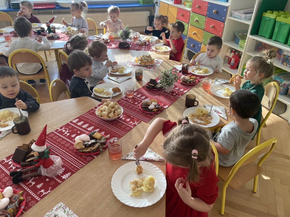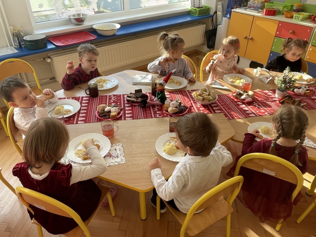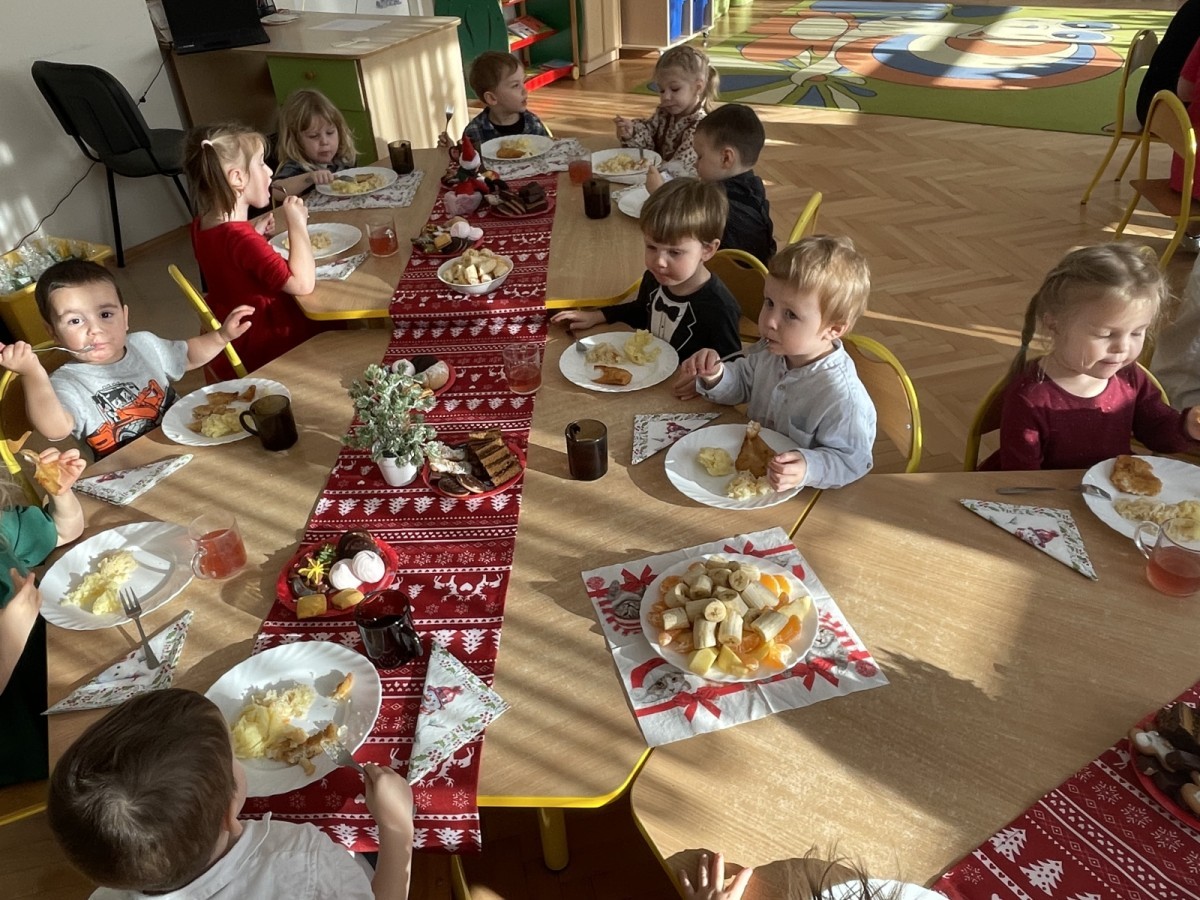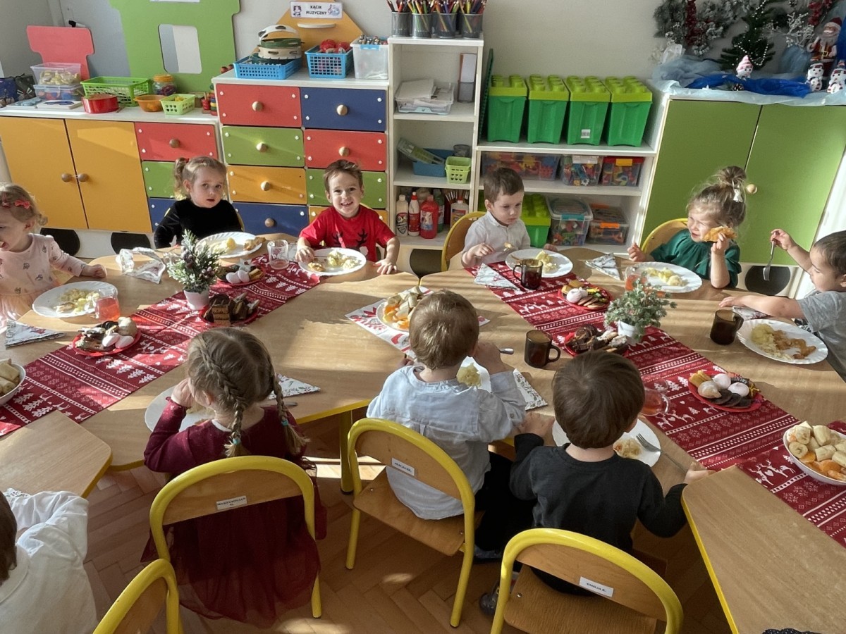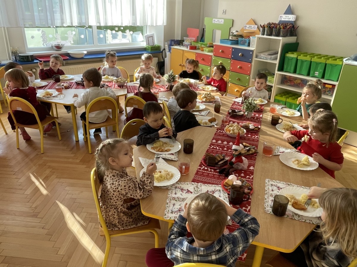 W grupie Kotki odbyła się uroczysta, grupowa wigilia. Dzieci w świątecznej atmosferze składały sobie serdeczne życzenia, dzieliły się opłatkiem oraz wspólnie świętowały przy wigilijnym stole. Spotkanie było pełne radości, ciepła i wzajemnej życzliwości, a wspólne chwile sprzyjały integracji oraz kultywowaniu świątecznych tradycji. 🎄✨