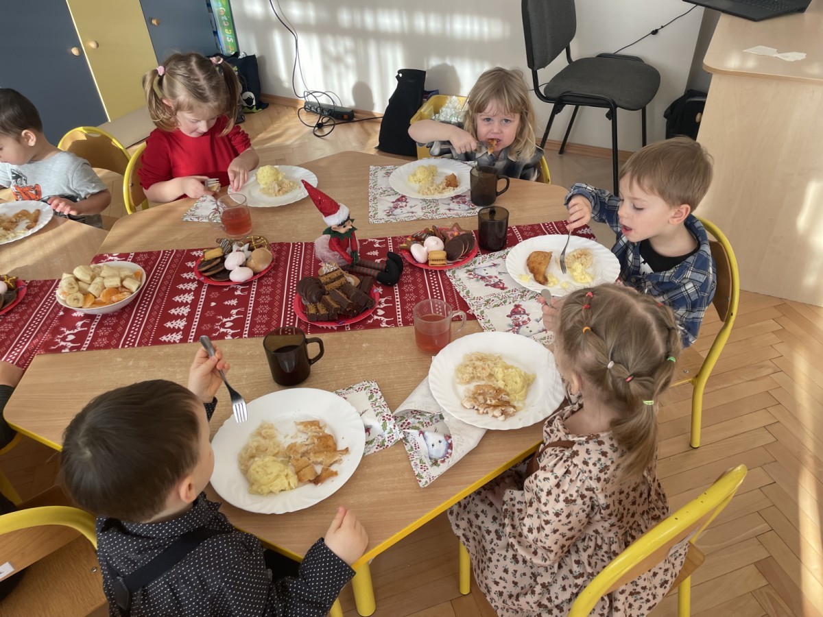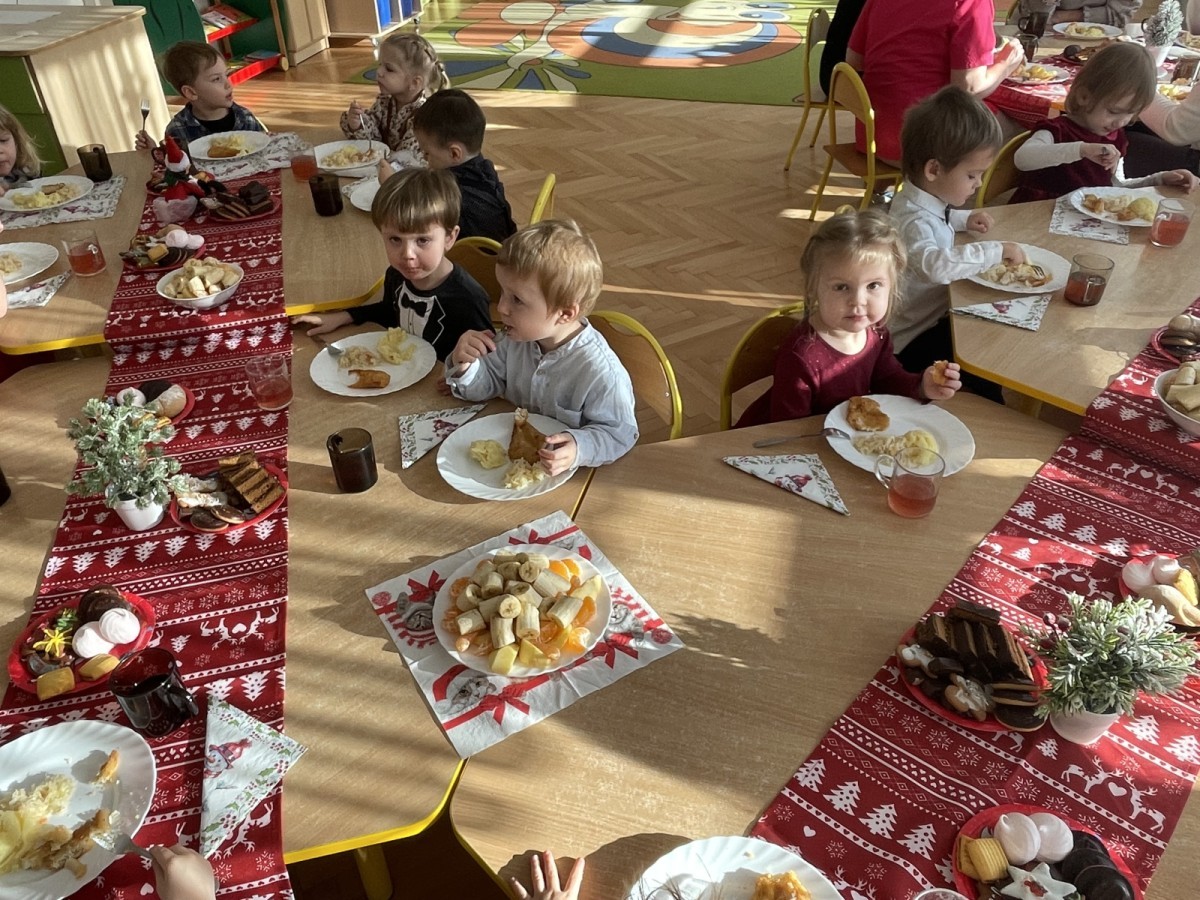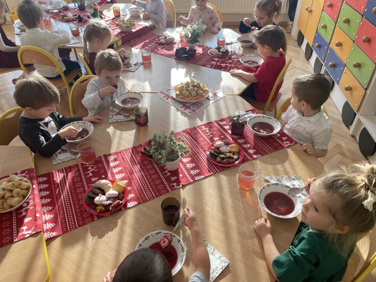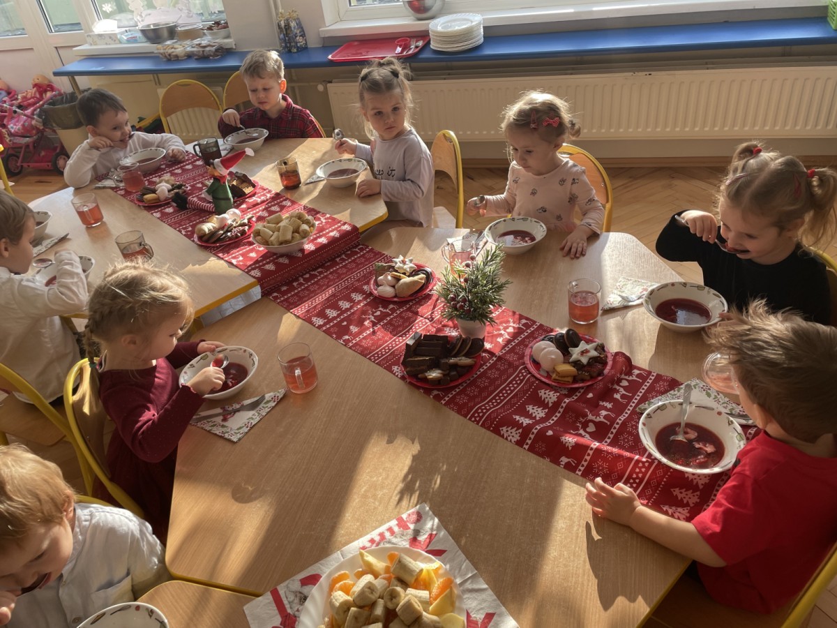 W grupie Kotki odbyła się uroczysta, grupowa wigilia. Dzieci w świątecznej atmosferze składały sobie serdeczne życzenia, dzieliły się opłatkiem oraz wspólnie świętowały przy wigilijnym stole. Spotkanie było pełne radości, ciepła i wzajemnej życzliwości, a wspólne chwile sprzyjały integracji oraz kultywowaniu świątecznych tradycji. 🎄✨