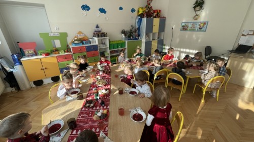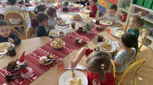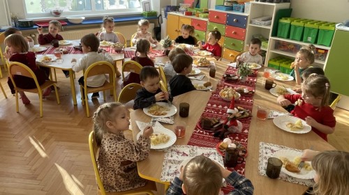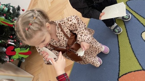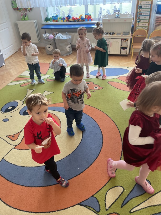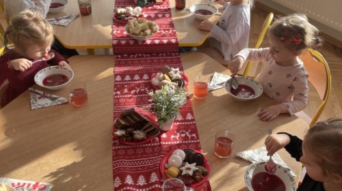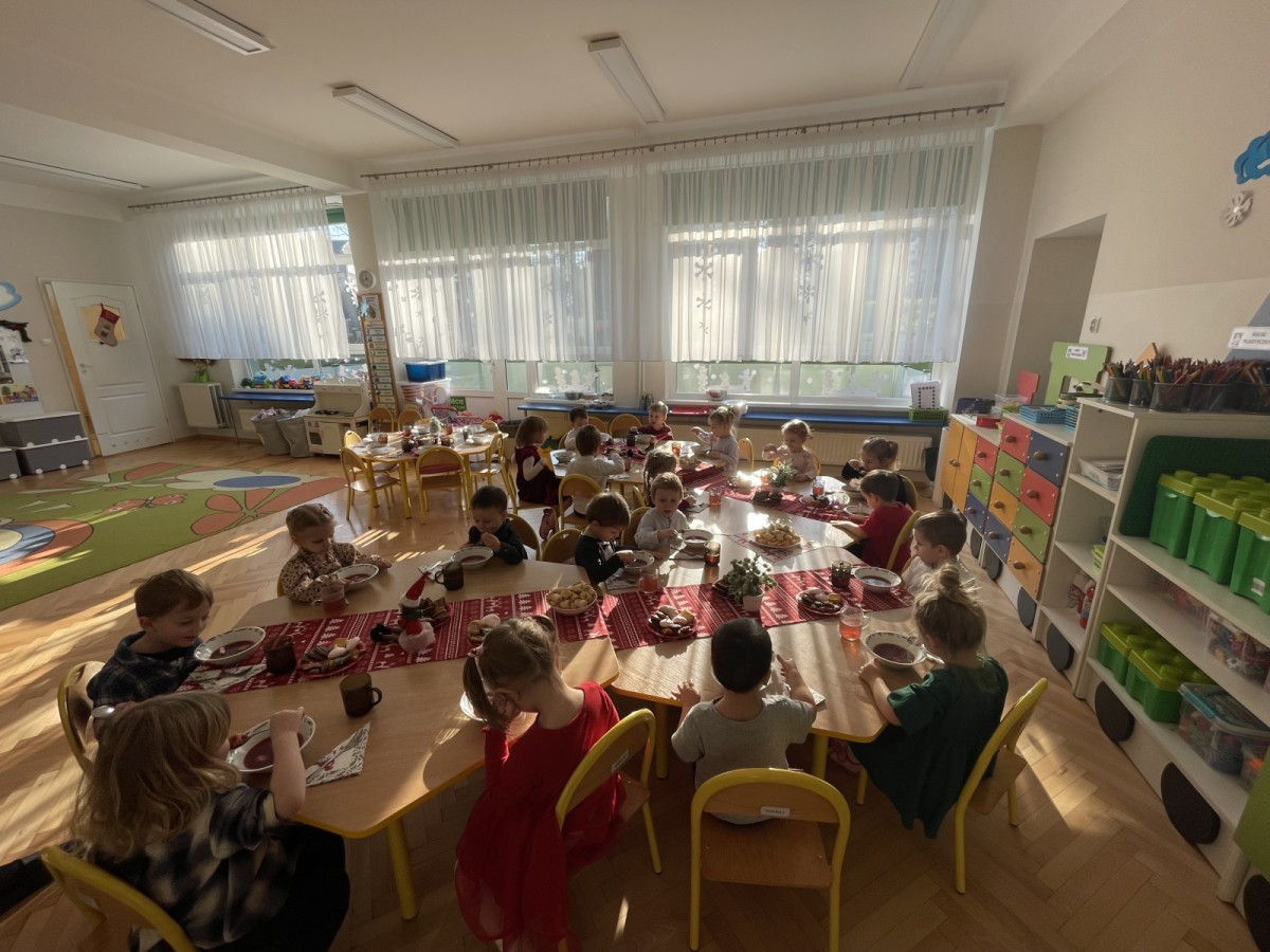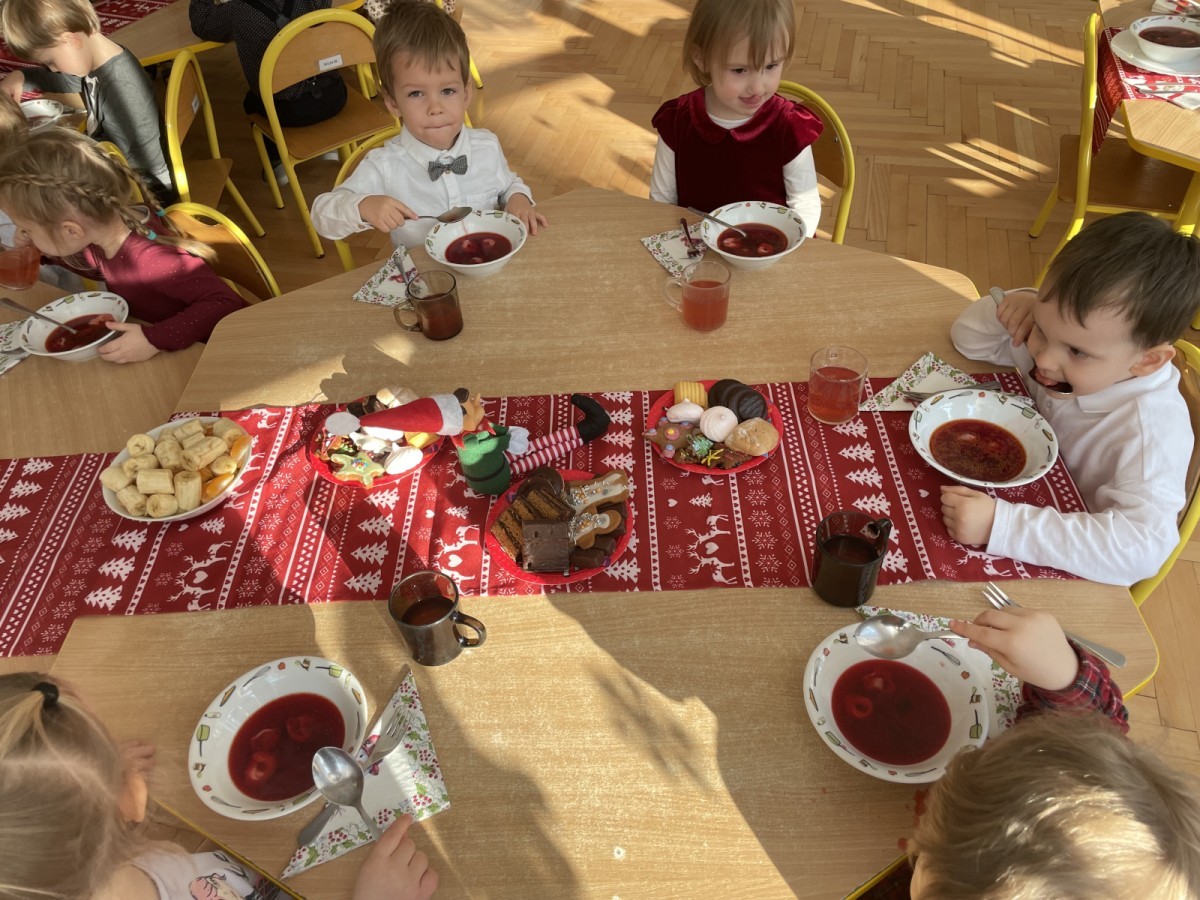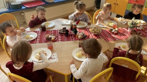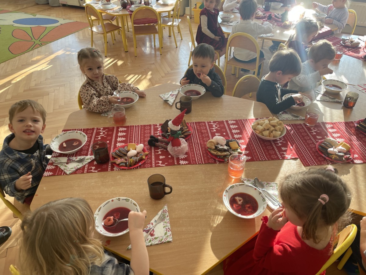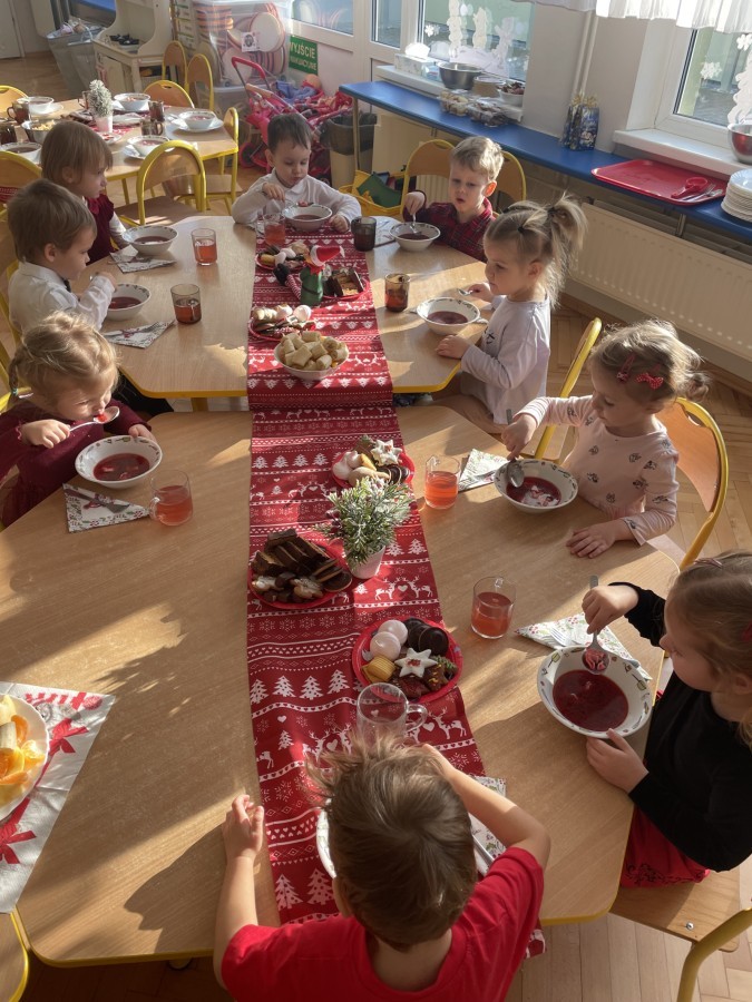 W grupie Kotki odbyła się uroczysta, grupowa wigilia. Dzieci w świątecznej atmosferze składały sobie serdeczne życzenia, dzieliły się opłatkiem oraz wspólnie świętowały przy wigilijnym stole. Spotkanie było pełne radości, ciepła i wzajemnej życzliwości, a wspólne chwile sprzyjały integracji oraz kultywowaniu świątecznych tradycji. 🎄✨