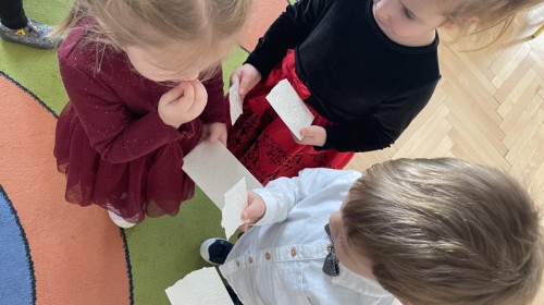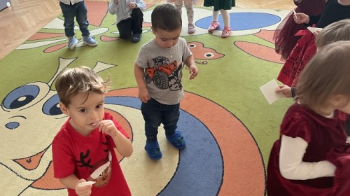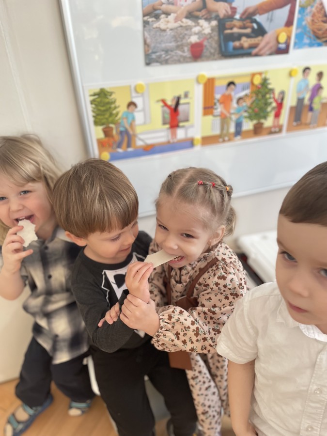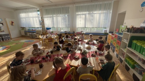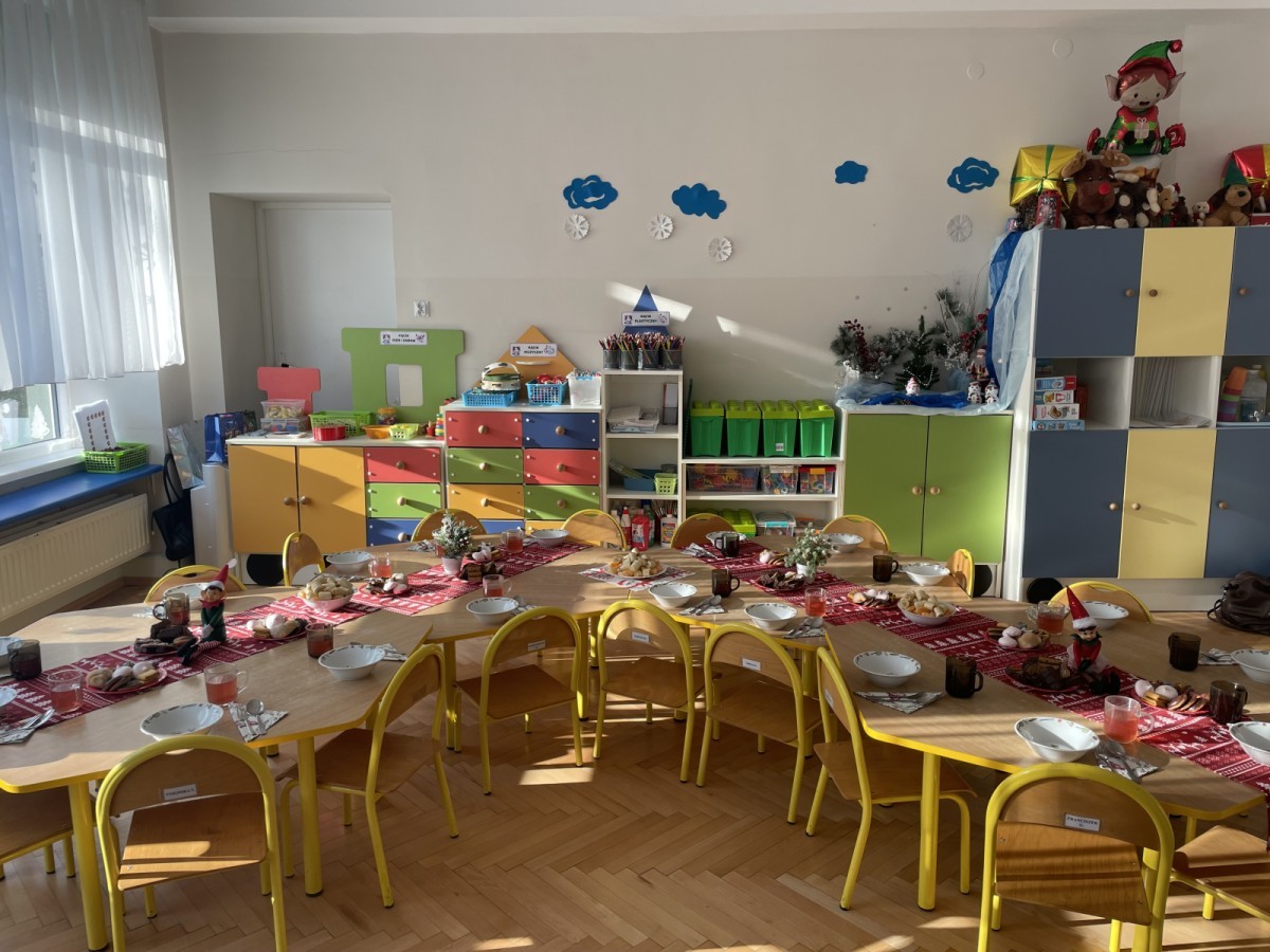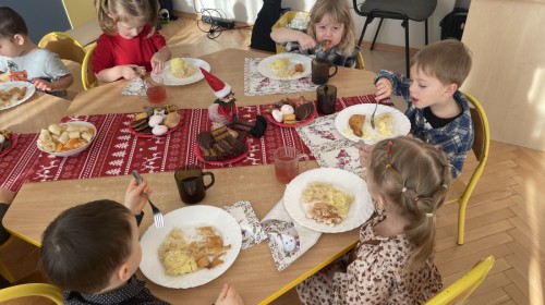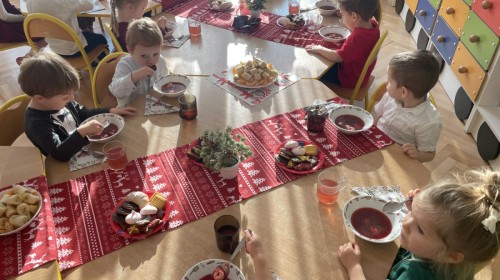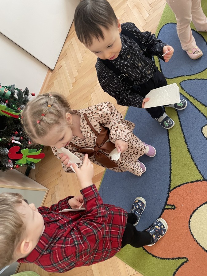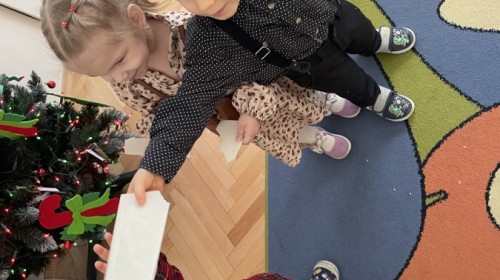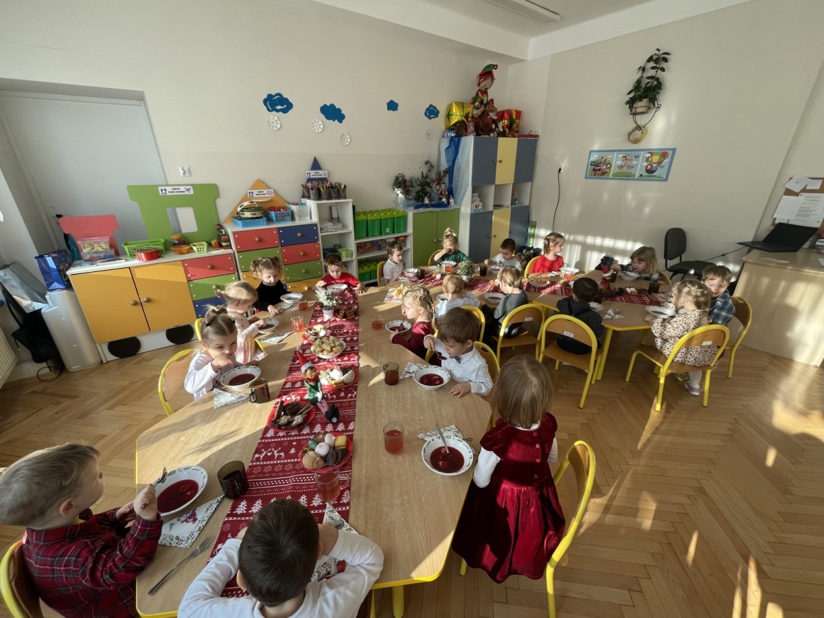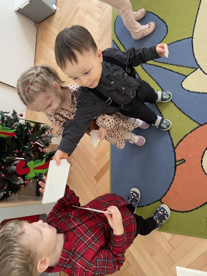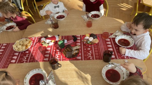 W grupie Kotki odbyła się uroczysta, grupowa wigilia. Dzieci w świątecznej atmosferze składały sobie serdeczne życzenia, dzieliły się opłatkiem oraz wspólnie świętowały przy wigilijnym stole. Spotkanie było pełne radości, ciepła i wzajemnej życzliwości, a wspólne chwile sprzyjały integracji oraz kultywowaniu świątecznych tradycji. 🎄✨